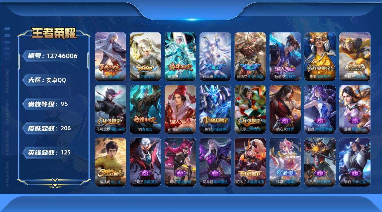[12746006]安卓Q-V5-永恒钻石III段位-124英雄-206皮肤-0典藏-0珍品无双-0无双-0珍品传说-5传说-50史诗 【传说皮肤】:孙尚香异界灵契,诸葛亮时雨天司,镜炽阳神光,孙悟空零号赤焰,李白凤求凰 【限定皮肤】:白起狰,姜子牙天穹之誓,狄仁杰阴阳师,赵云皇家上将,嬴政优雅恋人,嬴政白昼王子,孙尚香异界灵契,鲁班七号狮舞东方,庄周蜃楼王,高渐离玩趣恶龙,孙膑妖精王,芈月重明,吕布猎兽之王,周瑜赤莲之焰,元歌云间偶戏,夏侯惇朔风刀,曹操烛龙,典韦穷奇,典韦蓝屏警告,马可波罗暗影游猎,狄仁杰魔术师,狄仁杰万华元夜,达摩星际陆战队,项羽海滩派对,老夫子醍醐杖,关羽冰锋战神,程咬金演武夺筹,兰陵王驯魔猎人,亚瑟潮玩骑士王,孙悟空至尊宝,孙悟空大圣娶亲,孙悟空零号赤焰,孙悟空孙行者,牛魔御旌,后羿圣弓游侠,李元芳银河之约,钟馗神迹守卫,钟馗驱傩正仪,杨玉环遇见飞天,女娲朔望之晖,干将莫邪真爱魔法,雅典娜单词大作战,蔡文姬繁星吟游,鬼谷子原初探秘者,诸葛亮时雨天司,铠青龙志,苏烈千军破阵,弈星混沌棋,沈梦溪星空之诺,明世隐疑决卦,裴擒虎李小龙,裴擒虎擒涛扼浪,狂铁御狮,米莱狄御霄,云中君纤云弄巧,盾山御銮,猪八戒西部大镖客,上官婉儿梁祝,嫦娥拒霜思,蒙犽狂想玩偶喵,鲁班大师探海日志,桑启海盐诗旅,张良古海寻踪,鬼谷子天穹祈灯,刘邦剑破天穹 【年限皮肤】:铠青龙志,李白凤求凰,诸葛亮时雨天司 【赛季限定】:庄周蜃楼王,孙膑妖精王,白起狰,芈月重明,夏侯惇朔风刀,曹操烛龙,典韦穷奇,狄仁杰万华元夜,老夫子醍醐杖,程咬金演武夺筹,张良古海寻踪,牛魔御旌,钟馗驱傩正仪,鬼谷子原初探秘者,苏烈千军破阵,弈星混沌棋,明世隐疑决卦,裴擒虎擒涛扼浪,狂铁御狮,米莱狄御霄,盾山御銮,鲁班大师探海日志,桑启海盐诗旅,鬼谷子天穹祈灯,刘邦剑破天穹,姜子牙天穹之誓 【战令限定】:嬴政白昼王子,鲁班七号狮舞东方,吕布猎兽之王,周瑜赤莲之焰,元歌云间偶戏,典韦蓝屏警告,马可波罗暗影游猎,达摩星际陆战队,兰陵王驯魔猎人,亚瑟潮玩骑士王,后羿圣弓游侠,李元芳银河之约,钟馗神迹守卫,女娲朔望之晖,干将莫邪真爱魔法,雅典娜单词大作战,沈梦溪星空之诺,猪八戒西部大镖客,蒙犽狂想玩偶喵 【史诗皮肤】:项羽苍穹之光,露娜紫霞仙子,阿轲暗夜猫娘,赵云皇家上将,貂蝉圣诞恋歌,甄姬冰雪圆舞曲,王昭君偶像歌手,狄仁杰魔术师