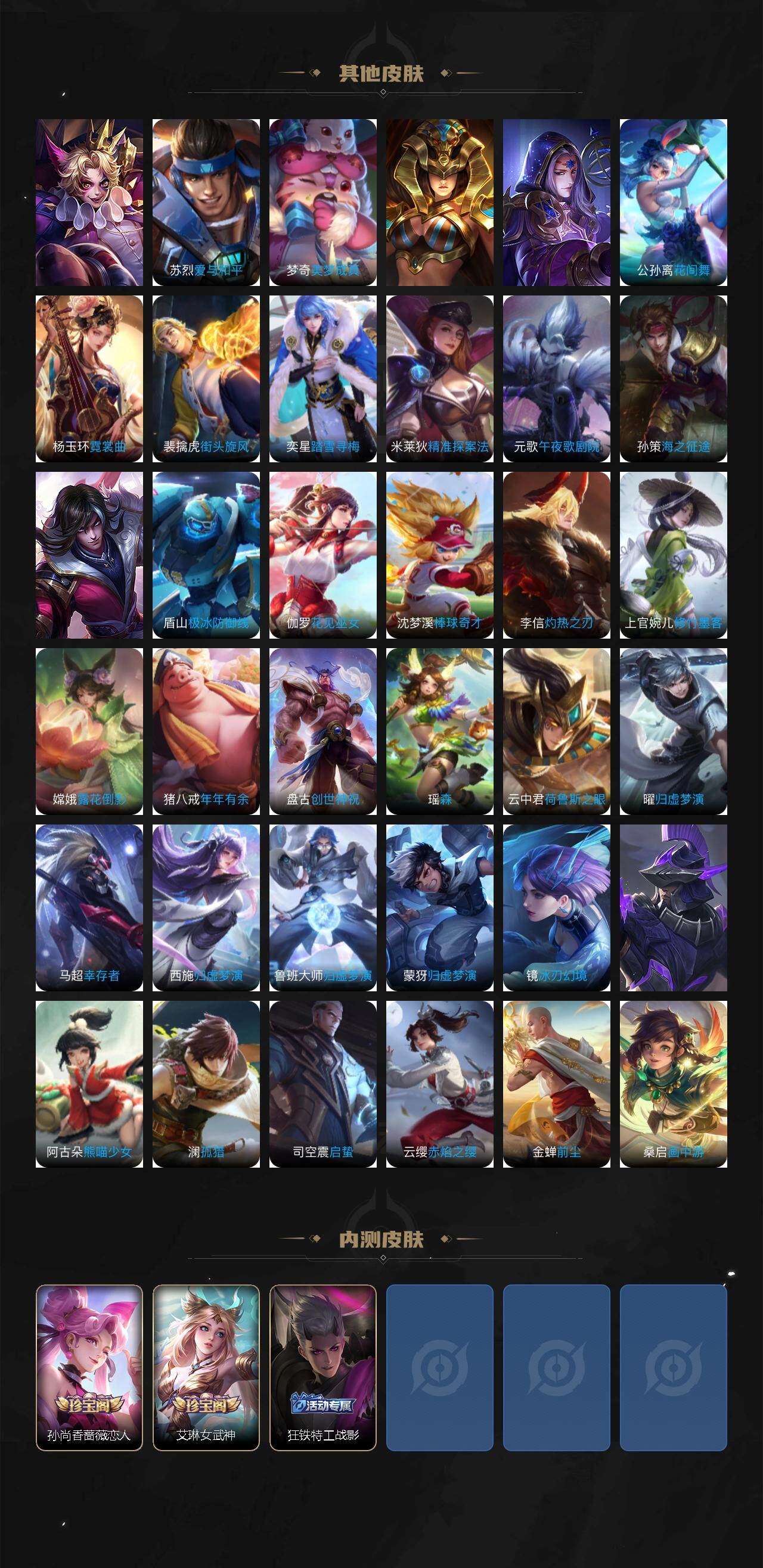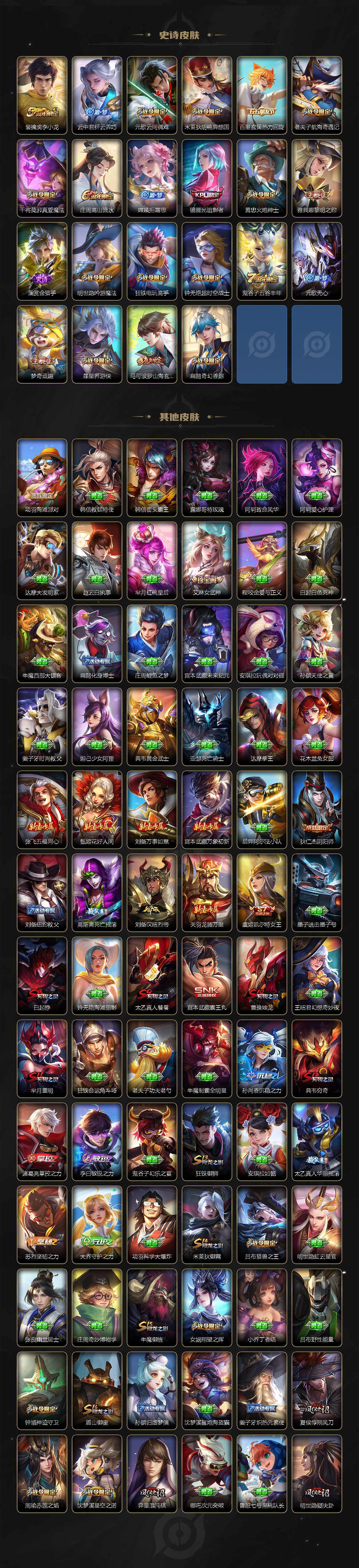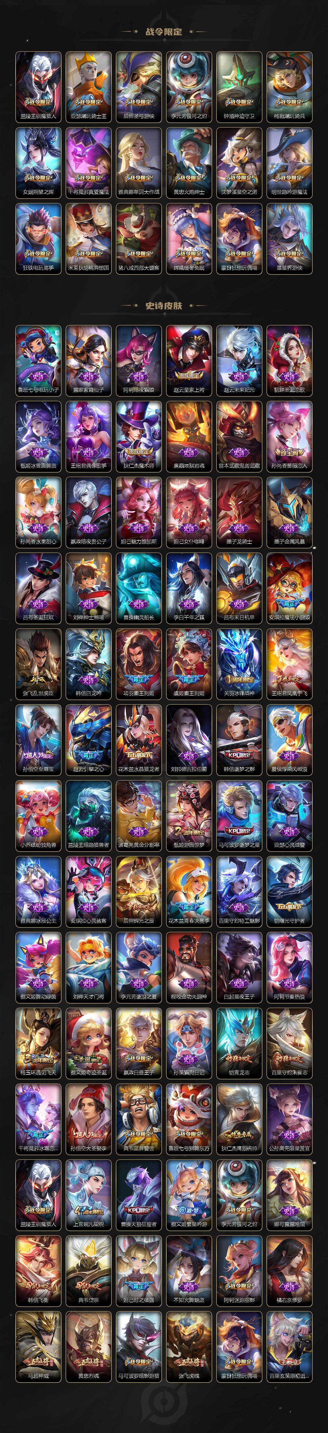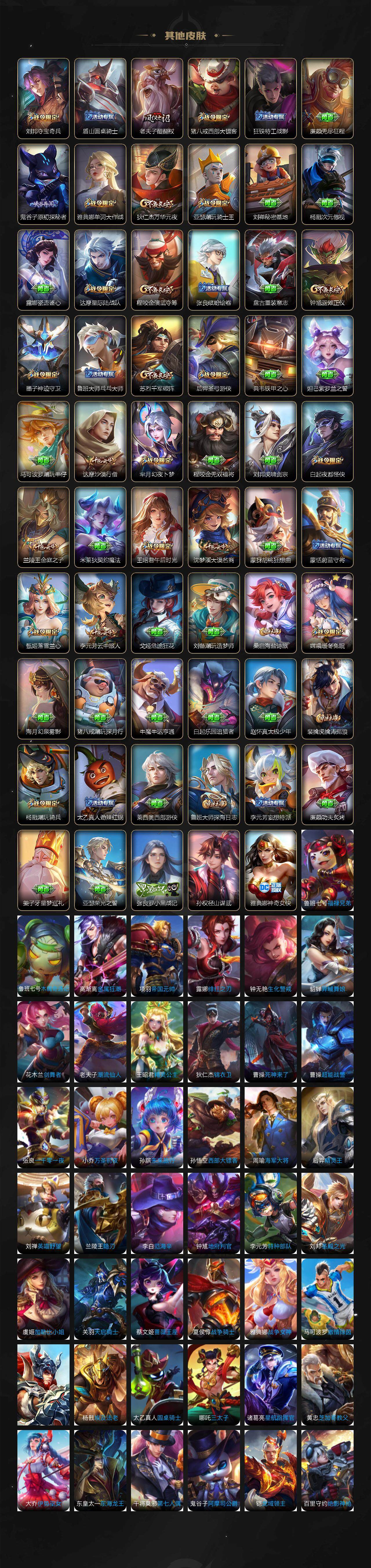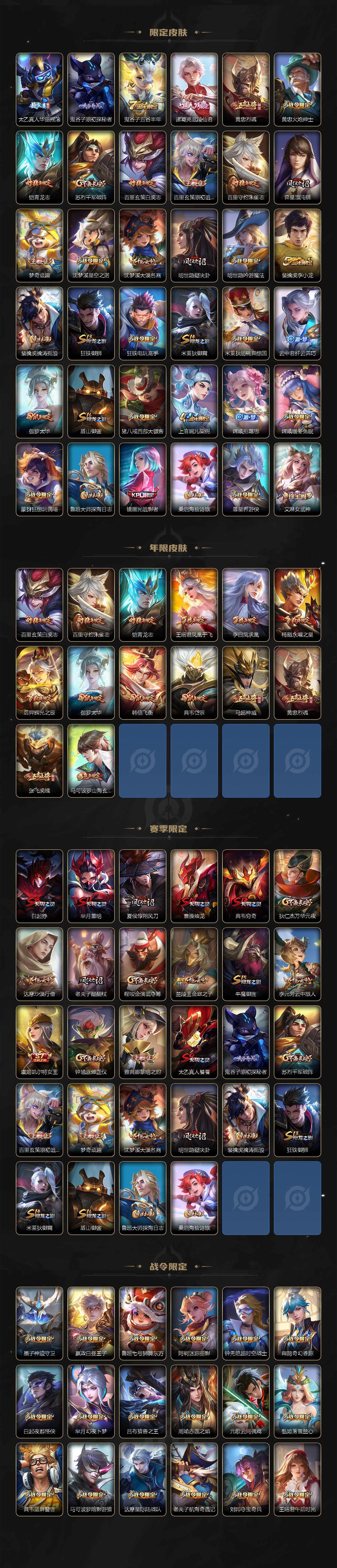 【限定皮肤】:白起狰,狄仁杰阴阳师,虞姬凯尔特女王,赵云皇家上将,赵云引擎之心,墨子神迹守卫,妲己时之彼端,嬴政白昼王子,孙尚香蔷薇恋人,鲁班七号狮舞东方,庄周高山流水,高渐离死亡摇滚,阿轲迷踪丽影,钟无艳超时空战士,扁鹊奇幻香踪,白起夜都怪侠,芈月重明,芈月幻夜卜梦,吕布天魔缭乱,吕布猎兽之王,周瑜赤莲之焰,元歌云间偶戏,元歌无心,夏侯惇朔风刀,甄姬游园惊梦,甄姬落雪兰心,曹操烛龙,曹操天狼征服者,典韦穷奇,典韦蓝屏警告,典韦岱宗,马可波罗逐梦之星,马可波罗暗影游猎,马可波罗山海玄木吟,狄仁杰魔术师,狄仁杰万华元夜,达摩星际陆战队,达摩沙漠行僧,项羽海滩派对,项羽霸王别姬,项羽无限倾心,老夫子醍醐杖,老夫子航海奇遇记,关羽冰锋战神,安琪拉魔法小厨娘,程咬金演武夺筹,刘邦夺宝奇兵,韩信逐梦之影,韩信飞衡,王昭君凤凰于飞,王昭君午后时光,兰陵王驯魔猎人,兰陵王金庭之子,花木兰青春决赛季,亚瑟潮玩骑士王,孙悟空至尊宝,孙悟空大圣娶亲,牛魔御旌,后羿辉光之辰,后羿圣弓游侠,张飞虎魄,李元芳银河之约,李元芳云中旅人,虞姬霸王别姬,虞姬启明星使,钟馗神迹守卫,钟馗驱傩正仪,杨玉环遇见飞天,杨戬永曜之星,杨戬潮玩骑兵,女娲朔望之晖,干将莫邪冰霜恋舞曲,干将莫邪真爱魔法,雅典娜单词大作战,雅典娜黎明之约,蔡文姬奇迹圣诞,蔡文姬繁星吟游,太乙真人饕餮,太乙真人华丽摇滚,鬼谷子原初探秘者,鬼谷子五谷丰年,诸葛亮武陵仙君,黄忠烈魂,黄忠火炮绅士,铠青龙志,苏烈千军破阵,百里玄策白虎志,百里玄策原初追逐者,百里守约朱雀志,弈星混沌棋,梦奇顽趣,沈梦溪星空之诺,沈梦溪大漠名商,明世隐疑决卦,明世隐吟游魔法,裴擒虎李小龙,裴擒虎擒涛扼浪,狂铁御狮,狂铁电玩高手,米莱狄御霄,米莱狄胡桃异想国,云中君纤云弄巧,伽罗太华,盾山御銮,猪八戒西部大镖客,上官婉儿梁祝,嫦