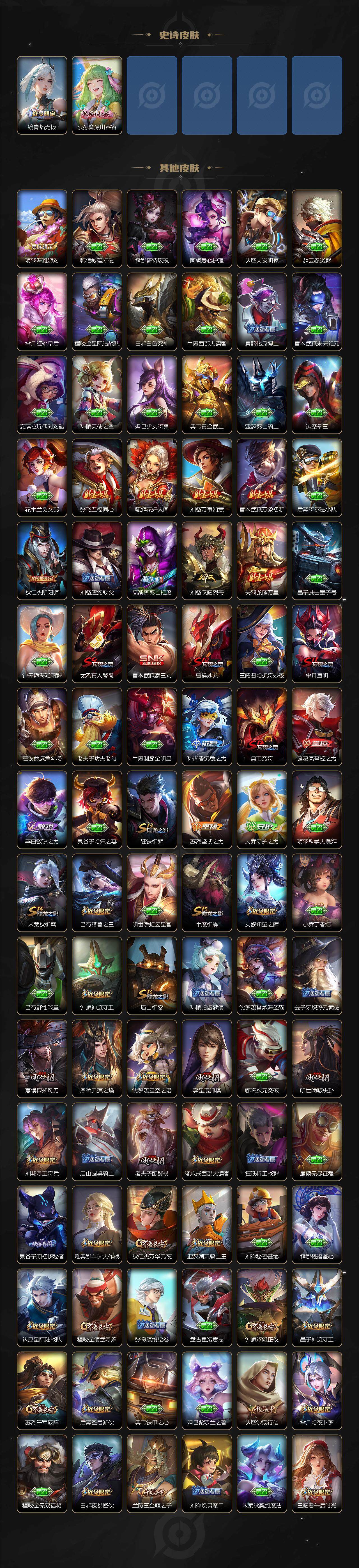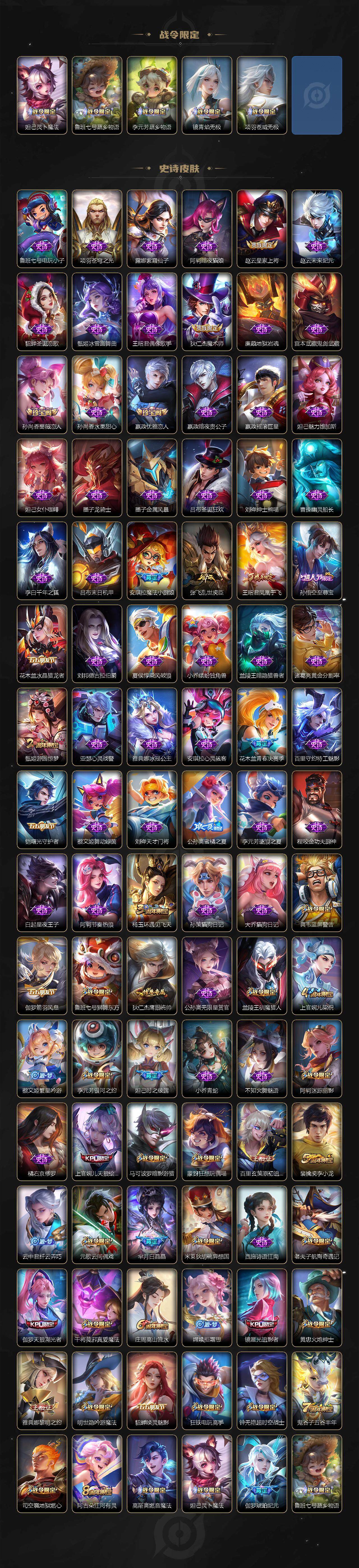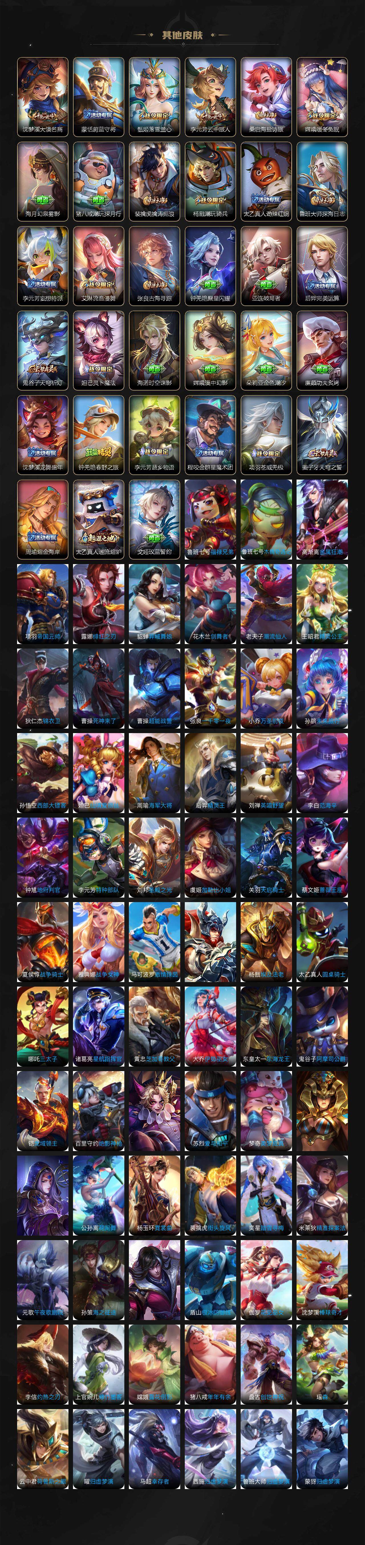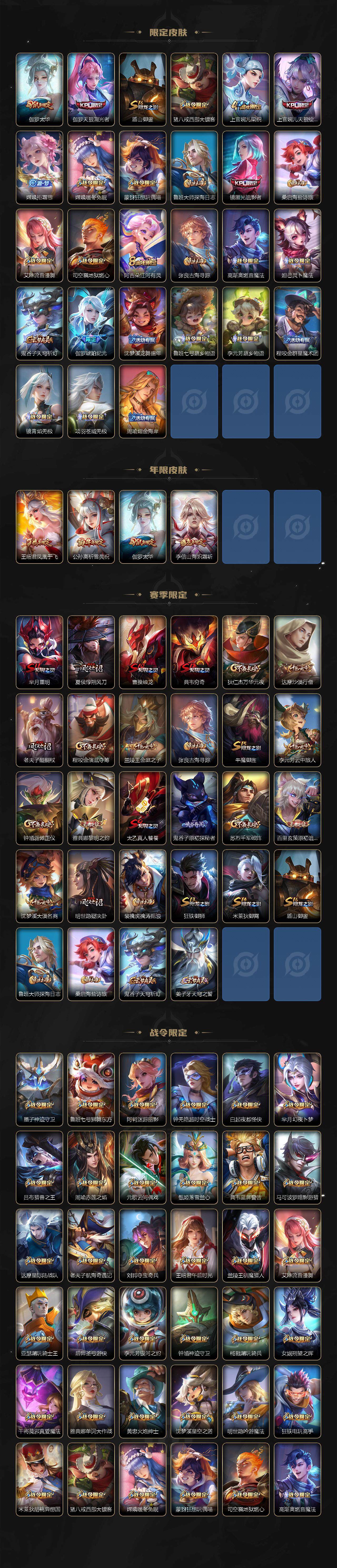 【限定皮肤】:姜子牙天穹之誓,狄仁杰阴阳师,赵云皇家上将,墨子神迹守卫,妲己时之彼端,嬴政优雅恋人,孙尚香蔷薇恋人,鲁班七号狮舞东方,庄周高山流水,高渐离死亡摇滚,阿轲迷踪丽影,钟无艳超时空战士,白起夜都怪侠,芈月重明,芈月白晶晶,芈月幻夜卜梦,吕布猎兽之王,周瑜赤莲之焰,元歌云间偶戏,夏侯惇朔风刀,甄姬游园惊梦,甄姬落雪兰心,曹操烛龙,典韦穷奇,典韦蓝屏警告,马可波罗暗影游猎,狄仁杰魔术师,狄仁杰万华元夜,达摩星际陆战队,达摩沙漠行僧,项羽海滩派对,老夫子醍醐杖,老夫子航海奇遇记,安琪拉魔法小厨娘,程咬金演武夺筹,刘邦夺宝奇兵,王昭君凤凰于飞,王昭君午后时光,兰陵王驯魔猎人,兰陵王金庭之子,花木兰青春决赛季,亚瑟潮玩骑士王,孙悟空至尊宝,牛魔御旌,后羿圣弓游侠,李元芳银河之约,李元芳云中旅人,虞姬启明星使,钟馗神迹守卫,钟馗驱傩正仪,杨玉环遇见飞天,杨戬潮玩骑兵,女娲朔望之晖,干将莫邪真爱魔法,雅典娜单词大作战,雅典娜黎明之约,蔡文姬繁星吟游,太乙真人饕餮,鬼谷子原初探秘者,鬼谷子五谷丰年,黄忠火炮绅士,苏烈千军破阵,百里玄策原初追逐者,弈星混沌棋,公孙离蜜橘之夏,公孙离祈雪灵祝,沈梦溪星空之诺,沈梦溪大漠名商,明世隐疑决卦,明世隐吟游魔法,裴擒虎李小龙,裴擒虎擒涛扼浪,狂铁御狮,狂铁电玩高手,米莱狄御霄,米莱狄胡桃异想国,云中君纤云弄巧,李信山海炽霜斩,伽罗太华,伽罗天狼溯光者,盾山御銮,猪八戒西部大镖客,上官婉儿梁祝,上官婉儿天狼绘梦者,嫦娥拒霜思,嫦娥暖冬兔眠,蒙犽狂想玩偶喵,鲁班大师探海日志,镜匿光追影者,桑启海盐诗旅,艾琳流音漫舞,司空震地狱燃心,阿古朵江河有灵,张良古海寻踪,高渐离燃音魔法,妲己灵卜魔法,鬼谷子天穹祈灯,伽罗琥珀纪元,沈梦溪龙舞盛年,鲁班七号蔬乡物语,李元芳蔬乡物语,程咬金群星魔术团,镜青焰无极,项羽苍威无极,周瑜熔金海岸