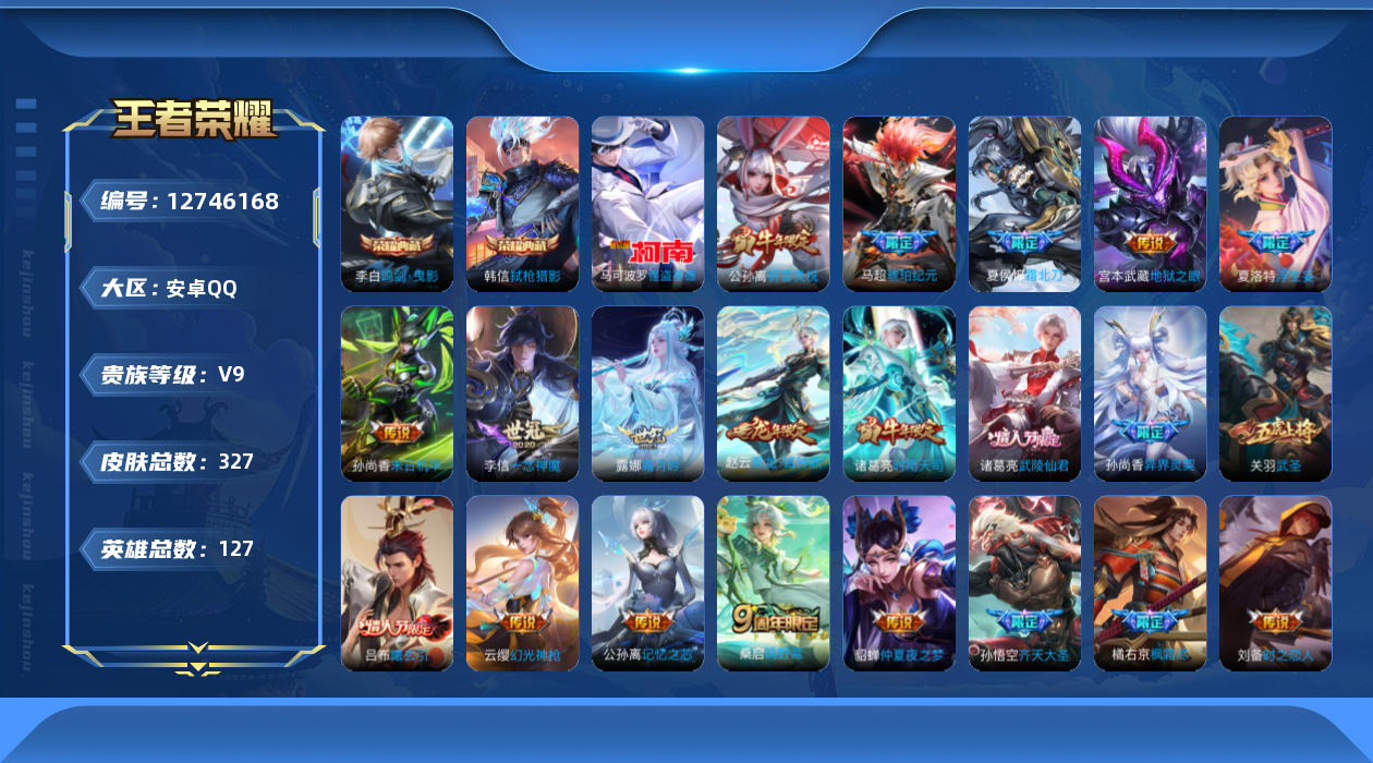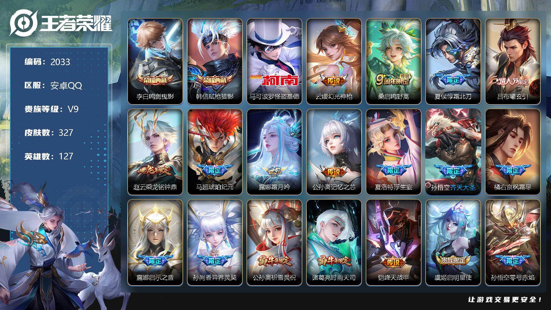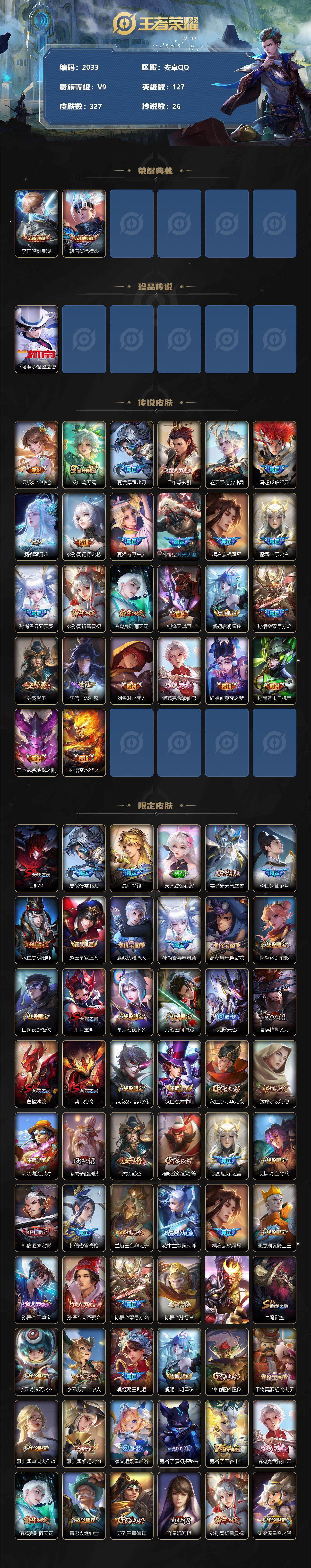 [12746168]安卓Q-V9-至尊星耀I段位-127英雄-327皮肤-2典藏-0珍品无双-0无双-1珍品传说-26传说-90史诗
