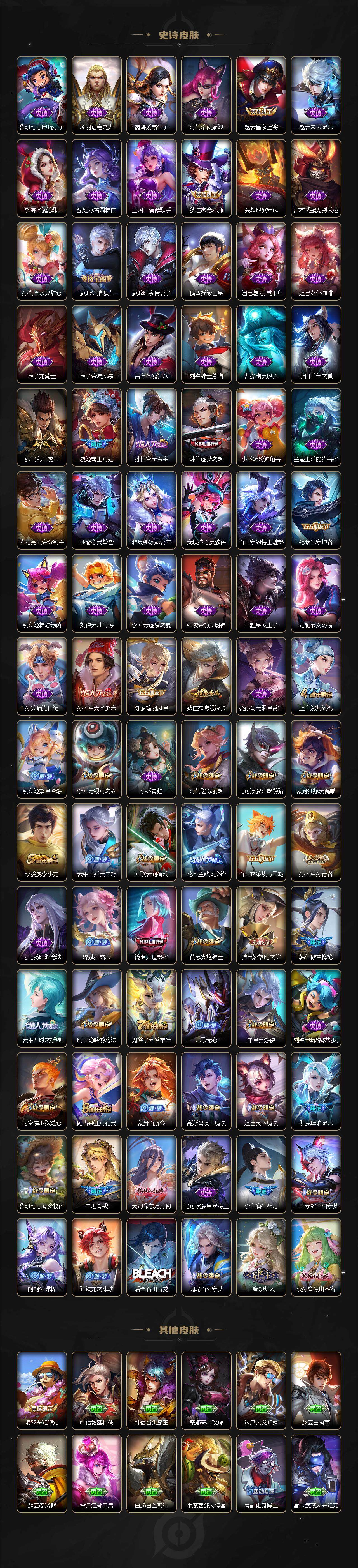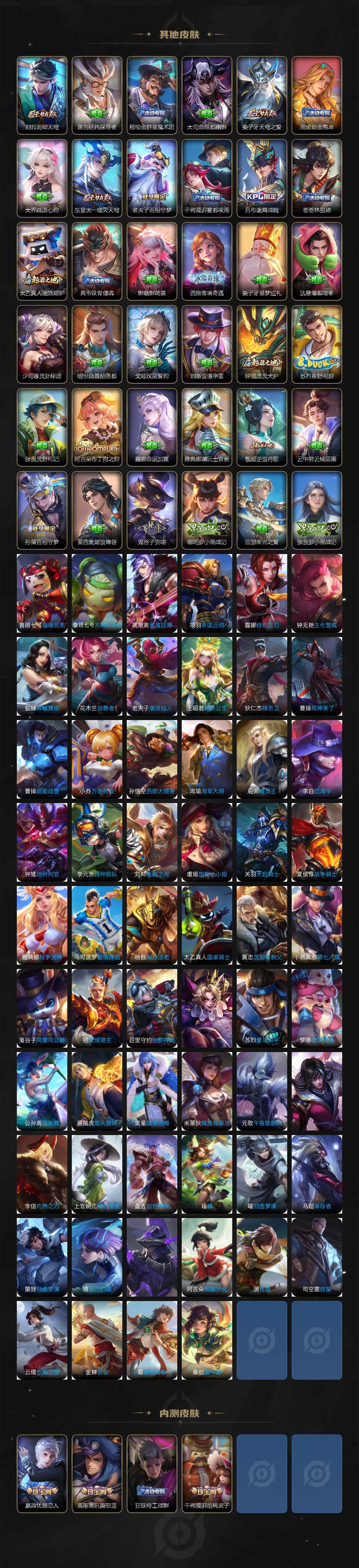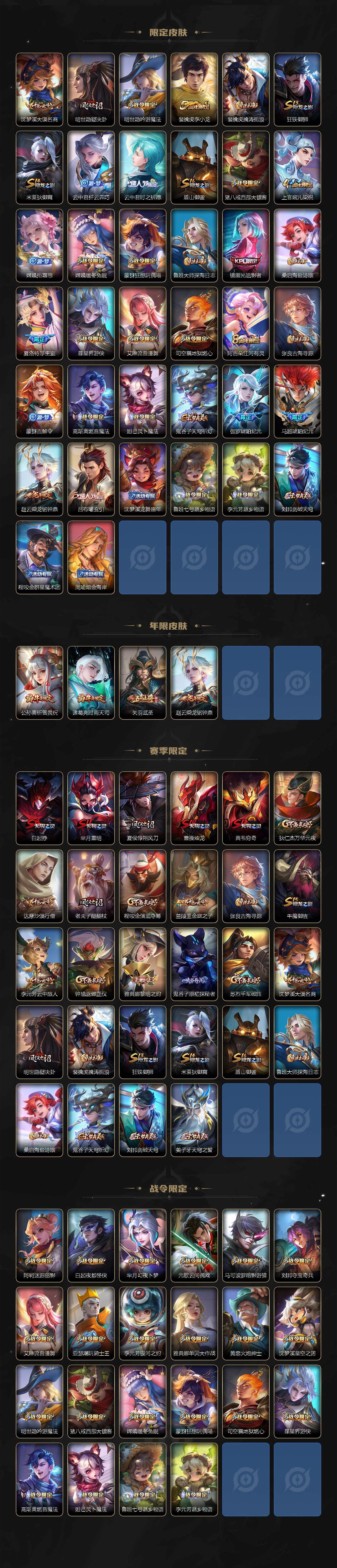 【限定皮肤】:白起狰,夏侯惇霜北刀,暃埋骨钱,大乔绒语心约,姜子牙天穹之誓,李白谪仙醉月,狄仁杰阴阳师,赵云皇家上将,嬴政优雅恋人,孙尚香异界灵契,高渐离玩趣恶龙,阿轲迷踪丽影,白起夜都怪侠,芈月重明,芈月幻夜卜梦,元歌云间偶戏,元歌无心,夏侯惇朔风刀,曹操烛龙,典韦穷奇,马可波罗暗影游猎,狄仁杰魔术师,狄仁杰万华元夜,达摩沙漠行僧,项羽海滩派对,老夫子醍醐杖,关羽武圣,程咬金演武夺筹,露娜启示之音,刘邦夺宝奇兵,韩信逐梦之影,韩信傲雪梅枪,兰陵王金庭之子,花木兰默契交锋,橘右京枫霜尽,亚瑟潮玩骑士王,孙悟空至尊宝,孙悟空大圣娶亲,孙悟空零号赤焰,孙悟空孙行者,孙悟空齐天大圣,牛魔御旌,李元芳银河之约,李元芳云中旅人,虞姬霸王别姬,虞姬启明星使,钟馗驱傩正仪,干将莫邪胡桃夹子,雅典娜单词大作战,雅典娜黎明之约,蔡文姬繁星吟游,鬼谷子原初探秘者,鬼谷子五谷丰年,诸葛亮武陵仙君,诸葛亮时雨天司,黄忠火炮绅士,苏烈千军破阵,弈星混沌棋,公孙离祈雪灵祝,沈梦溪星空之诺,沈梦溪大漠名商,明世隐疑决卦,明世隐吟游魔法,裴擒虎李小龙,裴擒虎擒涛扼浪,狂铁御狮,米莱狄御霄,云中君纤云弄巧,云中君时之祈愿,盾山御銮,猪八戒西部大镖客,上官婉儿梁祝,嫦娥拒霜思,嫦娥暖冬兔眠,蒙犽狂想玩偶喵,鲁班大师探海日志,镜匿光追影者,桑启海盐诗旅,夏洛特浮生妄,暃星界游侠,艾琳流音漫舞,司空震地狱燃心,阿古朵江河有灵,张良古海寻踪,蒙犽百解令,高渐离燃音魔法,妲己灵卜魔法,鬼谷子天穹祈灯,伽罗琥珀纪元,马超琥珀纪元,赵云乘龙铭钟鼎,吕布曦玄引,沈梦溪龙舞盛年,鲁班七号蔬乡物语,李元芳蔬乡物语,刘