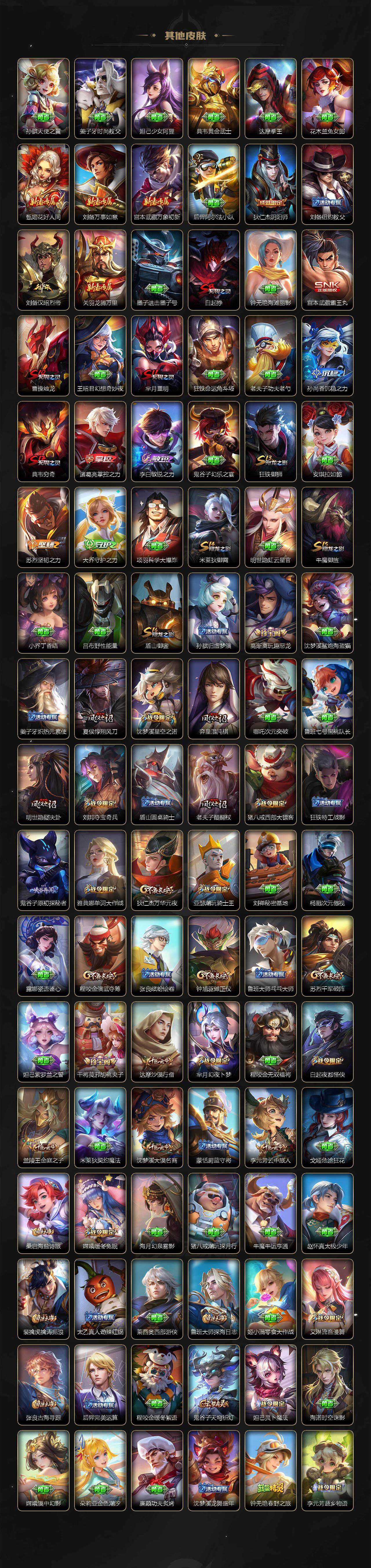 小乔青蛇,伽罗箭羽风息,李元芳逐浪之夏,公孙离无限星赏官,孙策猫狗日记,阿轲节奏热浪,露娜紫霞仙子,诸葛亮黄金分割率,王昭君偶像歌手,项羽苍穹之光,阿轲暗夜猫娘,雅典娜冰冠公主,鲁班七号电玩小子,墨子龙骑士,嬴政摇滚巨星,刘禅绅士熊喵,刘禅天才门将,白起星夜王子,安琪拉心灵骇客,程咬金功夫厨神,兰陵王暗隐猎兽者,曹操幽灵船长,宫本武藏鬼剑武藏,司马懿暗渊魔法,亚瑟心灵战警,蔡文姬舞动绿茵,廉颇地狱岩魂,小乔缤纷独角兽,铠曙光守护者,百里玄策热力回旋,墨子金属风暴,吕布圣诞狂欢,貂蝉圣诞恋歌,百里守约特工魅影,嬴政暗夜贵公子,嫦娥拒霜思,雅典娜黎明之约,李白千年之狐,刘禅电玩·爆裂旋风,蒙犽百解令,高渐离燃音魔法,伽罗琥珀纪元,李白谪仙醉月