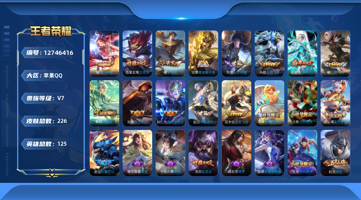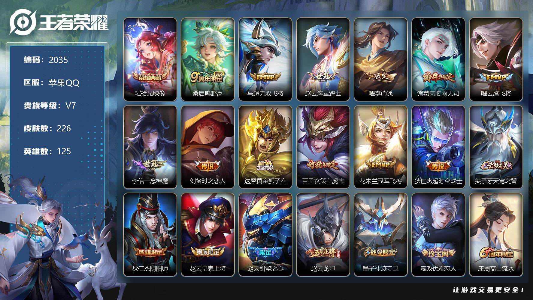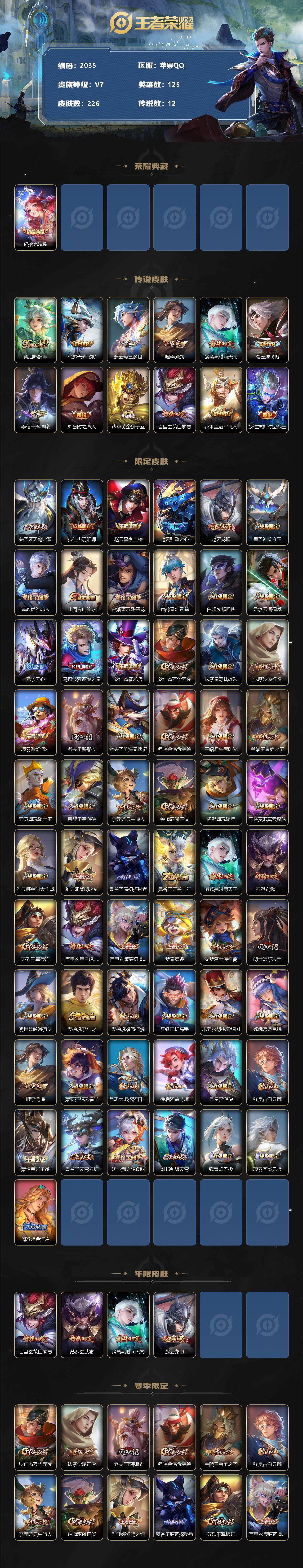 [12746416]苹果Q-V7-永恒钻石II段位-125英雄-226皮肤-1典藏-0珍品无双-0无双-0珍品传说-12传说-60史诗