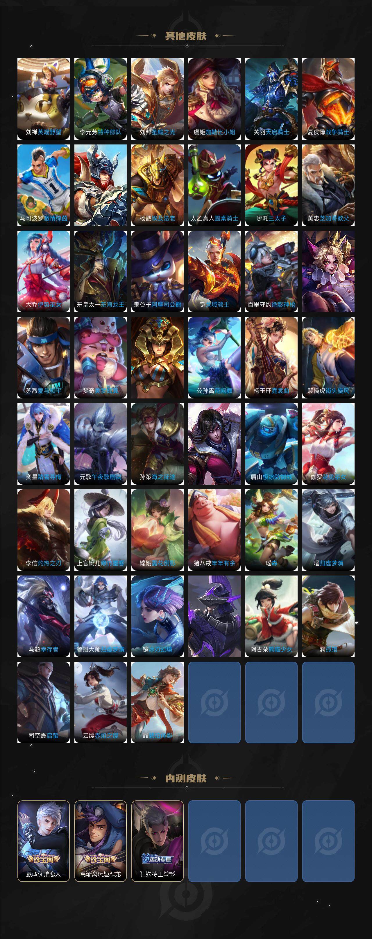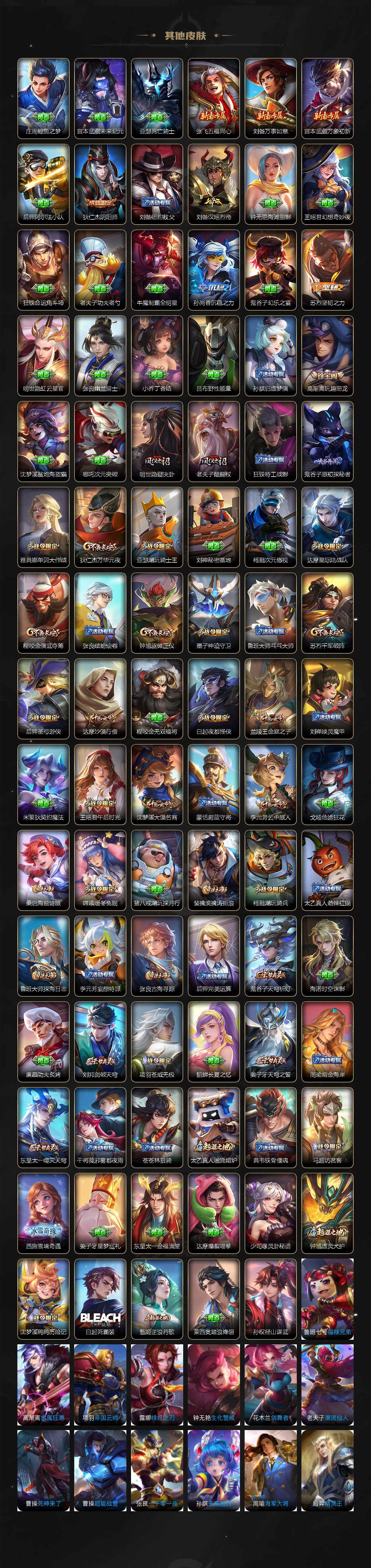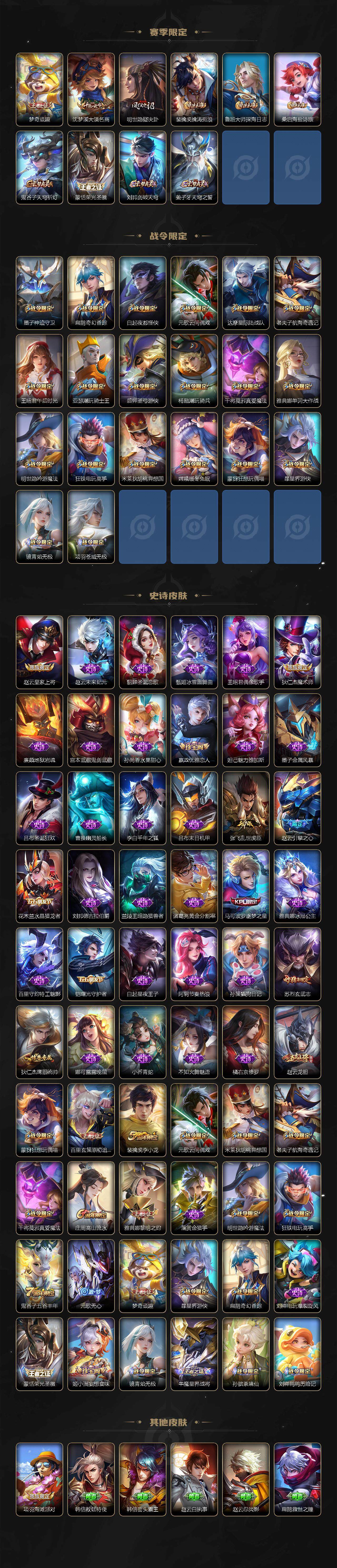 【限定皮肤】:姜子牙天穹之誓,狄仁杰阴阳师,赵云皇家上将,赵云引擎之心,赵云龙胆,墨子神迹守卫,嬴政优雅恋人,庄周高山流水,高渐离玩趣恶龙,扁鹊奇幻香踪,白起夜都怪侠,元歌云间偶戏,元歌无心,马可波罗逐梦之星,狄仁杰魔术师,狄仁杰万华元夜,达摩星际陆战队,达摩沙漠行僧,项羽海滩派对,老夫子醍醐杖,老夫子航海奇遇记,程咬金演武夺筹,王昭君午后时光,兰陵王金庭之子,亚瑟潮玩骑士王,后羿圣弓游侠,李元芳云中旅人,钟馗驱傩正仪,杨戬潮玩骑兵,干将莫邪真爱魔法,雅典娜单词大作战,雅典娜黎明之约,鬼谷子原初探秘者,鬼谷子五谷丰年,诸葛亮时雨天司,苏烈玄武志,苏烈千军破阵,百里玄策白虎志,百里玄策原初追逐者,梦奇顽趣,沈梦溪大漠名商,明世隐疑决卦,明世隐吟游魔法,裴擒虎李小龙,裴擒虎擒涛扼浪,狂铁电玩高手,米莱狄胡桃异想国,嫦娥暖冬兔眠,曜李逍遥 ,蒙犽狂想玩偶喵,鲁班大师探海日志,桑启海盐诗旅,暃星界游侠,张良古海寻踪,蒙恬荣光圣徽,鬼谷子天穹祈灯,姬小满妄想食味,刘邦剑破天穹,镜青焰无极,项羽苍威无极,周瑜熔金海岸