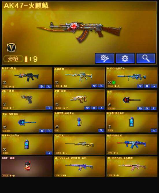 【英雄级武器】:M200-竞技荣光,擎天-竞技荣光,高爆手雷-竞技荣光,烟雾弹-竞技荣光,闪光弹-竞技荣光,USP-雷暴,M4A1-黑龙,AK47-火麒麟,沙鹰-天神,擎天