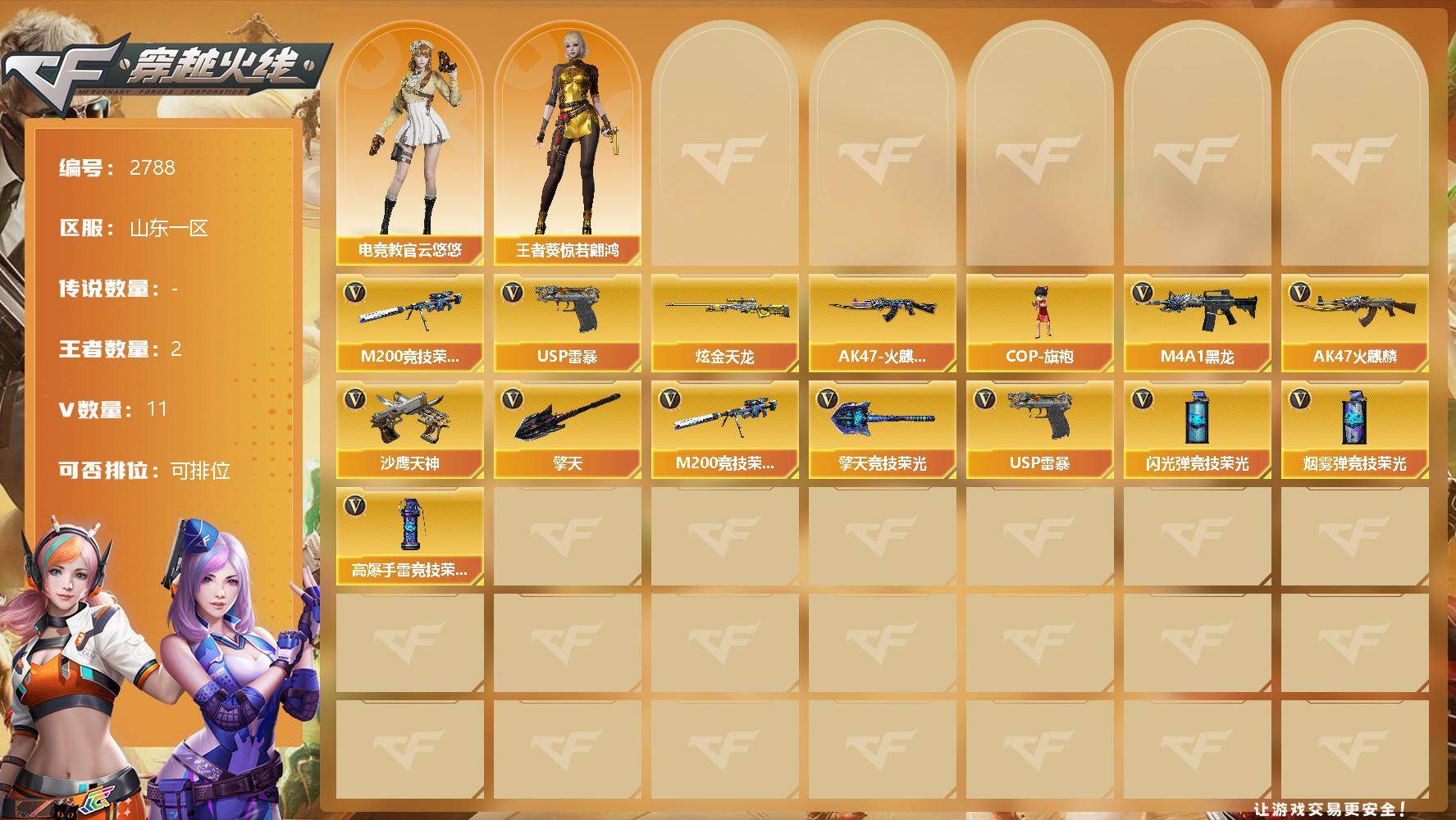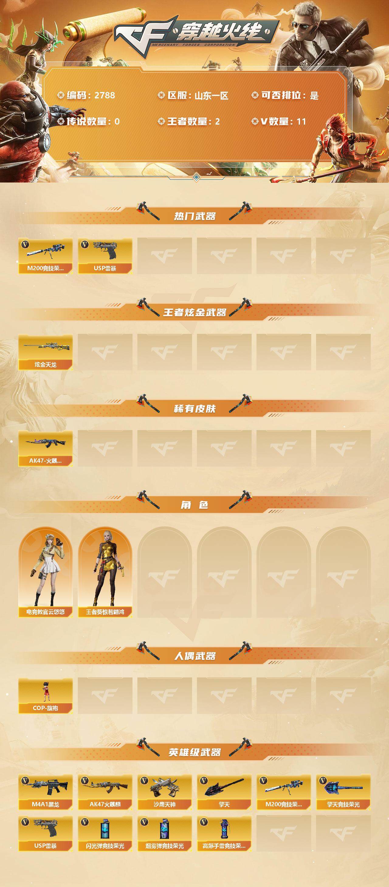 [12746591]山东一区-11V-2王者-1炫金 【热门武器】:M200-竞技荣光,USP-雷暴 【王者炫金武器】:炫金天龙 【稀有皮肤】:AK47-火麒麟-传奇EVEN 【角色】:王者葵-惊若翩鸿,电竞教官-云悠悠 【人偶武器】:COP-旗袍 【英雄级武器】:M200-竞技荣光,擎天-竞技荣光,高爆手雷-竞技荣光,烟雾弹-竞技荣光,闪光弹-竞技荣光,USP-雷暴,M4A1-黑龙,AK47-火麒麟,沙鹰-天神,擎天 【特殊枪械】: