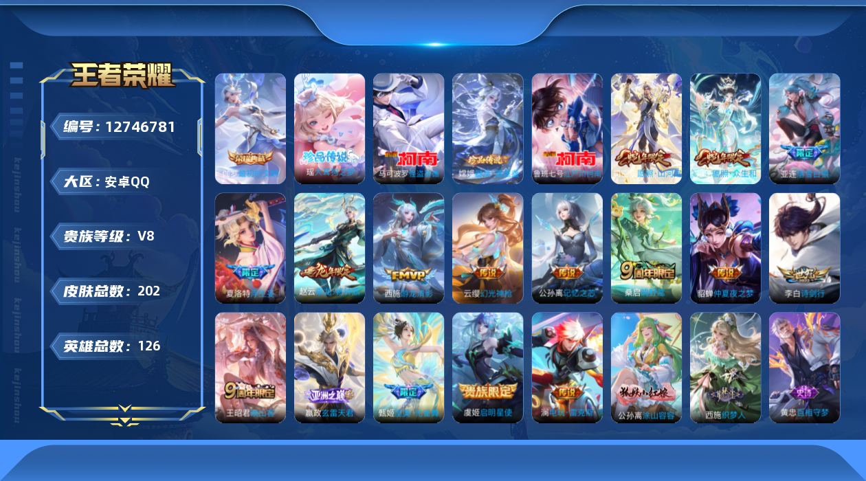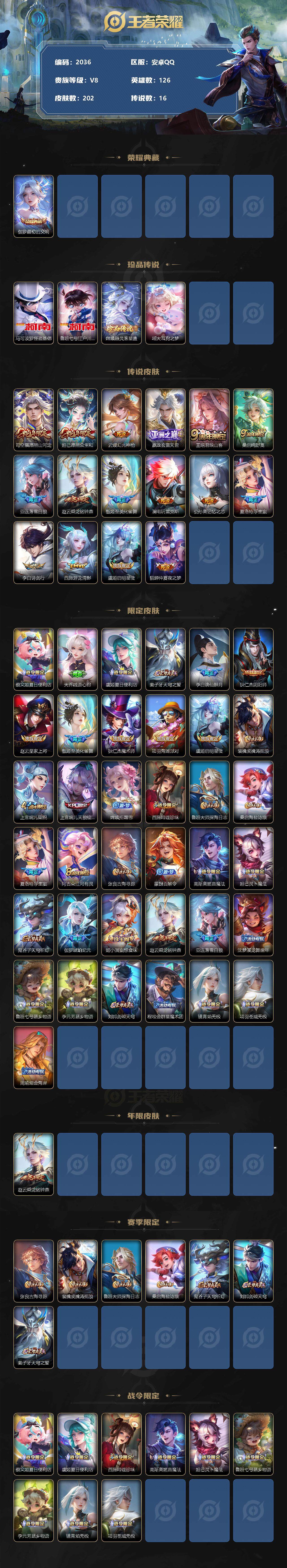 [12746781]安卓Q-V8-至尊星耀V段位-126英雄-202皮肤-1典藏-0珍品无双-0无双-4珍品传说-16传说-72史诗