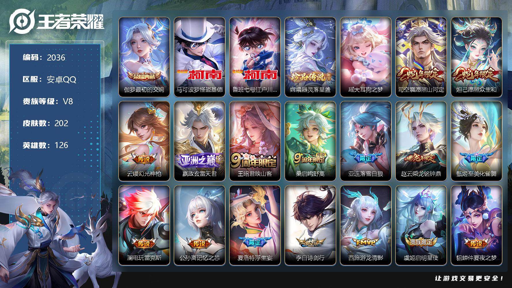 [12746781]安卓Q-V8-至尊星耀V段位-126英雄-202皮肤-1典藏-0珍品无双-0无双-4珍品传说-16传说-72史诗 【英雄全皮】:孙权全皮,影全皮 【荣耀典藏】:伽罗最初的交响 【珍品传说】:马可波罗怪盗基德,鲁班七号江户川柯南,嫦娥器灵落星盏,瑶大耳狗之梦 【传说皮肤】:司空震愿照山河定,妲己愿照众生和,云缨幻光神枪,嬴政玄雷天君,王昭君映山客,桑启鸣野蒿,亚连落雪白狼,赵云乘龙铭钟鼎,甄姬至美化雀舞,澜电玩雷克斯,公孙离记忆之芯,夏洛特浮生妄,李白诗剑行,西施游龙清影,虞姬启明星使,貂蝉仲夏夜之梦 【限定皮肤】:蔡文姬夏日便利店,大乔绒语心约,虞姬夏日便利店,姜子牙天穹之誓,李白谪仙醉月,狄仁杰阴阳师,赵云皇家上将,甄姬至美化雀舞,狄仁杰魔术师,项羽海滩派对,虞姬启明星使,裴擒虎擒涛扼浪,上官婉儿梁祝,上官婉儿天狼绘梦者,嫦娥拒霜思,西施玲珑珍味,鲁班大师探海日志,桑启海盐诗旅,夏洛特浮生妄,阿古朵江河有灵,张良古海寻踪,蒙犽百解令,高渐离燃音魔法,妲己灵卜魔法,鬼谷子天穹祈灯,伽罗琥珀纪元,姬小满妄想食味,赵云乘龙铭钟鼎,亚连落雪白狼,沈梦溪龙舞盛年,鲁班七号蔬乡物语,李元芳蔬乡物语,刘邦剑破天穹,程咬金群星魔术团,镜青焰无极,项羽苍威无极,周瑜熔金海岸 【年限皮肤】:赵云乘龙铭钟鼎 【赛季限定】:张良古海寻踪,裴擒虎擒涛扼浪,鲁班大师探海日志,桑启海盐诗旅,鬼谷子天穹祈灯,刘邦剑破天穹,姜子牙天穹之誓 【战令限定】:蔡文姬夏日便利店,虞姬夏日便利店,西施玲珑珍味,高渐离燃音魔法,妲己灵卜魔法,鲁班七号蔬乡物语,李元芳蔬乡物语,镜青焰无极,项羽苍威无极 【史诗皮肤】:露娜紫霞仙子,赵云皇家上将,赵云未来纪元,貂蝉圣诞恋歌,甄姬冰雪圆舞曲,王昭君偶像歌手,狄仁杰魔术师,宫本武藏鬼剑武藏,孙尚香水果甜心,嬴政摇滚巨星,妲己女仆咖啡,墨子金属风暴,刘禅绅士熊喵,吕布末日机甲,花木兰水晶猎龙者,刘邦德古拉伯爵,夏侯惇乘风破浪,小乔缤纷独角兽,兰陵王暗隐猎兽者,诸葛亮黄金分割率,亚瑟心灵战警,安琪拉心灵骇客,百里守约特工魅影,铠曙光守护者,蔡文姬舞动绿茵,李元芳逐浪之夏,程咬金功夫厨神,白起星夜王子,阿轲节奏热浪,孙策猫狗日记,伽罗箭羽风息,狄仁杰鹰眼统帅,公孙离无限星赏官,上官婉儿梁祝,小乔青蛇,不知火舞魅语,上官婉儿天狼绘梦者,西施诗语江南,嫦娥拒霜思,貂蝉唤灵魅影