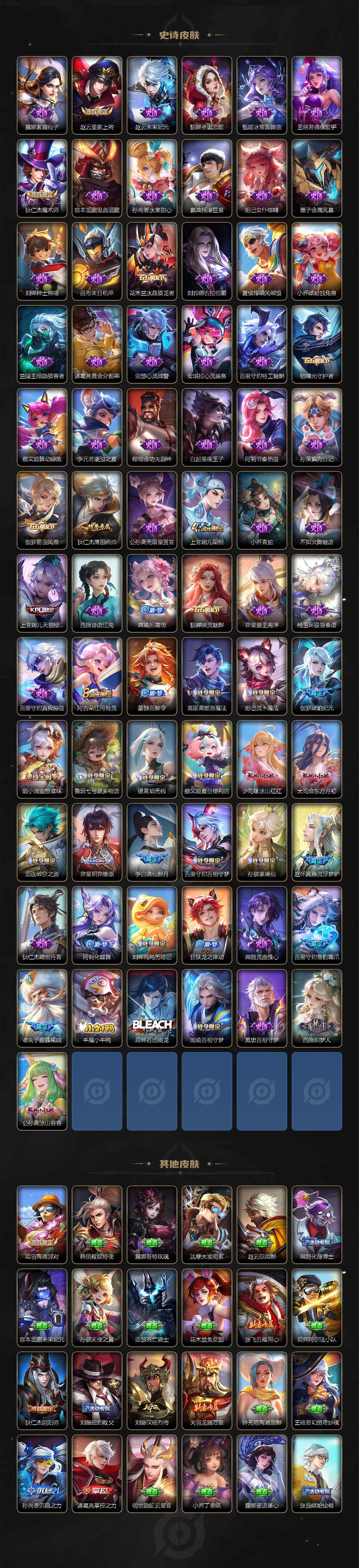 【史诗皮肤】:露娜紫霞仙子,赵云皇家上将,赵云未来纪元,貂蝉圣诞恋歌,甄姬冰雪圆舞曲,王昭君偶像歌手,狄仁杰魔术师,宫本武藏鬼剑武藏,孙尚香水果甜心,嬴政摇滚巨星,妲己女仆咖啡,墨子金属风暴,刘禅绅士熊喵,吕布末日机甲,花木兰水晶猎龙者,刘邦德古拉伯爵,夏侯惇乘风破浪,小乔缤纷独角兽,兰陵王暗隐猎兽者,诸葛亮黄金分割率,亚瑟心灵战警,安琪拉心灵骇客,百里守约特工魅影,铠曙光守护者,蔡文姬舞动绿茵,李元芳逐浪之夏,程咬金功夫厨神,白起星夜王子,阿轲节奏热浪,孙策猫狗日记,伽罗箭羽风息,狄仁杰鹰眼统帅,公孙离无限星赏官,上官婉儿梁祝,小乔青蛇,不知火舞魅语,上官婉儿天狼绘梦者,西施诗语江南,嫦娥拒霜思,貂蝉唤灵魅影
