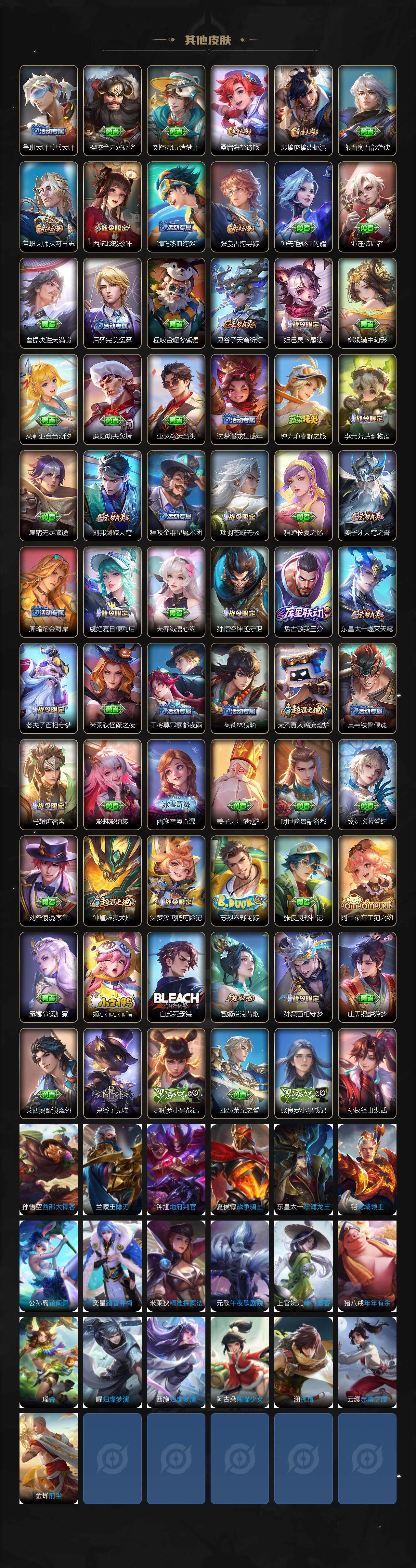 【限定皮肤】:蔡文姬夏日便利店,大乔绒语心约,虞姬夏日便利店,姜子牙天穹之誓,李白谪仙醉月,狄仁杰阴阳师,赵云皇家上将,甄姬至美化雀舞,狄仁杰魔术师,项羽海滩派对,虞姬启明星使,裴擒虎擒涛扼浪,上官婉儿梁祝,上官婉儿天狼绘梦者,嫦娥拒霜思,西施玲珑珍味,鲁班大师探海日志,桑启海盐诗旅,夏洛特浮生妄,阿古朵江河有灵,张良古海寻踪,蒙犽百解令,高渐离燃音魔法,妲己灵卜魔法,鬼谷子天穹祈灯,伽罗琥珀纪元,姬小满妄想食味,赵云乘龙铭钟鼎,亚连落雪白狼,沈梦溪龙舞盛年,鲁班七号蔬乡物语,李元芳蔬乡物语,刘邦剑破天穹,程咬金群星魔术团,镜青焰无极,项羽苍威无极,周瑜熔金海岸