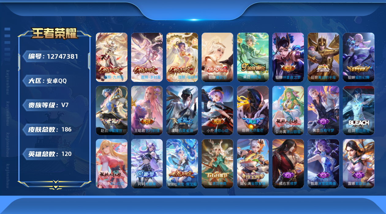 [12747381]安卓Q-V7-永恒钻石I段位-120英雄-186皮肤-0典藏-0珍品无双-0无双-0珍品传说-13传说-42史诗
