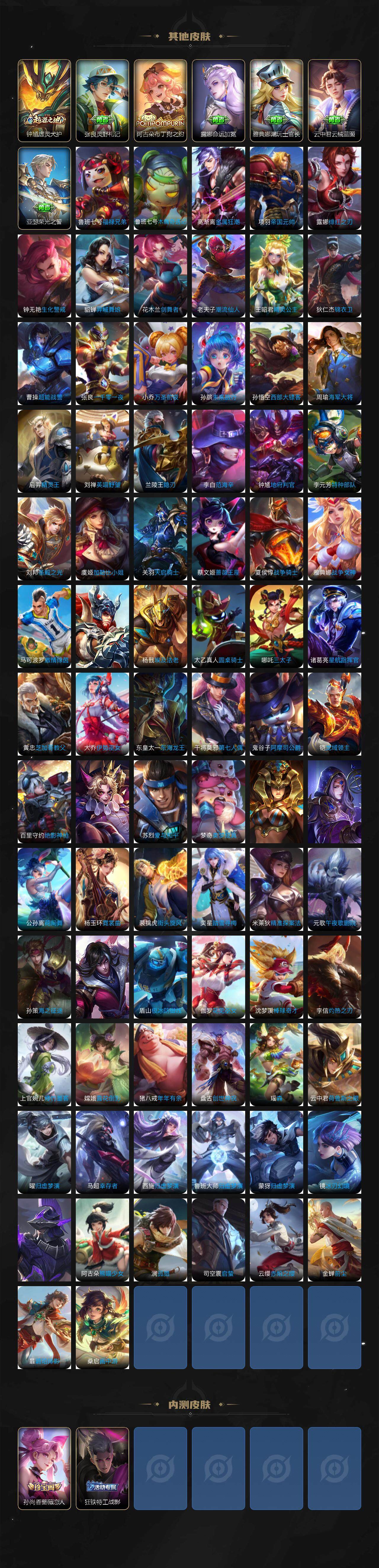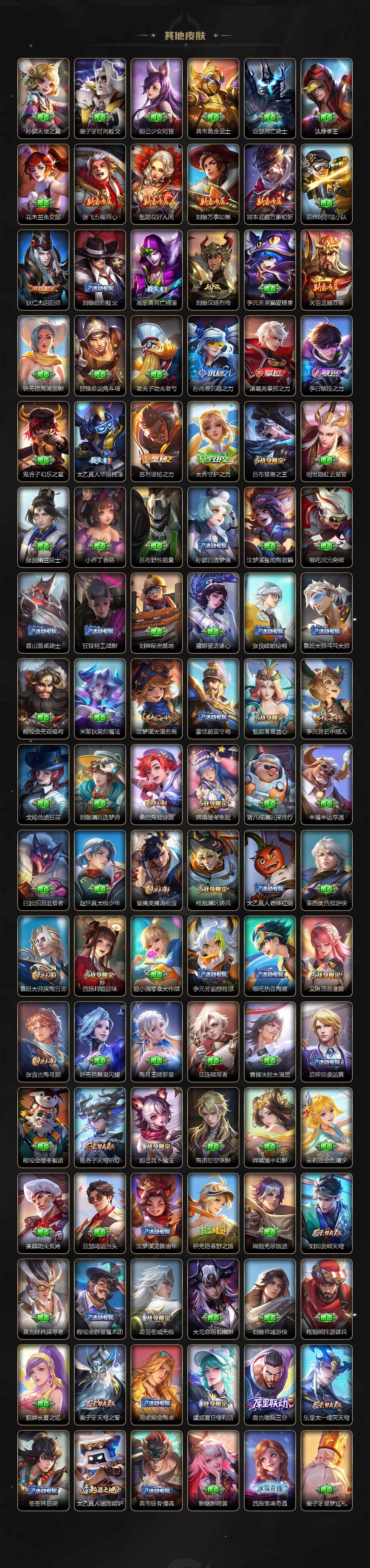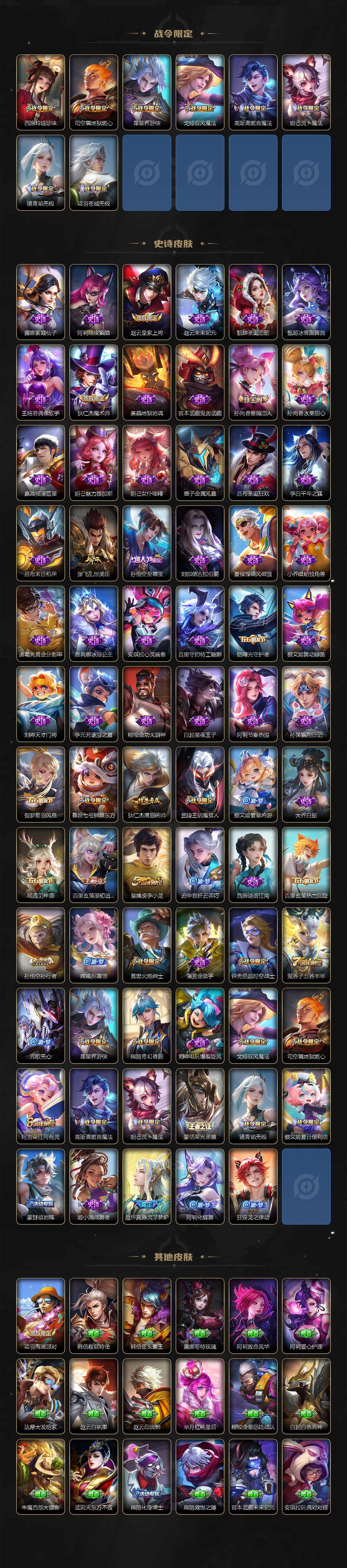 【限定皮肤】:蒙犽顽岩魄,蔡文姬夏日便利店,虞姬夏日便利店,姜子牙天穹之誓,杨戬破阵退雄兵,狄仁杰阴阳师,赵云皇家上将,孙尚香蔷薇恋人,鲁班七号狮舞东方,高渐离死亡摇滚,钟无艳超时空战士,扁鹊奇幻香踪,吕布猎兽之王,元歌无心,甄姬落雪兰心,狄仁杰魔术师,狄仁杰神器狴犴令,项羽海滩派对,兰陵王驯魔猎人,孙悟空至尊宝,孙悟空孙行者,孙悟空齐天大圣,李元芳云中旅人,虞姬启明星使,杨戬潮玩骑兵,蔡文姬繁星吟游,太乙真人华丽摇滚,鬼谷子五谷丰年,黄忠火炮绅士,百里玄策原初追逐者,沈梦溪大漠名商,裴擒虎李小龙,裴擒虎擒涛扼浪,云中君纤云弄巧,嫦娥拒霜思,嫦娥暖冬兔眠,西施玲珑珍味,鲁班大师探海日志,桑启海盐诗旅,暃星界游侠,戈娅驭风魔法,艾琳流音漫舞,司空震地狱燃心,阿古朵江河有灵,张良古海寻踪,蒙恬荣光圣徽,高渐离燃音魔法,妲己灵卜魔法,鬼谷子天穹祈灯,沈梦溪龙舞盛年,刘邦剑破天穹,程咬金群星魔术团,镜青焰无极,项羽苍威无极,刘备异域游侠,周瑜熔金海岸