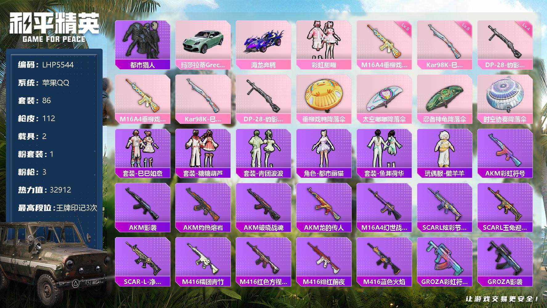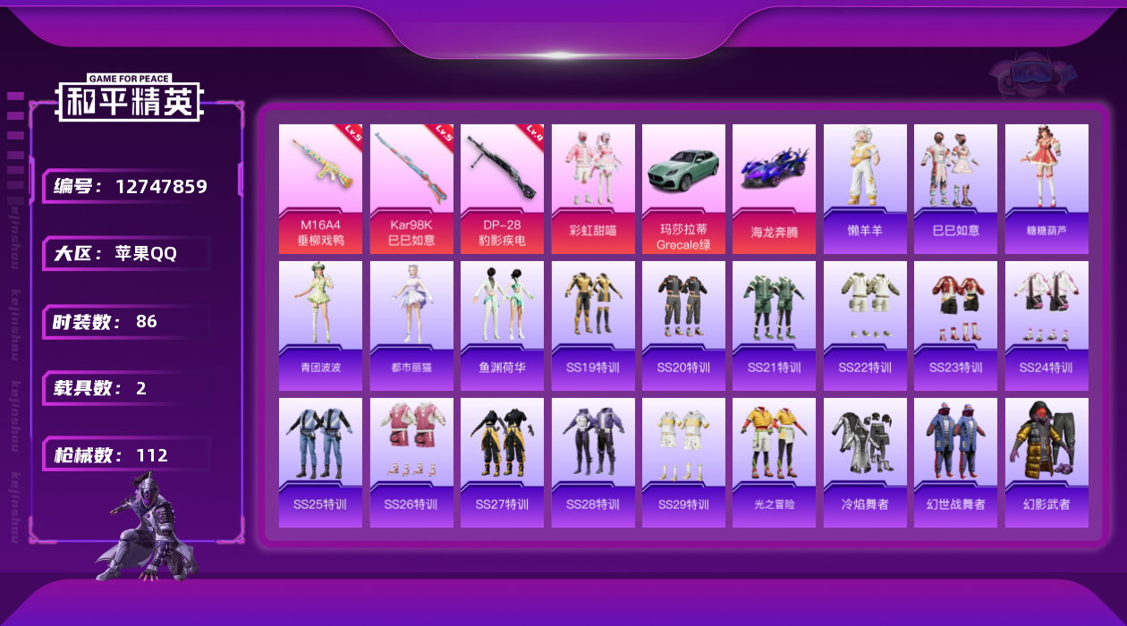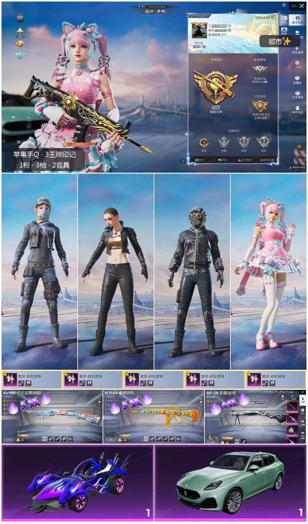 [12747859]苹果 手Q-1粉装-3特效枪-2载具-3.2w热力值-3王牌印记-86套装-112枪皮【热门品类】:套装-都市猎人【粉色载具】:玛莎拉蒂Grecale(薄荷绿),海龙奔腾【粉色套装】:粉装-彩虹甜喵【粉色枪皮等级】:M16A4-垂柳戏鸭(五级),Kar98K-巳巳如意(五级),DP-28-豹影疾电(四级)