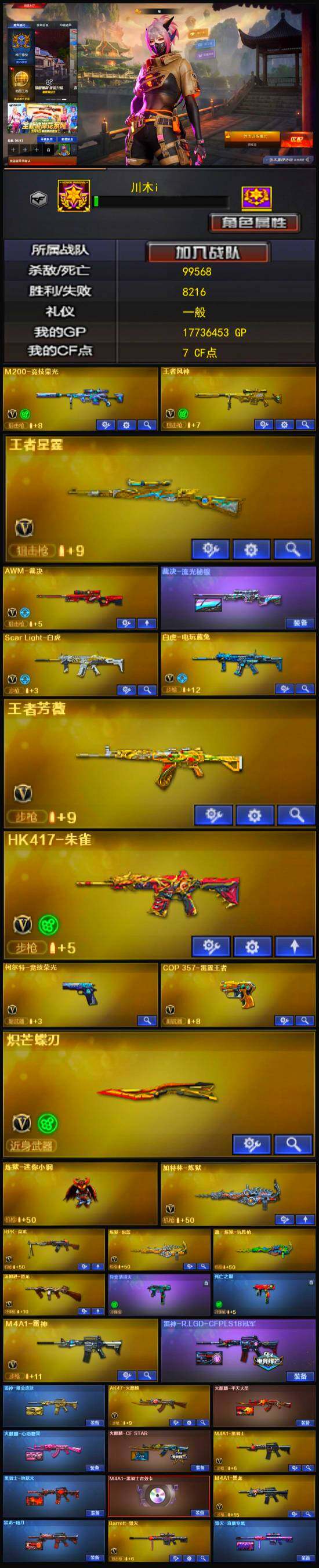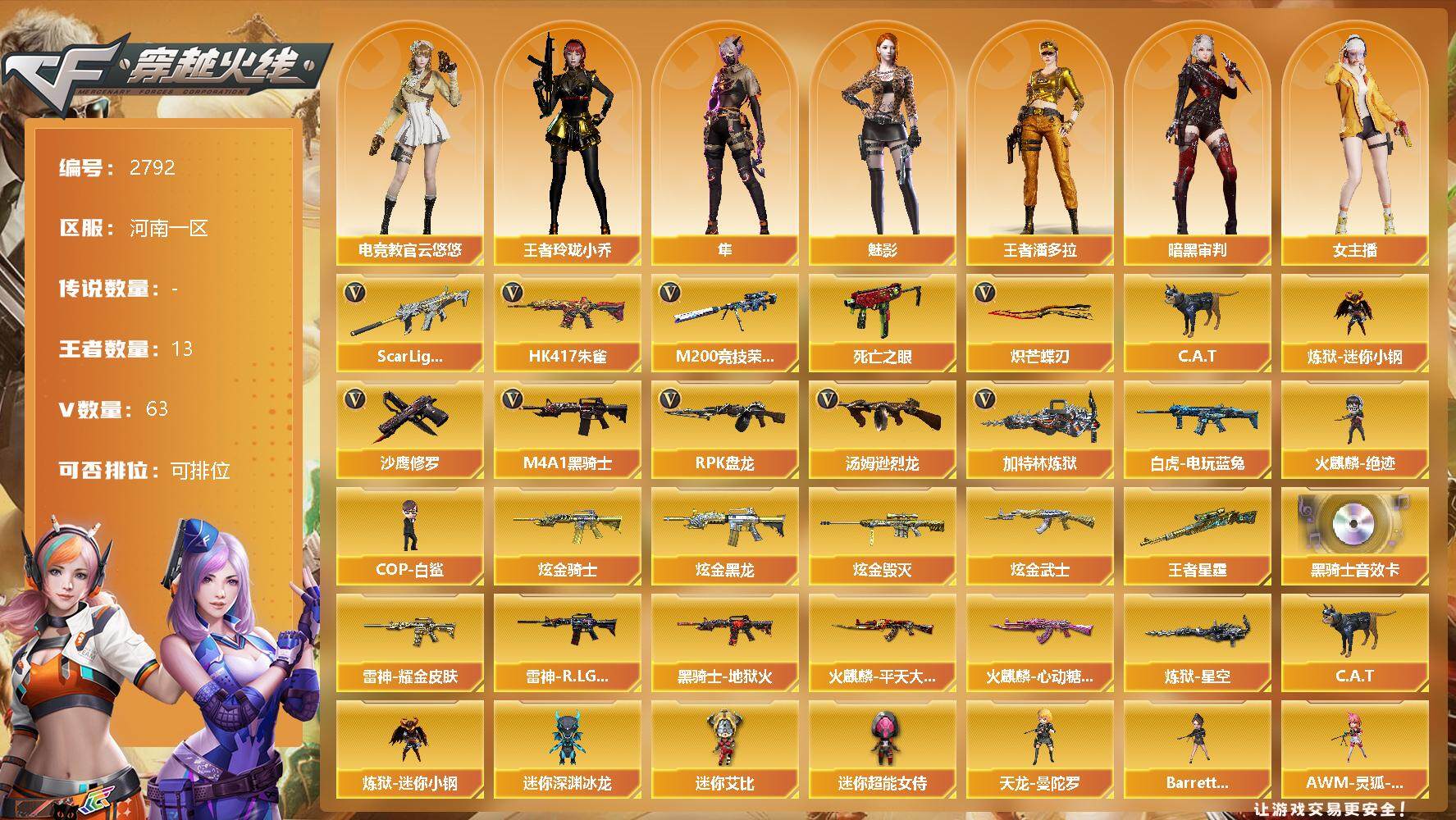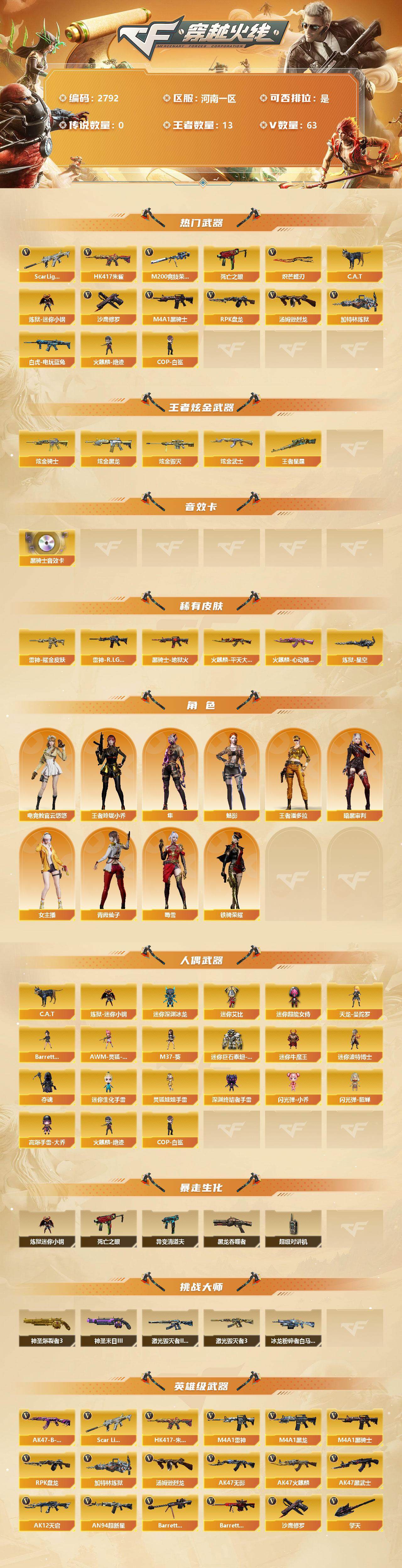 [12747879]河南一区-63V-13王者-4炫金 【热门武器】:Scar Light-白虎,HK417-朱雀,M200-竞技荣光,死亡之眼,白虎-电玩蓝兔,C.A.T,炼狱-迷你小钢,M4A1-黑骑士,汤姆逊-烈龙,RPK-盘龙,加特林-炼狱,火麒麟-绝迹,COP-白鲨,沙鹰-修罗,炽芒蝶刃 【王者炫金武器】:炫金骑士,炫金黑龙,炫金毁灭,炫金武士,王者星霆 【音效卡】:M4A1-黑骑士音效卡 【稀有皮肤】:雷神-耀金皮肤,雷神-R.LGD-CFPLS18冠军,火麒麟-平天大圣,火麒麟-心动糖果,黑骑士-地狱火,炼狱-星空 【角色】:王者玲珑-小乔,王者潘多拉,魅影,电竞教官-云悠悠,隼,蜀雪,女主播,铁骑荣耀,暗黑审判,青霞仙子 【人偶武器】:火麒麟-绝迹,COP-白鲨,天龙-曼陀罗,Barrett-夜玫瑰,AWM-灵狐-15周年嘉年华,M37-葵,C.A.T,炼狱-迷你小钢,迷你深渊冰龙*2,迷你艾比,迷你超能女侍,迷你巨石泰坦-魔花研究所,迷你牛魔王,迷你波特博士,夺魂*3,迷你生化手雷,灵狐娃娃手雷*3,深渊终结者手雷,闪光弹-小乔,闪光弹-貂蝉,高爆手雷-大乔 【暴走生化】:炼狱-迷你小钢,死亡之眼,异变清道夫,黑龙吞噬者,超级对讲机 【挑战大师】:神圣爆裂者III,神圣爆裂者-末日III,激光毁灭者III,激光毁灭者III-白马银枪,冰龙粉碎者-白马银枪*2 【英雄级武器】:唐刀-神工天巧,M200-竞技荣光,柯尔特-竞技荣光,擎天-竞技荣光,高爆手雷-竞技荣光*3,烟雾弹-竞技荣光*3,闪光弹-竞技荣光*3,烈火-动感闪耀,天神-动感闪耀,屠龙-动感闪耀,手雷-动感闪耀,Scar Light-白虎,HK417-朱雀,白虎-电玩蓝兔,无影-神兵利器,M4A1-雷神,M4A1-黑龙,M4A1-黑骑士,RPK-盘龙,加特林-炼狱,汤姆逊-烈龙,AK47-无影,AK47-火麒麟,AK47-黑武士,AK12-天启,AN94-超新星,Barrett-毁灭,Barrett-极光,AWM-裁决,AA-12-雷霆,黑武士-锦绣游龙,AK-47-猩红传说,AK47-B-战神*2,AK47-B-常胜将军,沙鹰-修罗,炽芒蝶刃,麒麟刺,擎天,龙啸,屠龙 【特殊枪械】:1白虎,1黑骑士,1烈龙,1盘龙,1炼狱