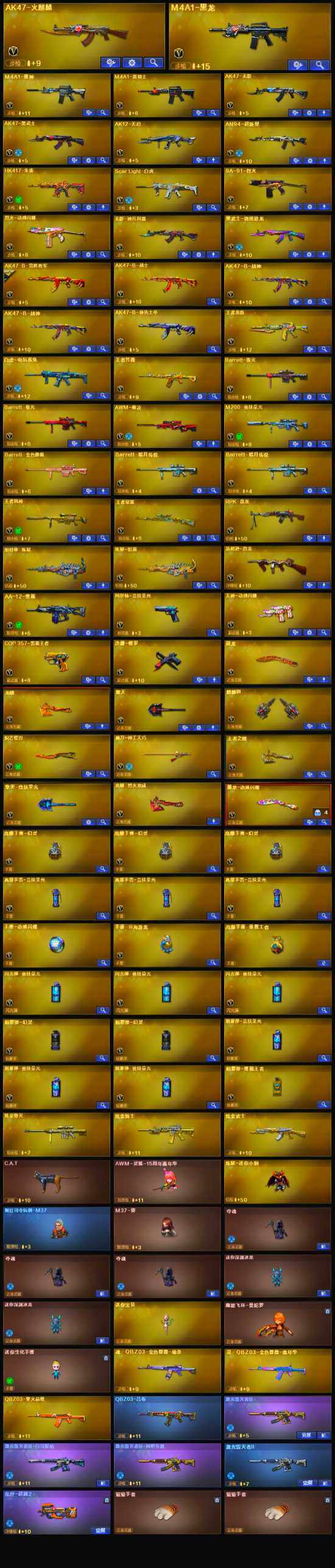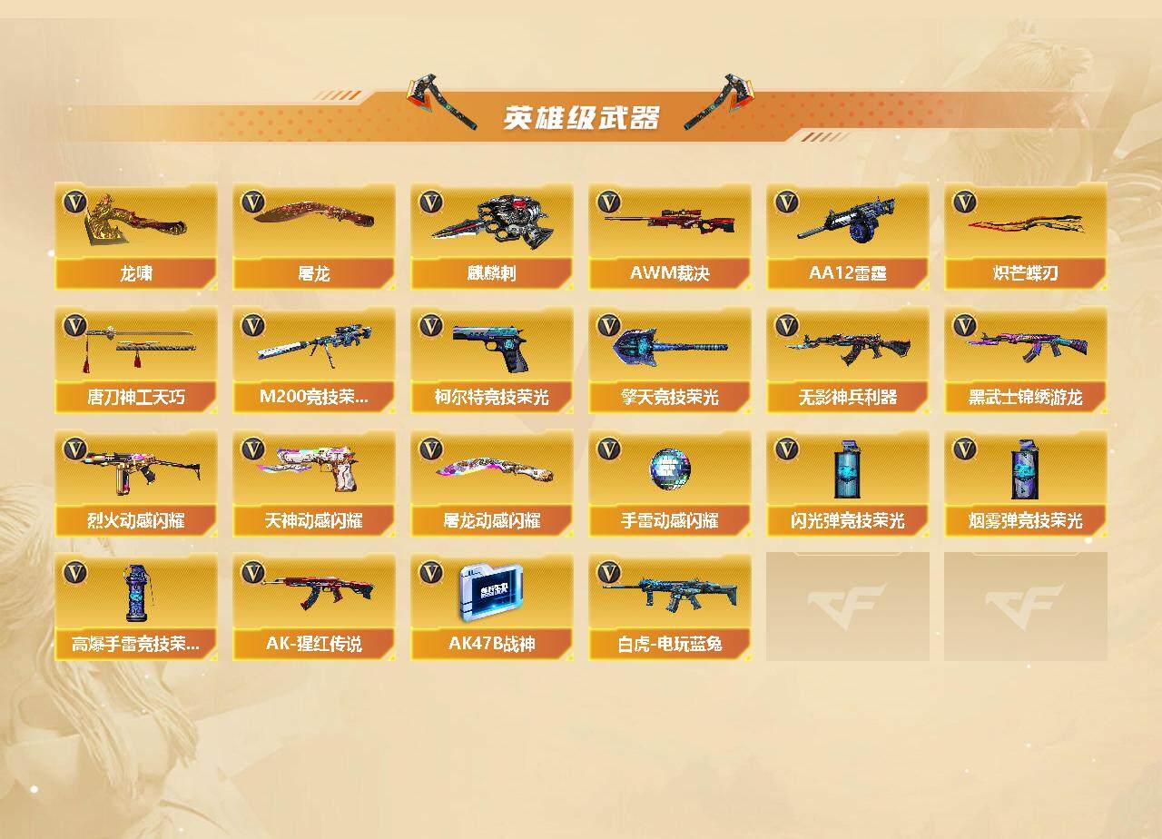 【英雄级武器】:唐刀-神工天巧,M200-竞技荣光,柯尔特-竞技荣光,擎天-竞技荣光,高爆手雷-竞技荣光*3,烟雾弹-竞技荣光*3,闪光弹-竞技荣光*3,烈火-动感闪耀,天神-动感闪耀,屠龙-动感闪耀,手雷-动感闪耀,Scar Light-白虎,HK417-朱雀,白虎-电玩蓝兔,无影-神兵利器,M4A1-雷神,M4A1-黑龙,M4A1-黑骑士,RPK-盘龙,加特林-炼狱,汤姆逊-烈龙,AK47-无影,AK47-火麒麟,AK47-黑武士,AK12-天启,AN94-超新星,Barrett-毁灭,Barrett-极光,AWM-裁决,AA-12-雷霆,黑武士-锦绣游龙,AK-47-猩红传说,AK47-B-战神*2,AK47-B-常胜将军,沙鹰-修罗,炽芒蝶刃,麒麟刺,擎天,龙啸,屠龙
