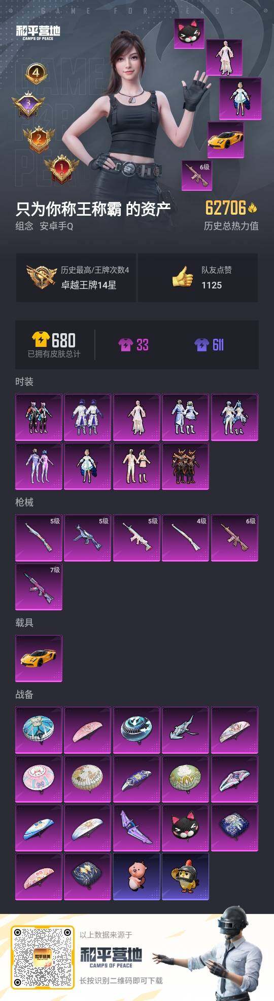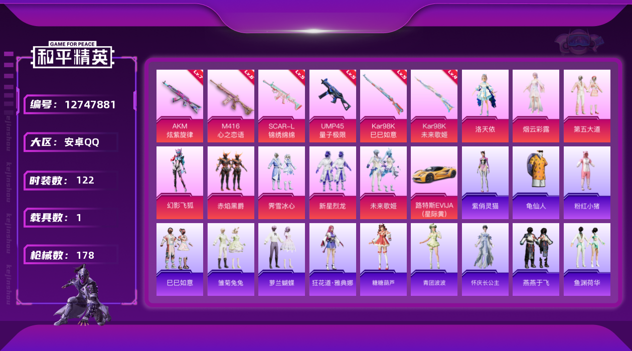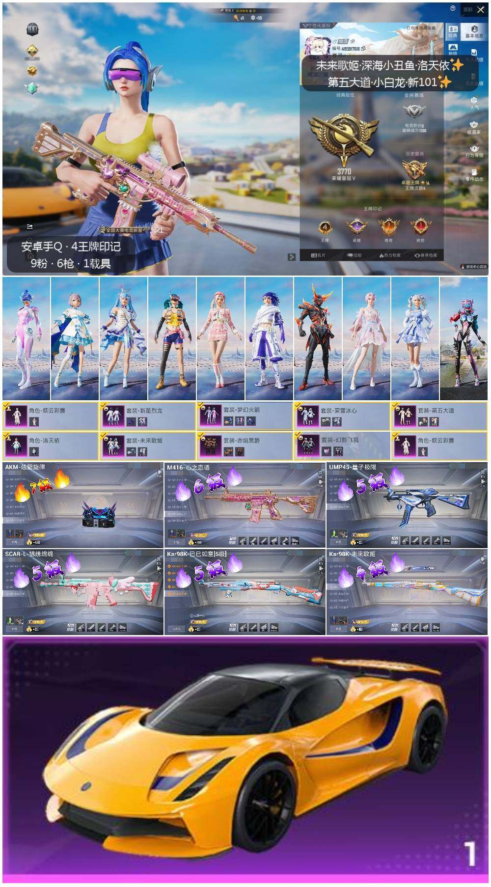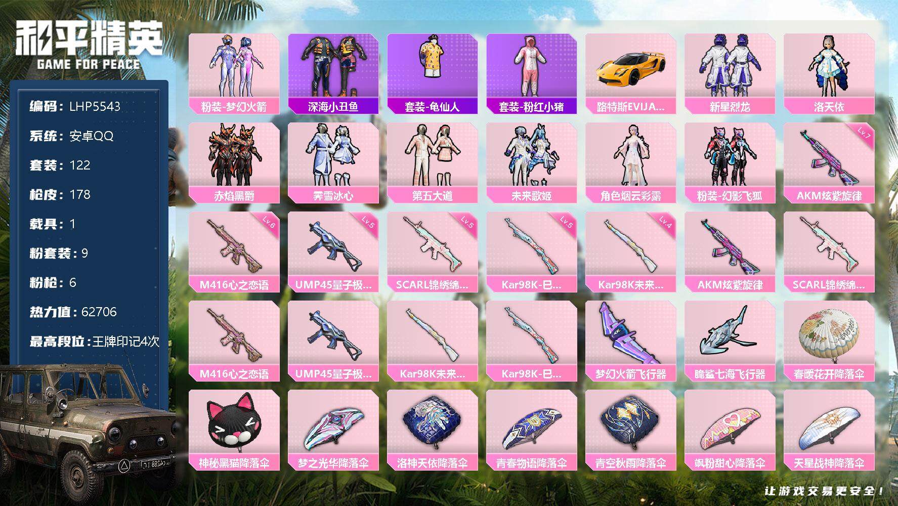 [12747881]素材身法号/绝世印记1/地铁满天赋 安卓 手Q-9粉装-6特效枪-1载具-2粉色飞行器-6.2w热力值-4王牌印记-122套装-178枪皮【热门品类】:粉装-梦幻火箭,套装-深海小丑鱼,套装-龟仙人,套装-粉红小猪【粉色载具】:路特斯EVIJA(星际黄)【粉色套装】:粉装-梦幻火箭,粉装-新星烈龙,角色-洛天依,粉装-赤焰黑爵,粉装-霁雪冰心,粉装-第五大道,粉装-未来歌姬,角色-烟云彩露,粉装-幻影飞狐【粉色枪皮等级】:AKM-炫紫旋律(七级),SCAR-L-锦绣绵绵(五级),M416-心之恋语(六级),UMP45-量子极限(五级),Kar98K-未来歌姬(四级),Kar98K-巳巳如意(五级)【粉色飞行器】:梦幻火箭飞行器,脆鲨七海飞行器