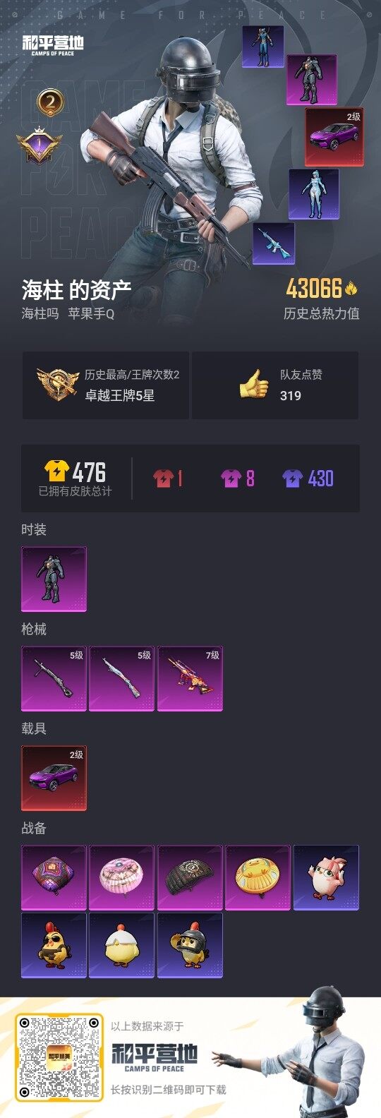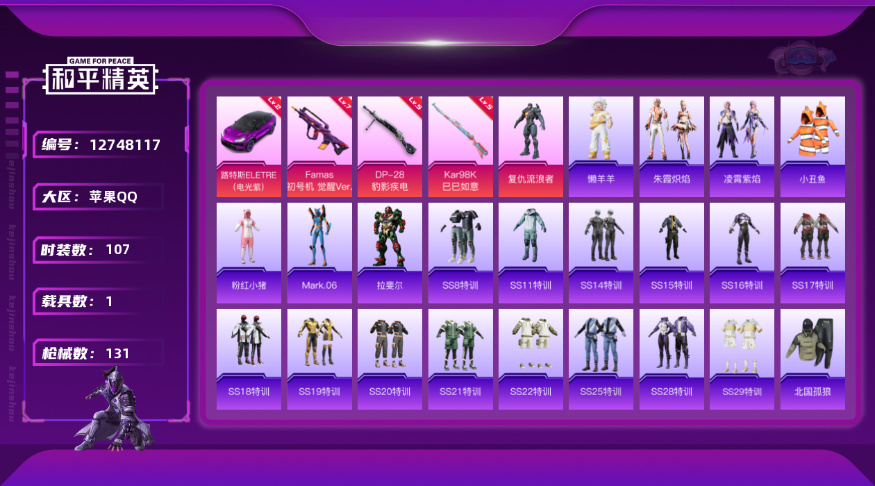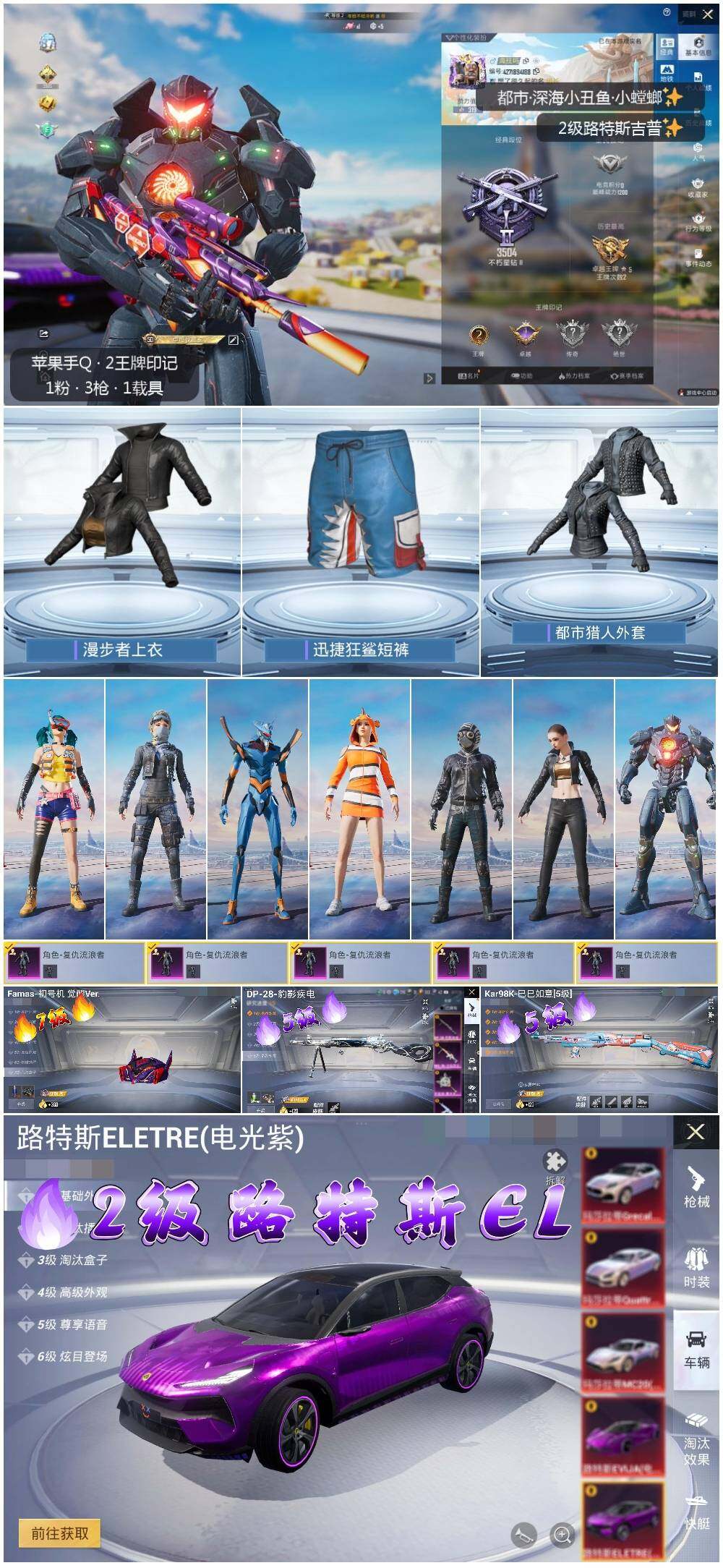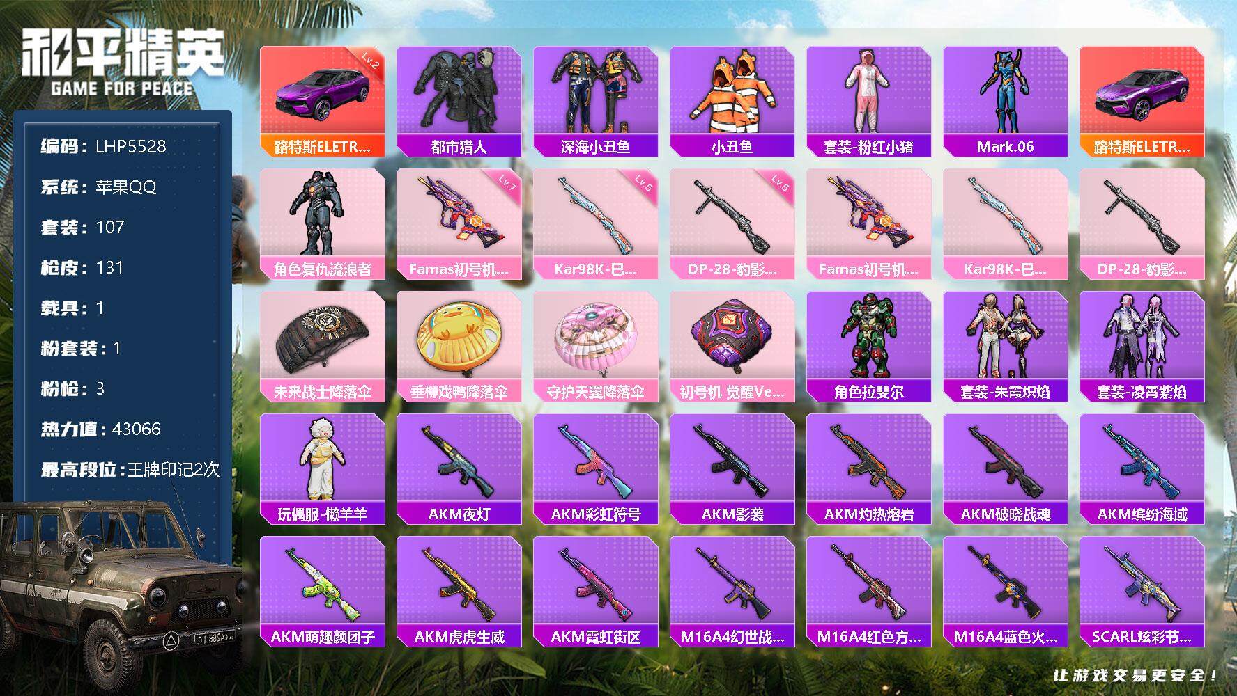 [12748117]苹果 手Q-1粉装-3特效枪-1载具-4.3w热力值-2王牌印记-107套装-131枪皮【红色载具】:路特斯ELETRE(电光紫)(二级)【热门品类】:套装-都市猎人,套装-深海小丑鱼,套装-小丑鱼,套装-粉红小猪,角色-Mark.06【粉色载具】:路特斯ELETRE(电光紫)【粉色套装】:角色-复仇流浪者【粉色枪皮等级】:Famas-初号机 觉醒Ver.(七级),Kar98K-巳巳如意(五级),DP-28-豹影疾电(五级)