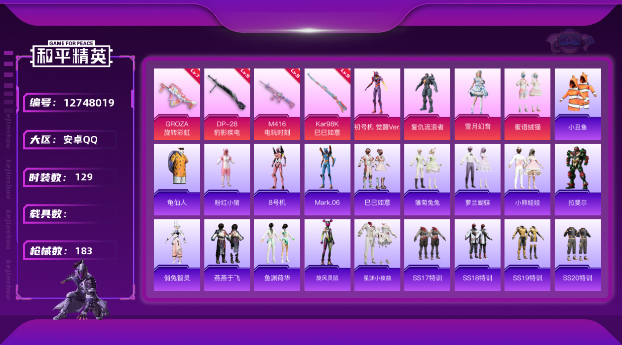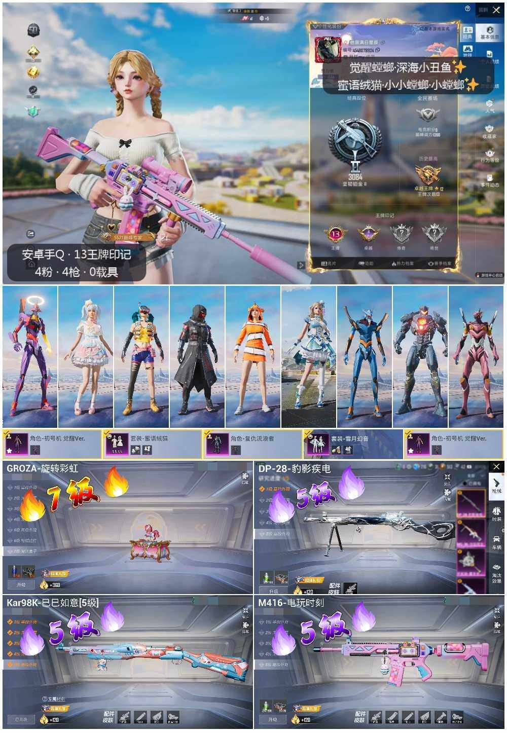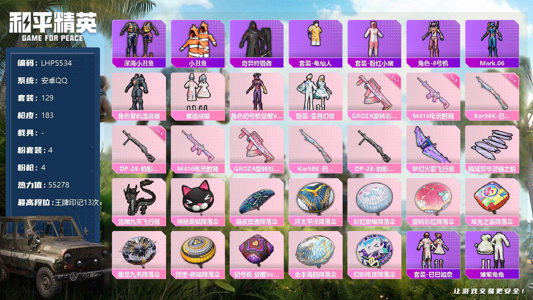 [12748019]地铁满天赋 安卓 手Q-4粉装-4特效枪-3粉色飞行器-5.5w热力值-13王牌印记-129套装-183枪皮【热门品类】:套装-深海小丑鱼,套装-小丑鱼,套装-奇异狩猎者,套装-龟仙人,套装-粉红小猪,角色-8号机,角色-Mark.06【粉色套装】:角色-复仇流浪者,粉装-蜜语绒猫,角色-初号机 觉醒Ver.,粉装-雪月幻音【粉色枪皮等级】:M416-电玩时刻(五级),GROZA-旋转彩虹(七级),Kar98K-巳巳如意(五级),DP-28-豹影疾电(五级)【粉色飞行器】:梦幻火箭飞行器,镜域双华-灵镜之阶,龙翔九天飞行器