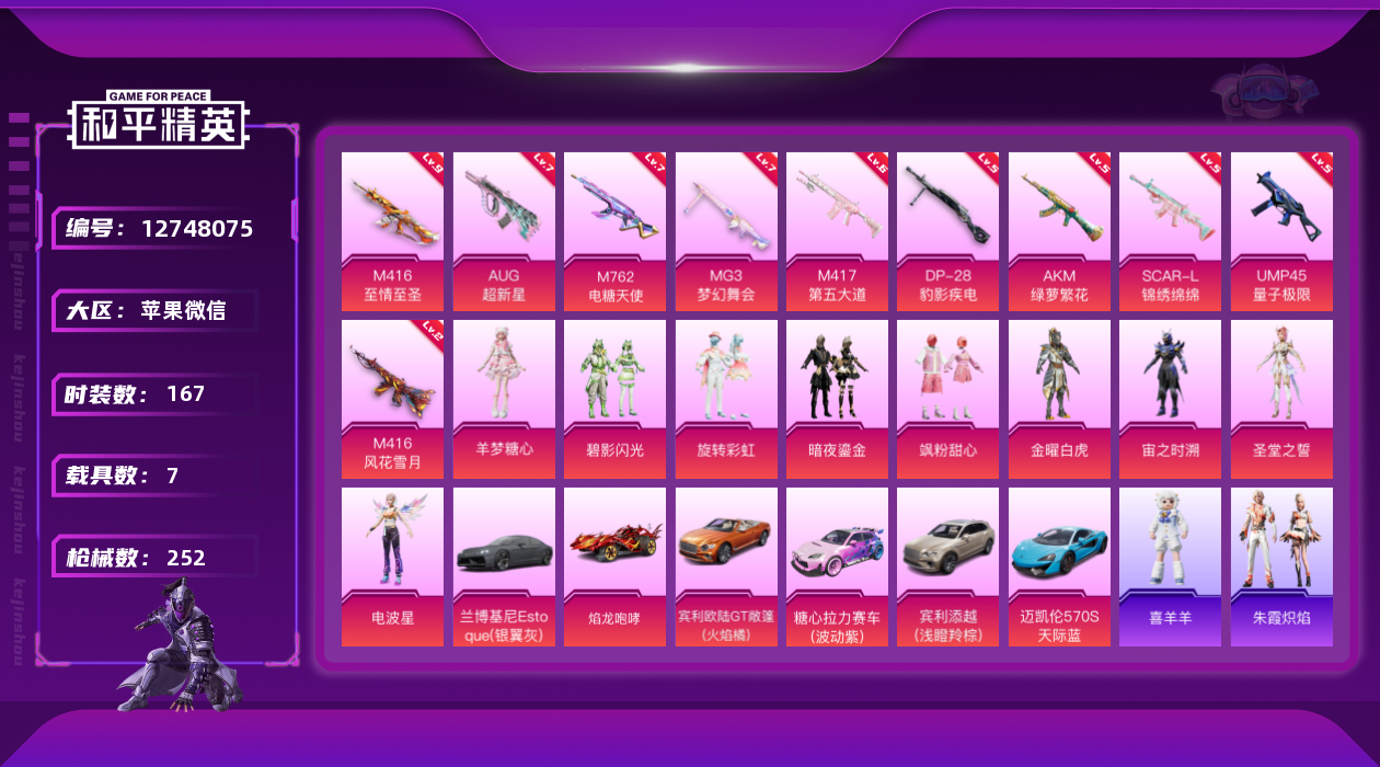 [12748075]素材身法号/无敌战神框1/M416-至情至圣(九级) 苹果 微信-无敌战神框-9粉装-10特效枪-7载具-1粉色飞行器-8.8w热力值-13王牌印记-167套装-252枪皮【热门品类】:套装-都市猎人,角色-军刀雅典娜,套装-龟仙人,套装-暗影哥特【粉色载具】:兰博基尼Estoque(银翼灰),宾利欧陆GT敞篷(火焰橘),宾利添越(浅瞪羚棕),迈凯伦570S(天际蓝),焰龙咆哮,糖心拉力赛车(波动紫),僚机-萌兔起飞【粉色套装】:粉装-金曜白虎,粉装-碧影闪光,粉装-旋转彩虹,粉装-暗夜鎏金,粉装-飒粉甜心,角色-宙之时溯,角色-圣堂之誓,角色-电波星,角色-羊梦糖心【粉色枪皮等级】:AKM-绿萝繁花(五级),SCAR-L-锦绣绵绵(五级),M416-风花雪月(二级),M416-至情至圣(九级),AUG-超新星(七级),M762-电糖天使(七级),UMP45-量子极限(五级),M417-第五大道(六级),DP-28-豹影疾电(五级),MG3-梦幻舞会(七级)【粉色飞行器】:电糖天使飞行器