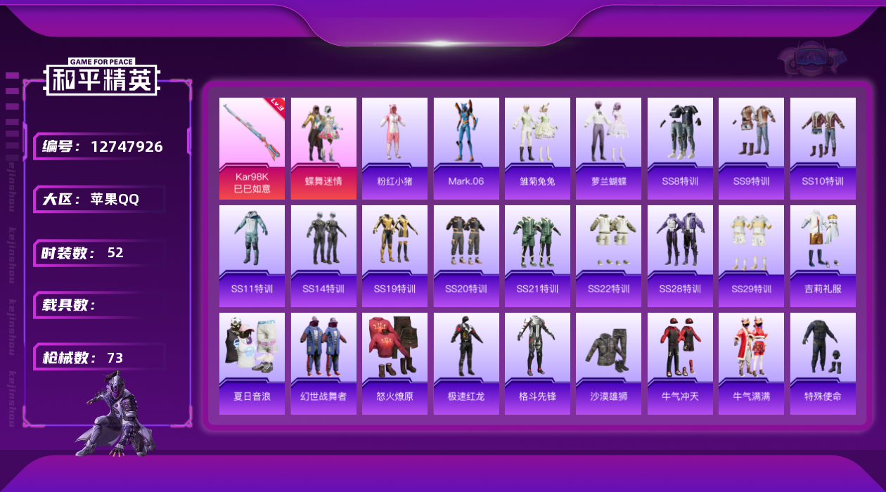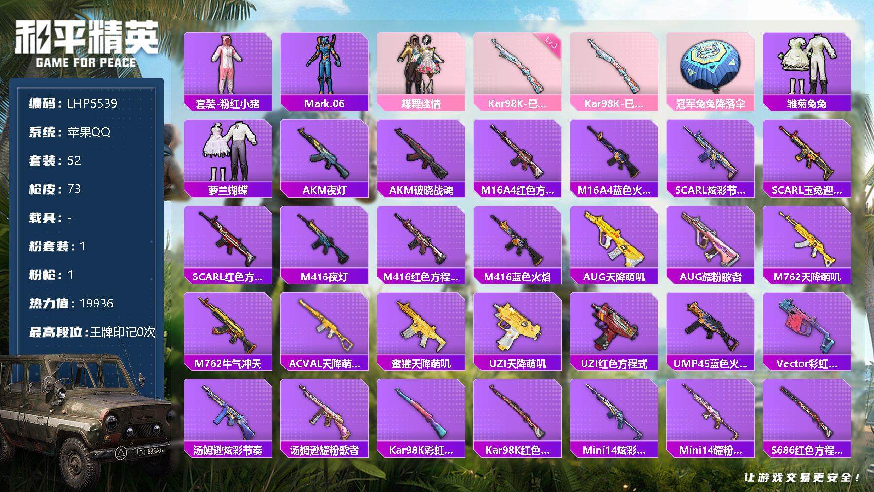 [12747926]苹果 手Q-1粉装-1特效枪-1.9w热力值-1王牌印记-52套装-73枪皮【热门品类】:套装-粉红小猪,角色-Mark.06【粉色套装】:粉装-蝶舞迷情【粉色枪皮等级】:Kar98K-巳巳如意(三级)