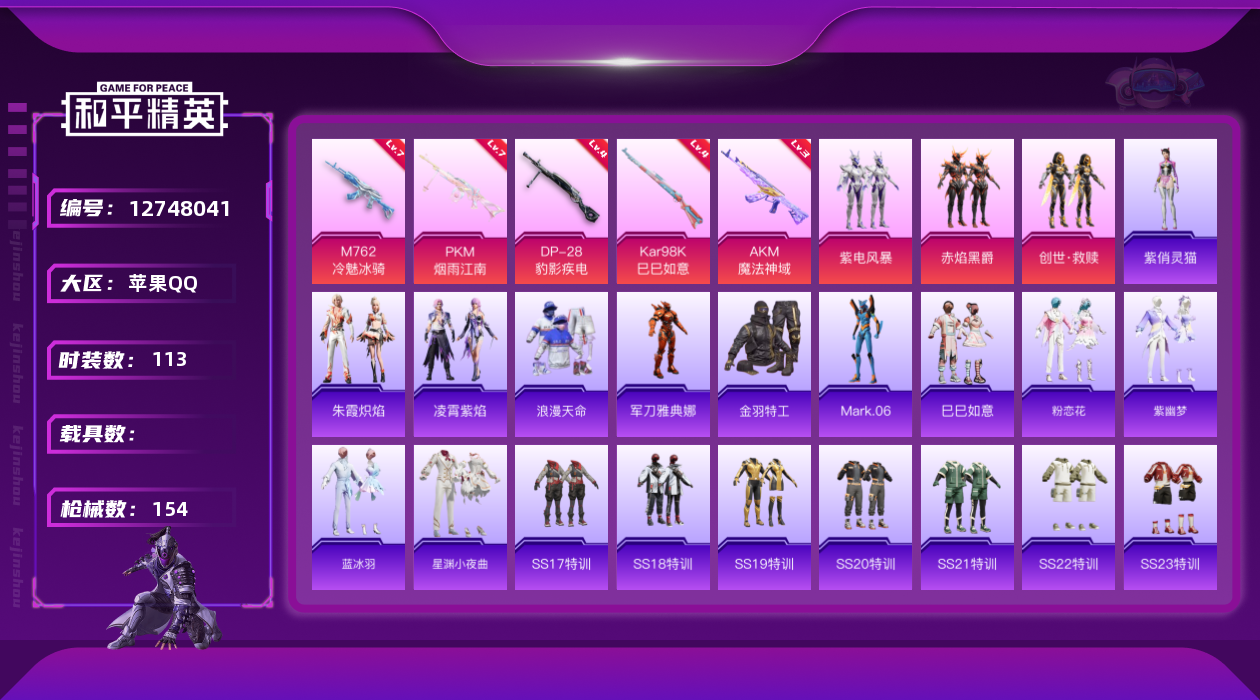 [12748041]地铁满天赋 苹果 手Q-3粉装-5特效枪-4.7w热力值-15王牌印记-113套装-154枪皮【热门品类】:套装-浪漫天命,套装-深海小丑鱼,角色-军刀雅典娜,套装-金羽特工,角色-Mark.06【粉色套装】:粉装-赤焰黑爵,粉装-紫电风暴,套装-创世·救赎【粉色枪皮等级】:AKM-魔法神域(三级),M762-冷魅冰骑(七级),Kar98K-巳巳如意(四级),DP-28-豹影疾电(四级),PKM-江南烟雨(七级)