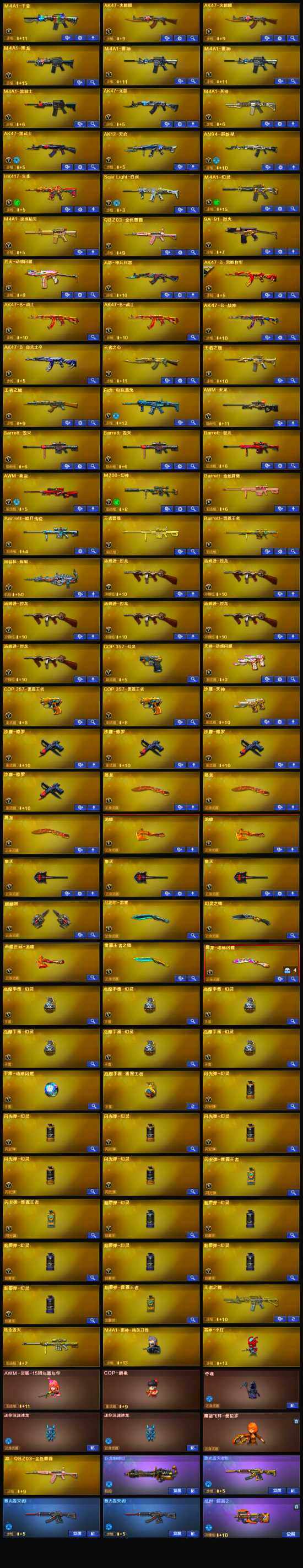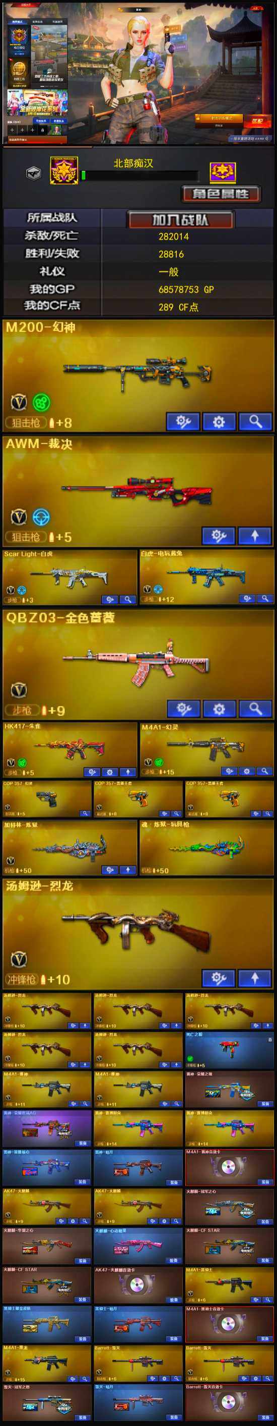 【热门武器】:QBZ03-金色蔷薇,Scar Light-白虎,HK417-朱雀,M200-幻神,死亡之眼,白虎-电玩蓝兔,金色小号,M4A1-黑骑士,汤姆逊-烈龙*6,加特林-炼狱,雷神-小红,COP 357-幻灵,沙鹰-修罗*4,荣耀世冠-龙啸