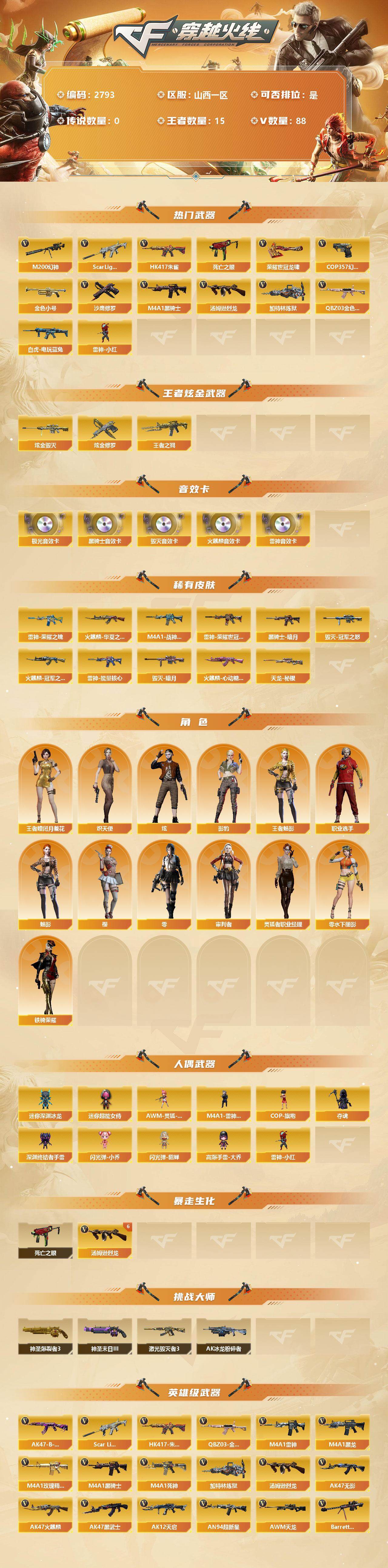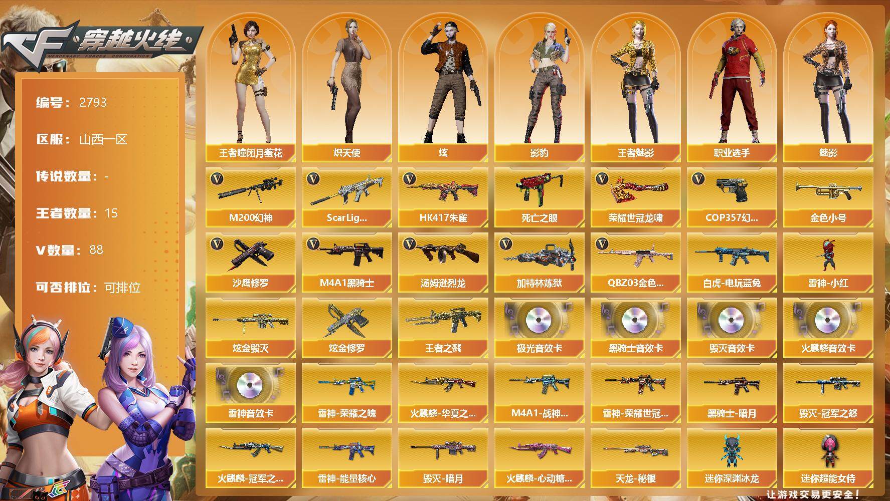 [12748327]山西一区-88V-15王者-2炫金 【热门武器】:QBZ03-金色蔷薇,Scar Light-白虎,HK417-朱雀,M200-幻神,死亡之眼,白虎-电玩蓝兔,金色小号,M4A1-黑骑士,汤姆逊-烈龙*6,加特林-炼狱,雷神-小红,COP 357-幻灵,沙鹰-修罗*4,荣耀世冠-龙啸 【王者炫金武器】:炫金毁灭,炫金修罗,王者之戮 【音效卡】:AK47-火麒麟音效卡,M4A1-雷神音效卡,M4A1-黑骑士音效卡,Barrett-毁灭音效卡,Barrett-极光音效卡 【稀有皮肤】:雷神-能量核心,雷神-荣耀之魄,M4A1-战神赵云,雷神-荣耀世冠AG,火麒麟-冠军之心,火麒麟-华夏之心,火麒麟-心动糖果,黑骑士-暗月,毁灭-暗月,毁灭-冠军之怒,天龙-秘银 【角色】:王者-瞳-闭月羞花,王者-魅影,灵狐者-职业经理,零-水下丽影,审判者,零,樱,魅影,炫,影豹,炽天使,铁骑荣耀,职业选手 【人偶武器】:雷神-小红,AWM-灵狐-15周年嘉年华,M4A1-雷神-精英刀锋,COP-旗袍,迷你深渊冰龙*2,迷你超能女侍,夺魂,深渊终结者手雷,闪光弹-小乔,闪光弹-貂蝉,高爆手雷-大乔 【暴走生化】:死亡之眼 【挑战大师】:神圣爆裂者III,神圣爆裂者-末日III*2,激光毁灭者III,AK47-冰龙粉碎者 【英雄级武器】:M4A1-幻灵,COP 357-幻灵,幻灵之锋,荣耀世冠-龙啸,烈火-动感闪耀,天神-动感闪耀,屠龙-动感闪耀,手雷-动感闪耀,QBZ03-金色蔷薇,Scar Light-白虎,HK417-朱雀,白虎-电玩蓝兔,无影-神兵利器,M4A1-雷神*2,M4A1-黑龙,M4A1-玫瑰精灵,M4A1-黑骑士,M4A1-死神,加特林-炼狱,汤姆逊-烈龙*6,AK47-无影,AK47-火麒麟*2,AK47-黑武士,AK12-天启,AN94-超新星,AWM-天龙,Barrett-毁灭*2,Barrett-极光,AWM-裁决,M200-幻神,M4A1-千变,AK-47-猩红传说*2,AK47-B-战神,AK47-B-常胜将军,M4A1-赤狱骑士,沙鹰-天神,沙鹰-修罗*4,麒麟刺,擎天*3,龙啸*2,屠龙*3 【特殊枪械】:1白虎,1黑骑士,6烈龙,1炼狱