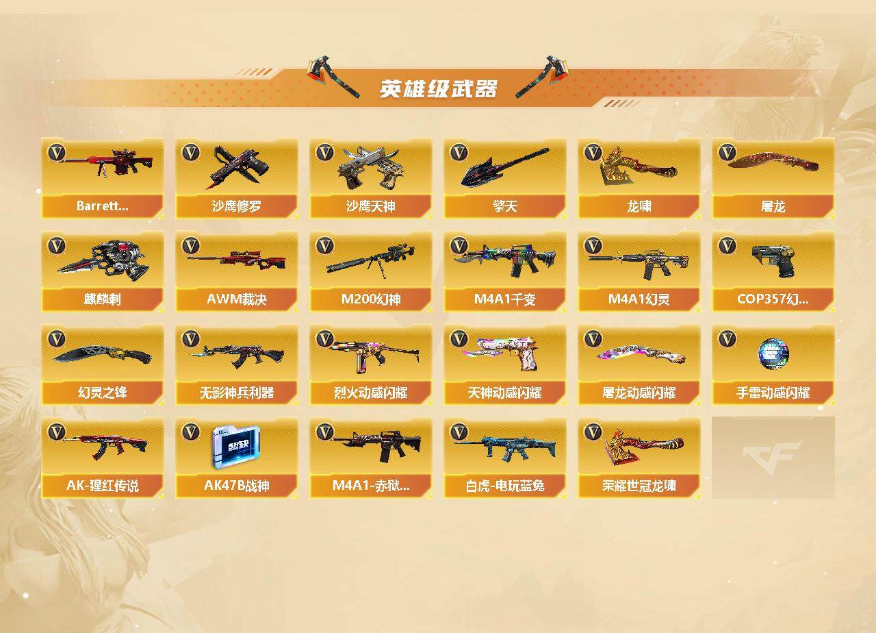【英雄级武器】:M4A1-幻灵,COP 357-幻灵,幻灵之锋,荣耀世冠-龙啸,烈火-动感闪耀,天神-动感闪耀,屠龙-动感闪耀,手雷-动感闪耀,QBZ03-金色蔷薇,Scar Light-白虎,HK417-朱雀,白虎-电玩蓝兔,无影-神兵利器,M4A1-雷神*2,M4A1-黑龙,M4A1-玫瑰精灵,M4A1-黑骑士,M4A1-死神,加特林-炼狱,汤姆逊-烈龙*6,AK47-无影,AK47-火麒麟*2,AK47-黑武士,AK12-天启,AN94-超新星,AWM-天龙,Barrett-毁灭*2,Barrett-极光,AWM-裁决,M200-幻神,M4A1-千变,AK-47-猩红传说*2,AK47-B-战神,AK47-B-常胜将军,M4A1-赤狱骑士,沙鹰-天神,沙鹰-修罗*4,麒麟刺,擎天*3,龙啸*2,屠龙*3