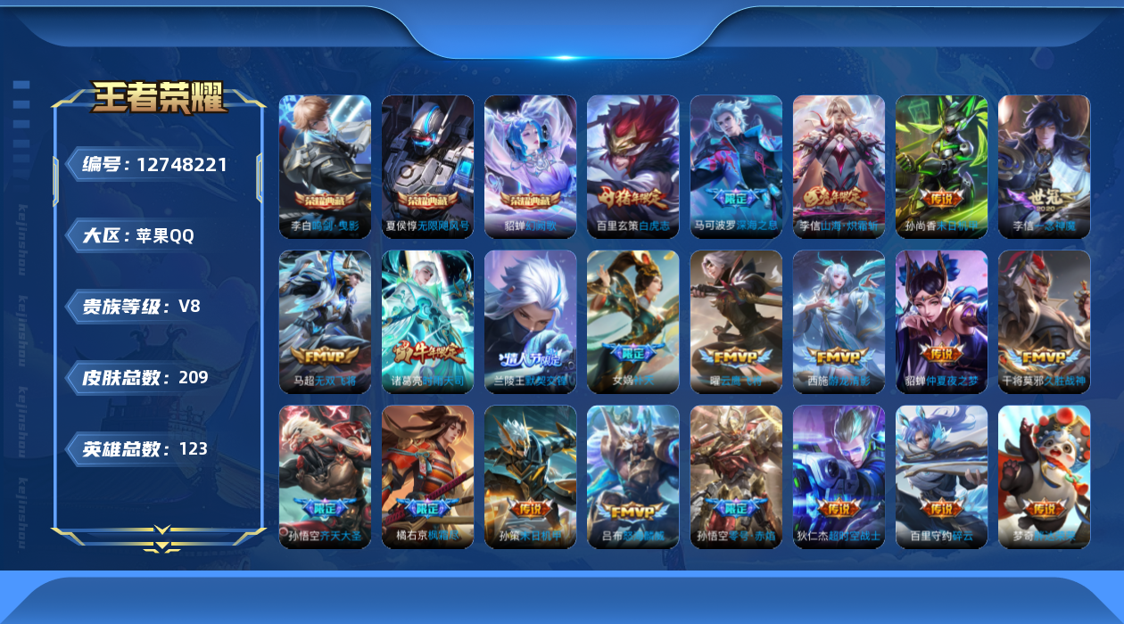 [12748221]苹果Q-V8-永恒钻石IV段位-123英雄-209皮肤-3典藏-0珍品无双-0无双-0珍品传说-23传说-74史诗
