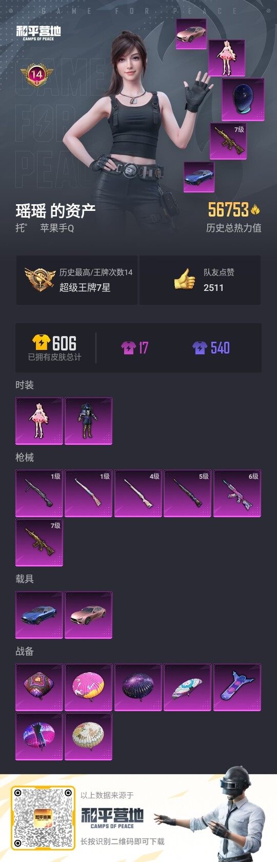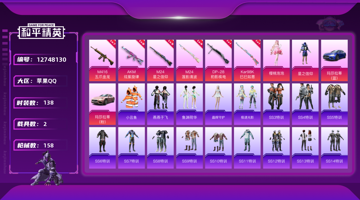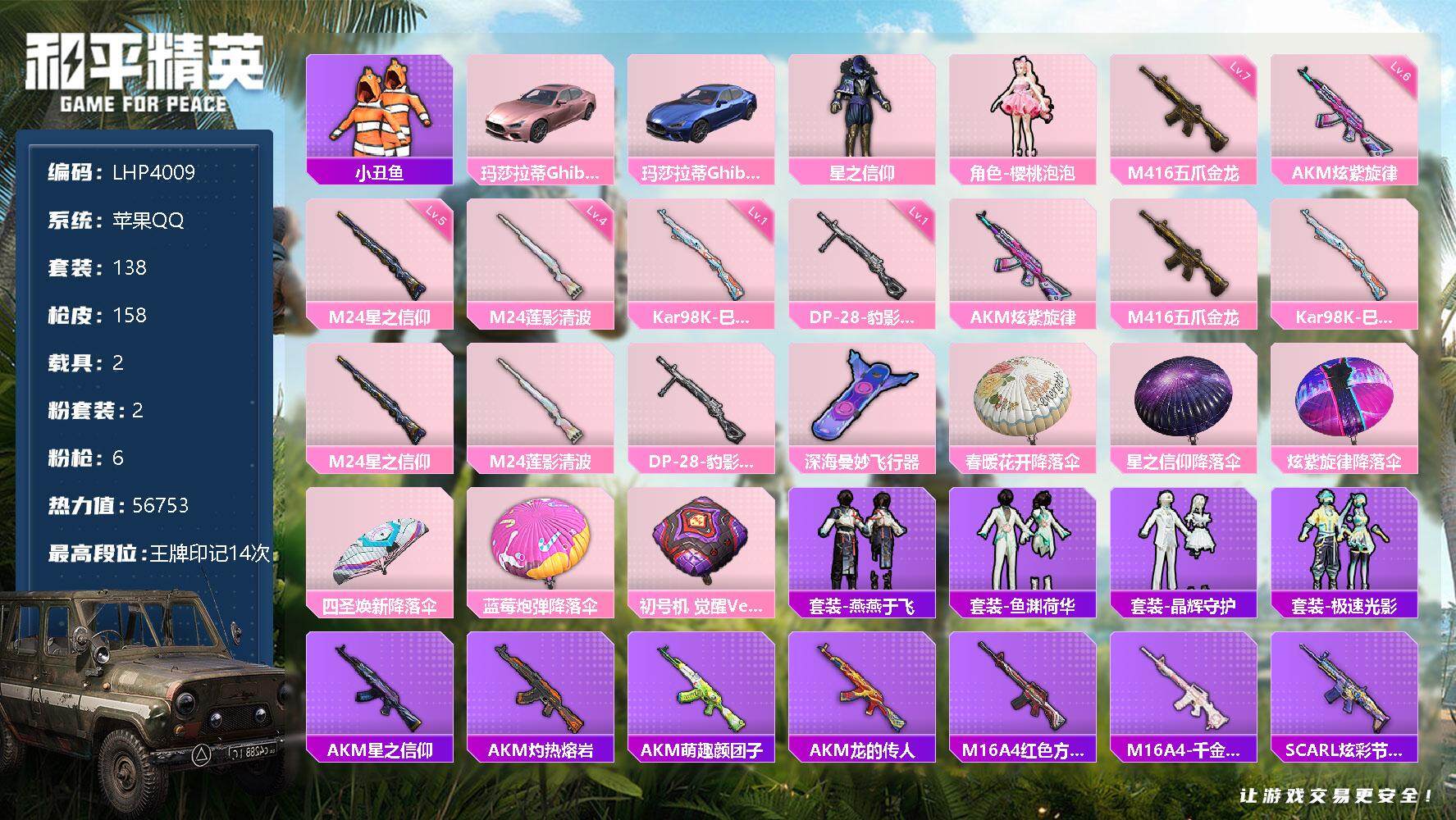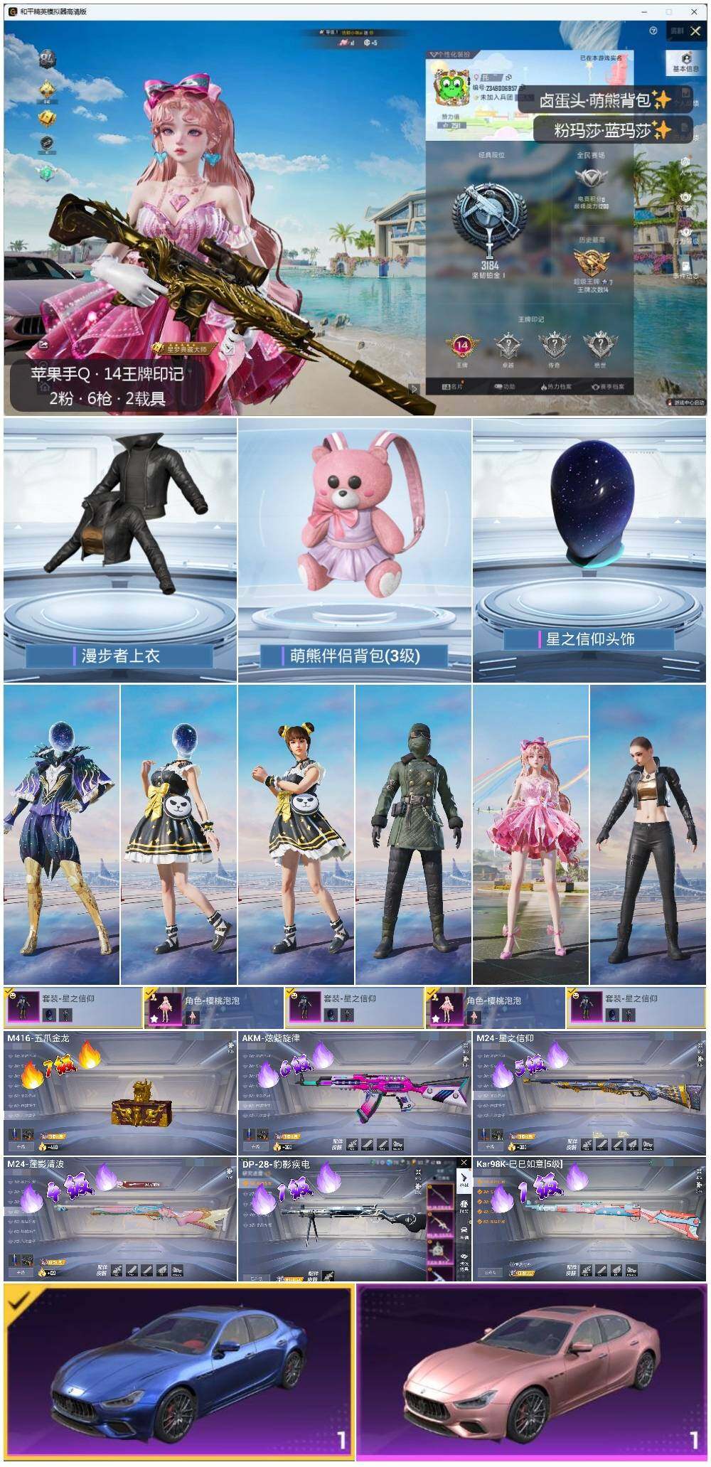 [12748130]【暑期末清货/特价急出/永久包赔】:苹果 手Q-2粉装-6特效枪-2载具-5.6w热力值-14印记-138套装-158枪皮【热门品类】:套装-小丑鱼【稀有载具】:玛莎拉蒂Ghibli(粉),玛莎拉蒂Ghibli(蓝)【特效枪等级】:AKM-炫紫旋律(六级),M416-五爪金龙(七级),Kar98K-巳巳如意(一级),M24-星之信仰(五级),M24-莲影清波(四级),DP-28-豹影疾电(一级)【优质套装】:粉装-星之信仰,角色-樱桃泡泡【优质飞行器】:深海曼妙飞行器