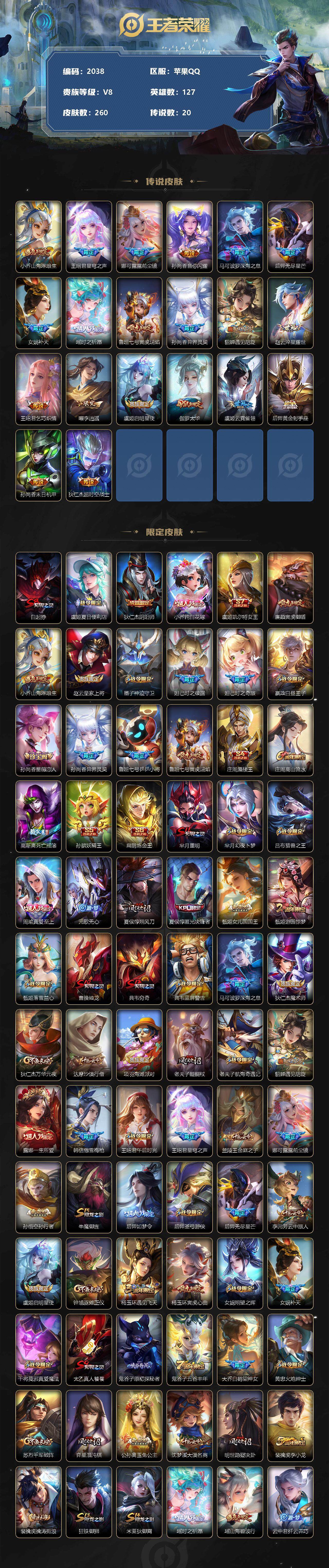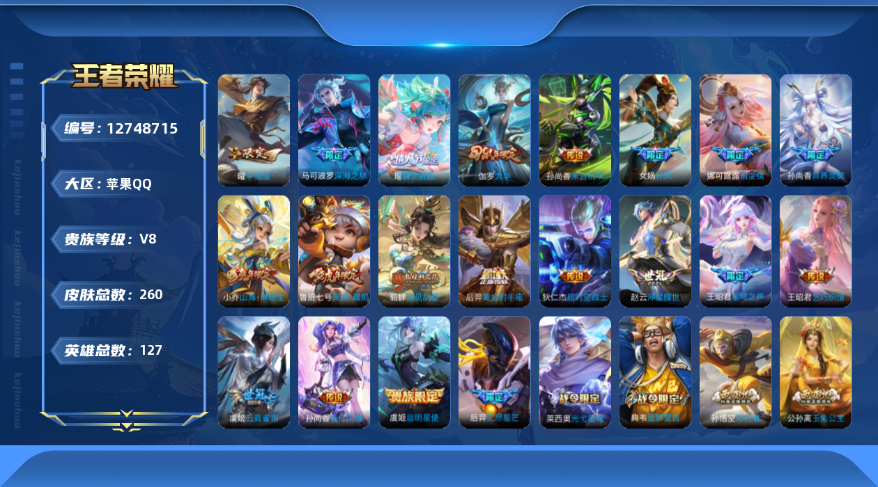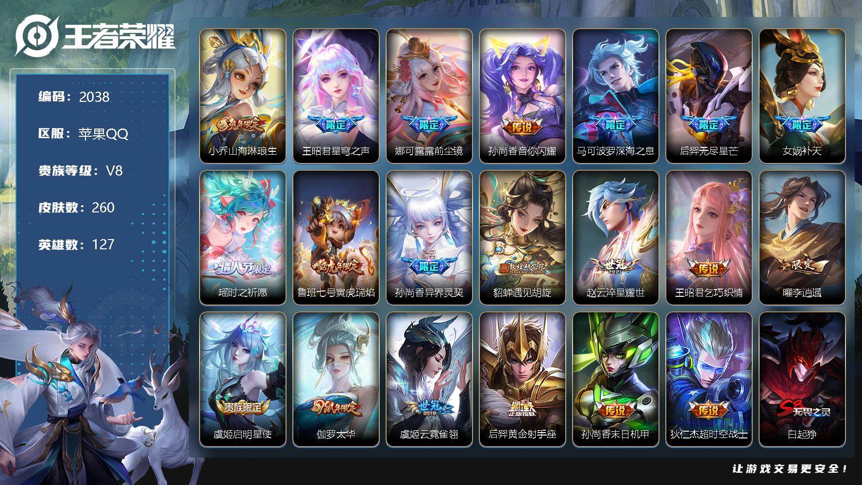 [12748715]苹果Q-V8-荣耀黄金II段位-127英雄-260皮肤-0典藏-0珍品无双-0无双-0珍品传说-20传说-77史诗