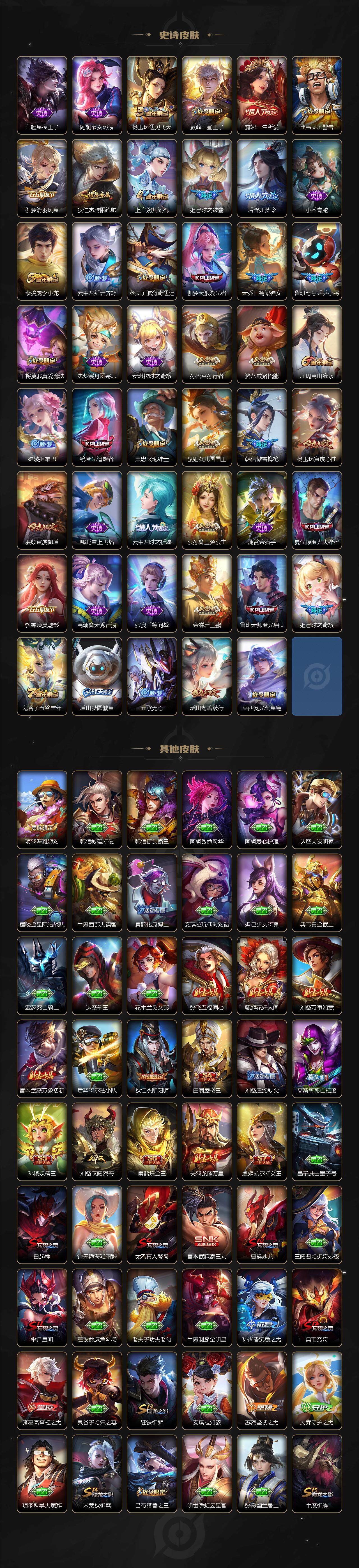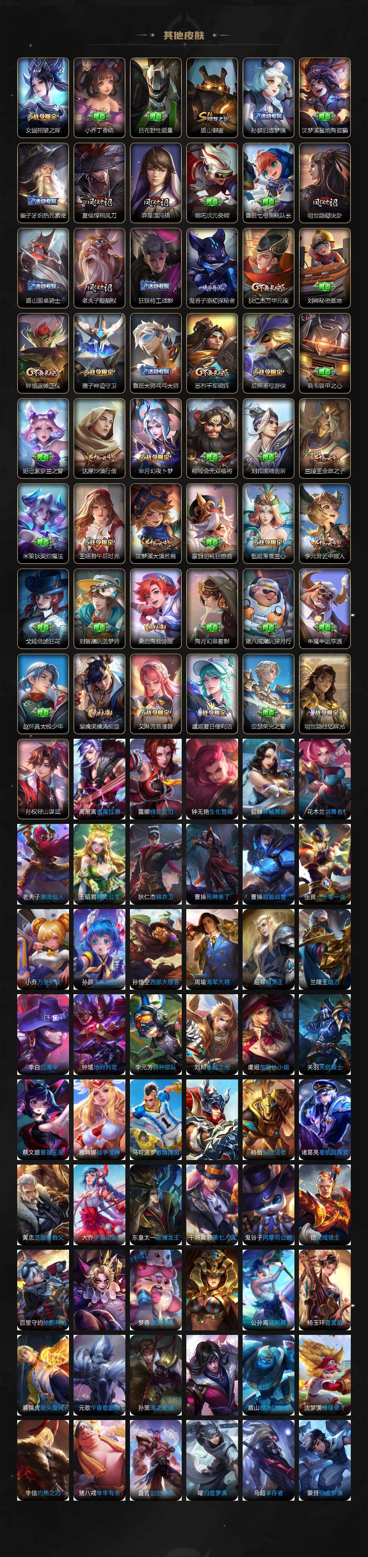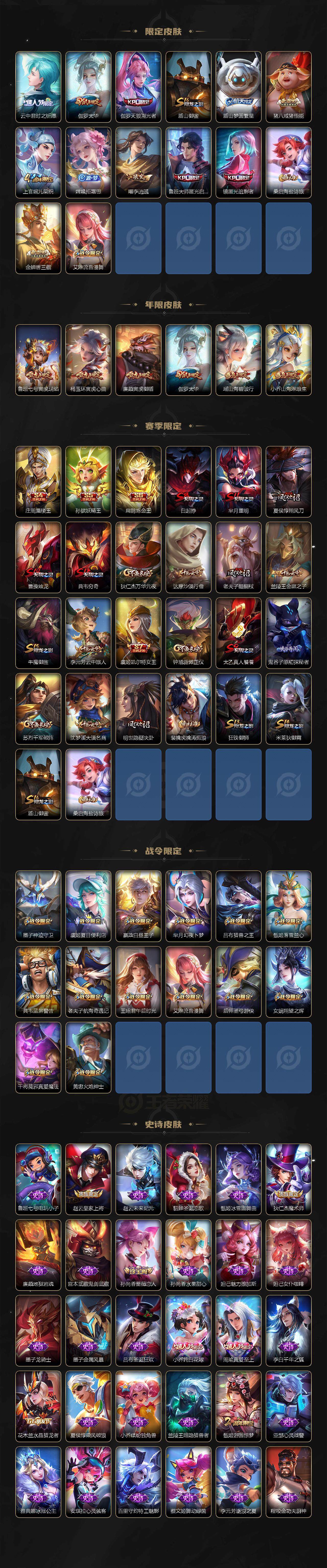 【限定皮肤】:白起狰,虞姬夏日便利店,狄仁杰阴阳师,小乔纯白花嫁,虞姬凯尔特女王,廉颇寅虎御盾,小乔山海琳琅生,赵云皇家上将,墨子神迹守卫,妲己时之彼端,妲己时之奇旅,嬴政白昼王子,孙尚香蔷薇恋人,孙尚香异界灵契,鲁班七号乒乒小将,鲁班七号寅虎瑞焰,庄周蜃楼王,庄周高山流水,高渐离死亡摇滚,孙膑妖精王,扁鹊炼金王,芈月重明,芈月幻夜卜梦,吕布猎兽之王,周瑜真爱至上,元歌无心,夏侯惇朔风刀,夏侯惇匿光决锋者,甄姬女儿国国王,甄姬游园惊梦,甄姬落雪兰心,曹操烛龙,典韦穷奇,典韦蓝屏警告,马可波罗深海之息,狄仁杰魔术师,狄仁杰万华元夜,达摩沙漠行僧,项羽海滩派对,老夫子醍醐杖,老夫子航海奇遇记,貂蝉遇见胡旋,露娜一生所爱,韩信傲雪梅枪,王昭君午后时光,王昭君星穹之声,兰陵王金庭之子,娜可露露前尘镜,孙悟空孙行者,牛魔御旌,后羿如梦令,后羿圣弓游侠,后羿无尽星芒,李元芳云中旅人,虞姬启明星使,钟馗驱傩正仪,杨玉环遇见飞天,杨玉环寅虎心曲,女娲朔望之晖,女娲补天,干将莫邪真爱魔法,太乙真人饕餮,鬼谷子原初探秘者,鬼谷子五谷丰年,大乔白鹤梁神女,黄忠火炮绅士,苏烈千军破阵,弈星混沌棋,公孙离玉兔公主,沈梦溪大漠名商,明世隐疑决卦,裴擒虎李小龙,裴擒虎擒涛扼浪,狂铁御狮,米莱狄御霄,瑶时之祈愿,瑶山海碧波行,云中君纤云弄巧,云中君时之祈愿,伽罗太华,伽罗天狼溯光者,盾山御銮,盾山梦圆繁星,猪八戒猪悟能,上官婉儿梁祝,嫦娥拒霜思,曜李逍遥 ,鲁班大师匿光启智者,镜匿光追影者,桑启海盐诗旅,金蝉唐三藏,艾琳流音漫舞