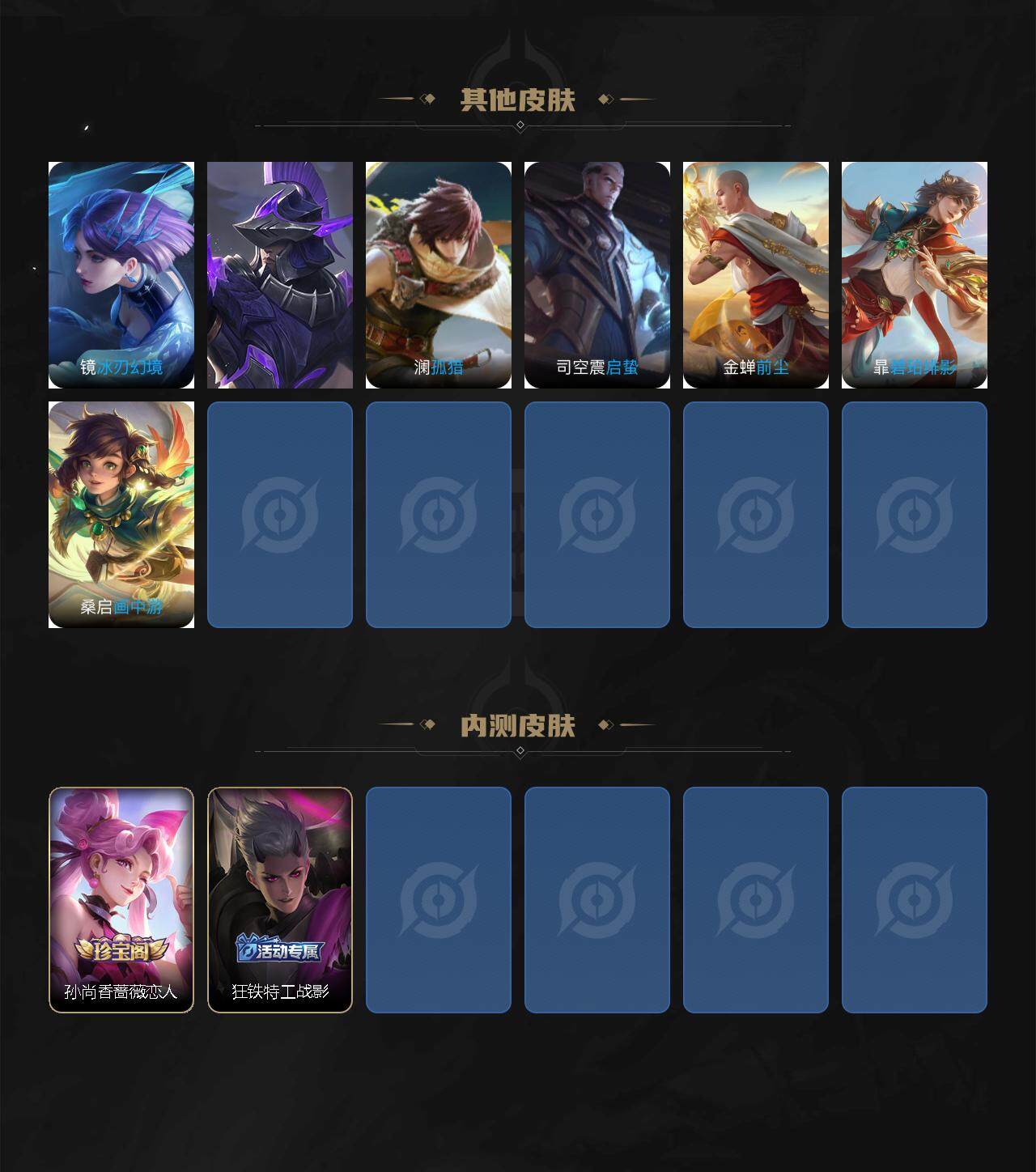 裴擒虎李小龙,上官婉儿梁祝,伽罗太华,伽罗天狼溯光者,小乔纯白花嫁,周瑜真爱至上,露娜一生所爱,后羿如梦令,妲己时之彼端,鲁班七号乒乒小将,大乔白鹤梁神女,猪八戒猪悟能,廉颇寅虎·御盾,孙尚香异界灵契,孙悟空孙行者,甄姬女儿国国王,镜匿光追影者,韩信傲雪梅枪,鲁班七号寅虎·瑞焰,杨玉环寅虎·心曲,云中君时之祈愿,瑶时之祈愿,女娲补天,公孙离玉兔公主,夏侯惇匿光决锋者,后羿无尽星芒,马可波罗深海之息,金蝉唐三藏,娜可露露前尘镜,鲁班大师匿光启智者,妲己时之奇旅,王昭君星穹之声,盾山梦圆繁星,瑶山海·碧波行
