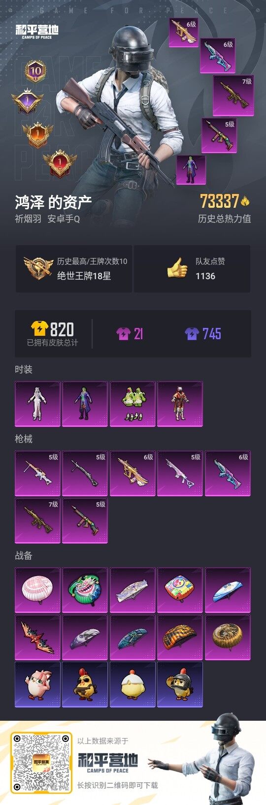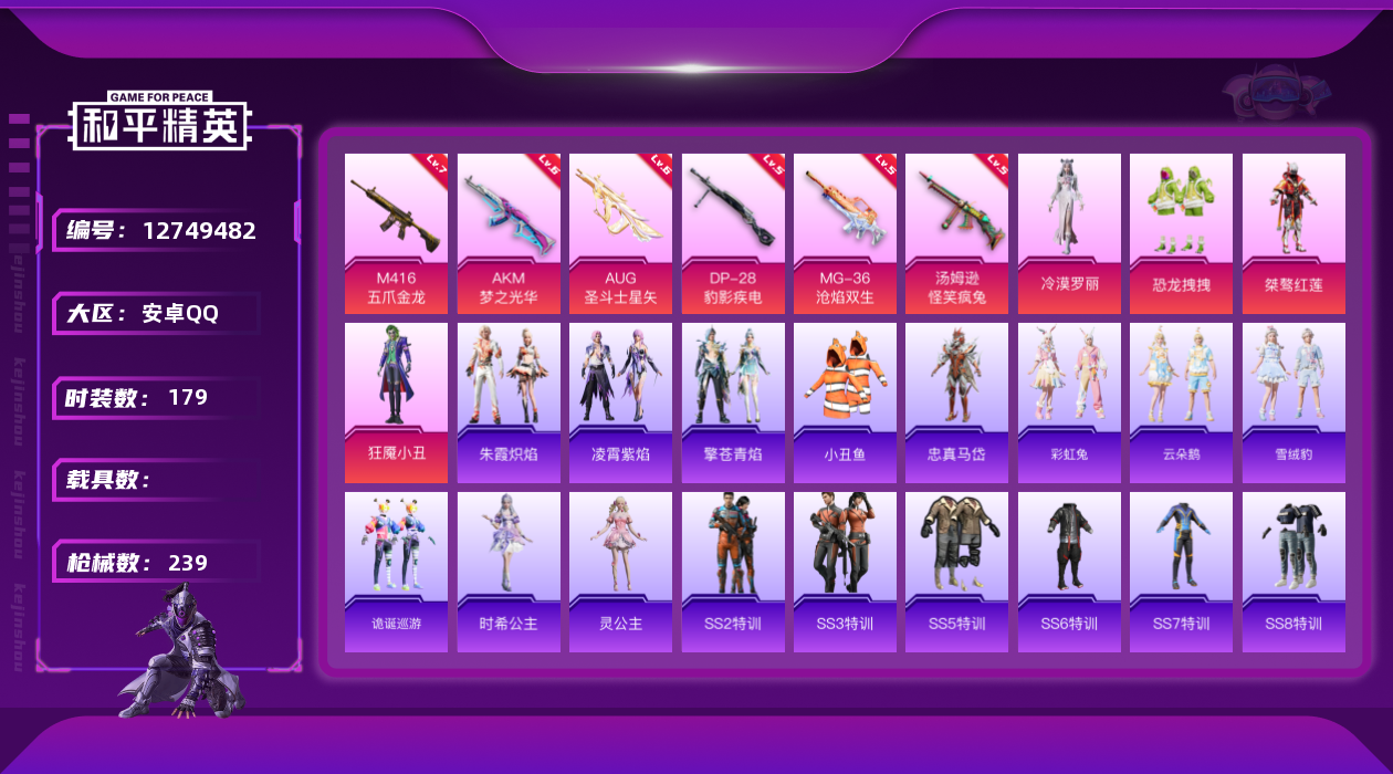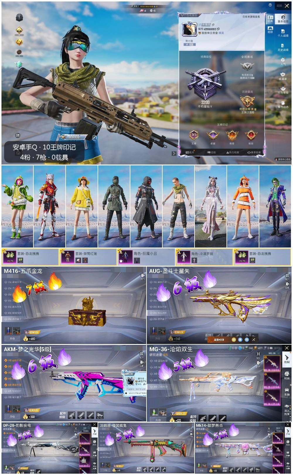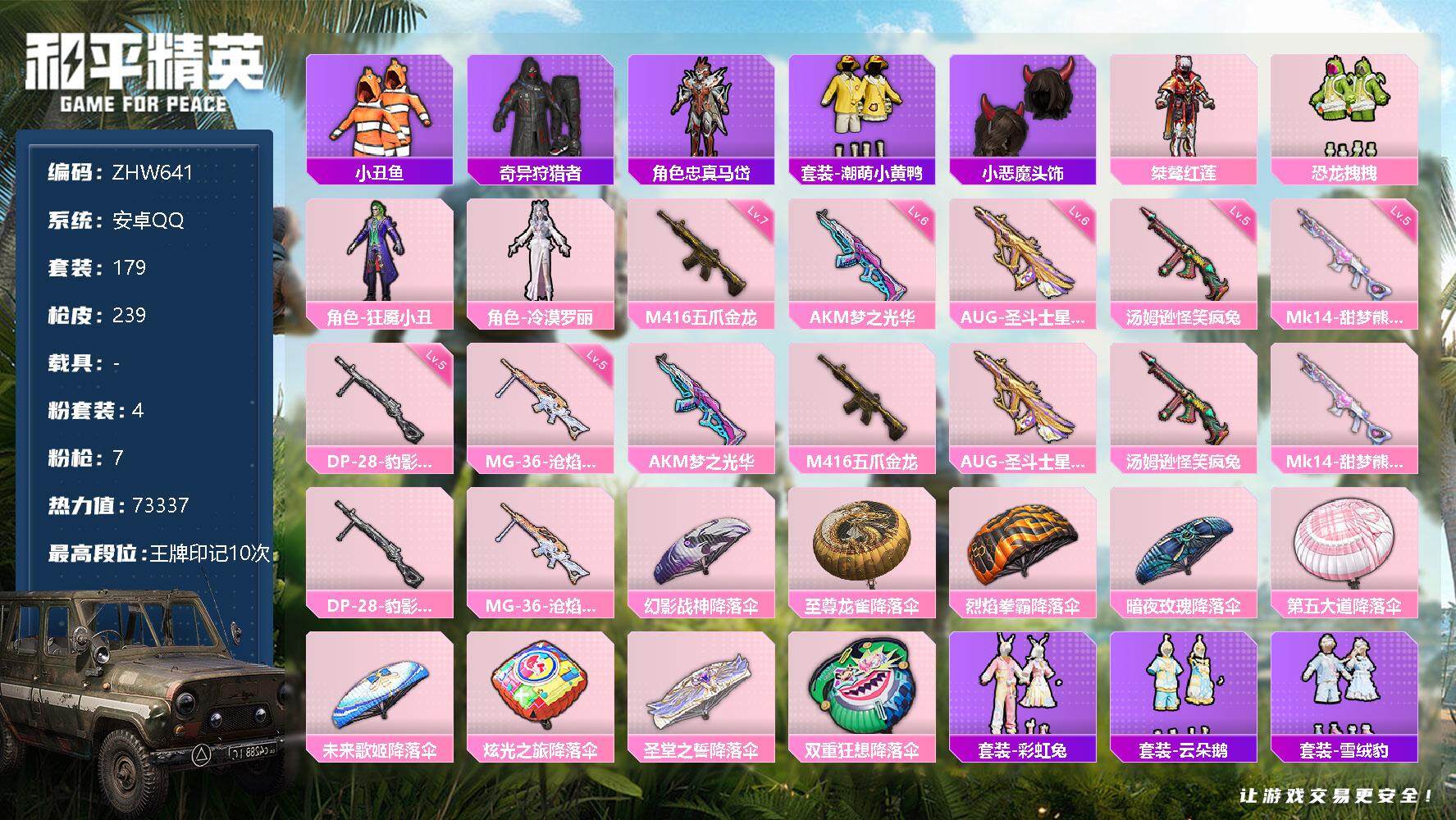 [12749482]绝世印记1/安卓 手Q-4粉装-7特效枪-1粉色飞行器-7.3w热力值-10王牌印记-179套装-239枪皮【热门品类】:套装-小丑鱼,套装-奇异狩猎者,角色-忠真马岱,套装-潮萌小黄鸭,小恶魔头饰【粉色套装】:粉装-桀骜红莲,粉装-恐龙拽拽,角色-狂魇小丑,角色-冷漠罗丽【粉色枪皮等级】:AKM-梦之光华(六级),M416-五爪金龙(七级),AUG-圣斗士星矢(六级),汤姆逊-怪笑疯兔(五级),Mk14-甜梦熊击(五级),DP-28-豹影疾电(五级),MG-36-沧焰双生(五级)