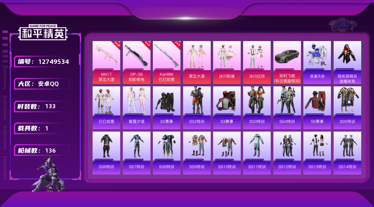 - [12712974]安卓 手Q-3粉装-5特效枪-1载具-5.2w热力值-9王牌印记-128套装-158枪皮【热门品类】:粉装-梦幻火箭,套装-浪漫天命,套装-奇异狩猎者,套装-龟仙人,套装-暗影哥特,套装-粉红小猪【粉色载具】:路特斯ELETRE(冰川蓝)【粉色套装】:粉装-梦幻火箭,粉装-未来歌姬,角色-异瞳寒姬【粉色枪皮等级】:M416-五爪金龙(七级),Kar98K-巳巳如意(五级),AWM-橘柚倾心(五级),Mk14-甜梦熊击(五级),DP-28-豹影疾电(五级)