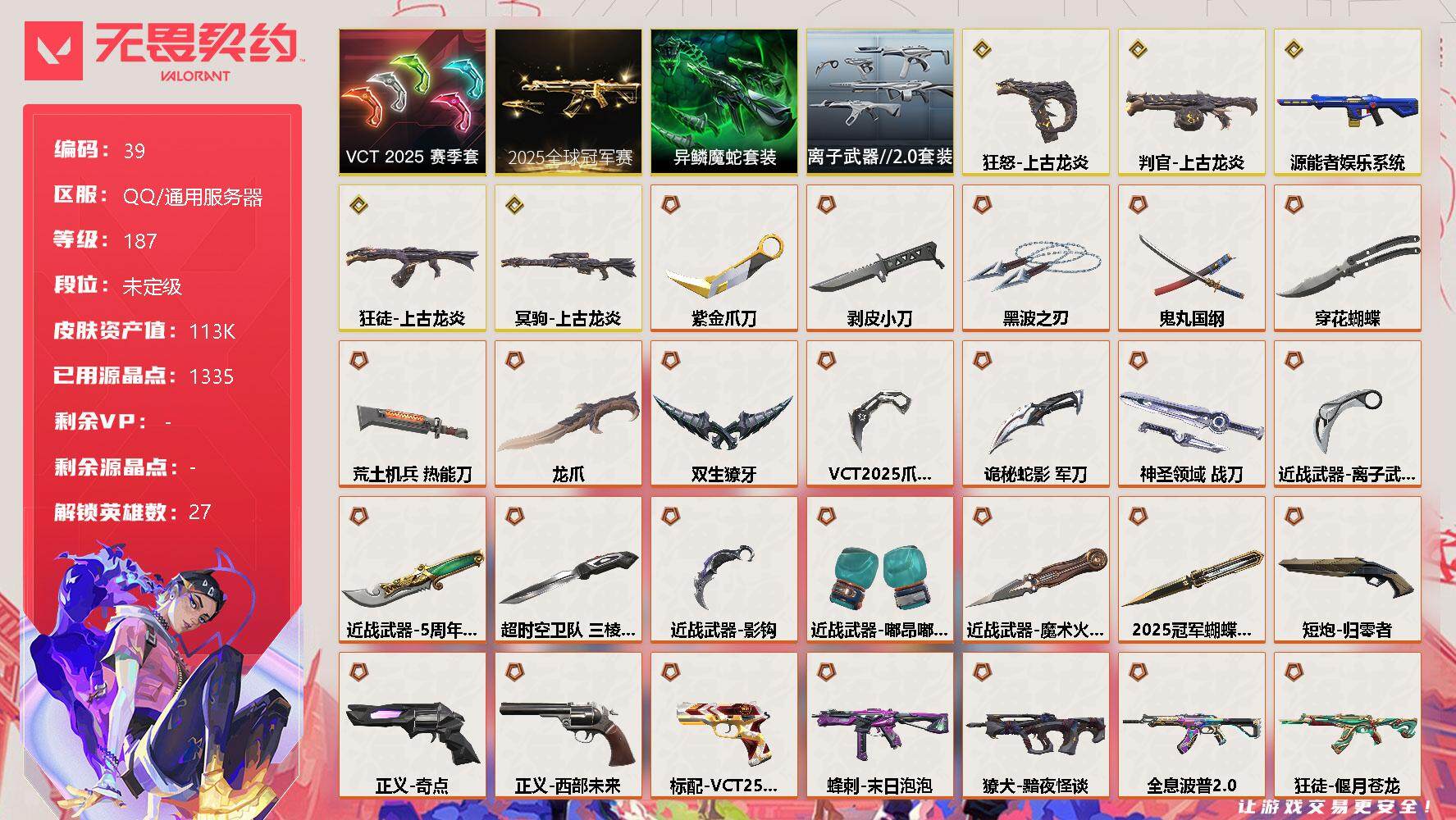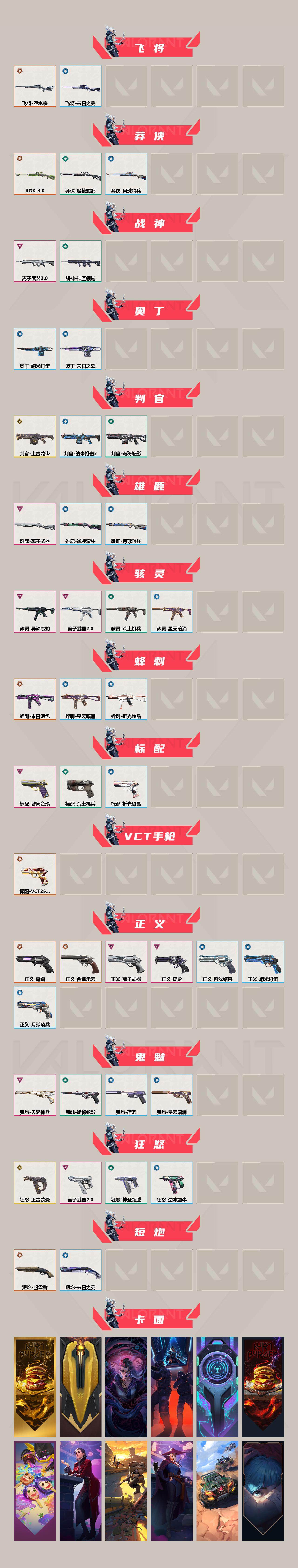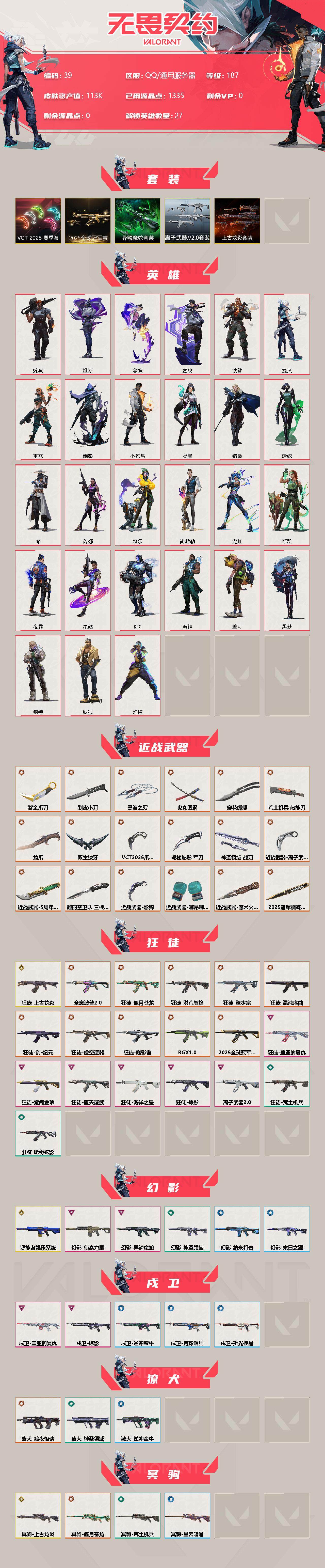 [12750773]【套装】:2025全球冠军赛套装,上古龙炎套装,VCT 2025 赛季套装,异鳞魔蛇套装,离子武器//2.0套装 【英雄】:幻棱,炼狱,维斯,暮蝶,钛狐,壹决,铁臂,捷风,雷兹,幽影,不死鸟,贤者,猎枭,蝰蛇,零,芮娜,奇乐,尚勃勒,霓虹,斯凯,夜露,星礈,K/O,海神,盖可,黑梦,钢锁 【近战 武器】:近战武器-2025全球冠军赛 蝴蝶刀,近战武器-魔术火花,近战武器-嘟昂嘟昂超弹力水球拳套,近战武器-影钩,近战武器-超时空卫队 三棱军刺,近战武器-5周年//公测重制版 苍龙之刃,近战武器-穿花蝴蝶,近战武器-剥皮小刀,近战武器-VCT 2025 爪刀,近战武器-紫金爪刀,近战武器-黑波之刃,近战武器-鬼丸国纲,近战武器-离子武器//2.0 爪刀,近战武器-双生獠牙,近战武器-龙爪,近战武器-荒土机兵 热能刀,近战武器-诡秘蛇影 军刀,近战武器-神圣领域 战刀,近战武器-魔术火花 【狂徒】:狂徒-上古龙炎,狂徒-2025全球冠军赛,狂徒-洪荒怒焰,狂徒-混沌序曲,狂徒-全息波普//2.0,狂徒-塑水宗,狂徒-偃月苍龙,狂徒-创·纪元,狂徒-虚空遗器,狂徒-噬影者,狂徒-RGX 11z Pro,狂徒-堕天遗武,狂徒-掠影,狂徒-盖亚的复仇,狂徒-海洋之星,狂徒-紫阙金琅,狂徒-离子武器//2.0,狂徒-荒土机兵,狂徒-诡秘蛇影 【幻影】:幻影-源能者娱乐系统,幻影-侦察力量,幻影-异鳞魔蛇,幻影-神圣领域,幻影-纳米打击,幻影-末日之翼 【戍卫】:戍卫-掠影,戍卫-盖亚的复仇,戍卫-逆冲蛮牛,戍卫-月球哨兵,戍卫-折光棱晶 【獠犬】:獠犬-黯夜怪谈,獠犬-神圣领域,獠犬-逆冲蛮牛 【冥驹】:冥驹-上古龙炎,冥驹-偃月苍龙,冥驹-荒土机兵,冥驹-星云暗涌 【飞将】:飞将-塑水宗,飞将-末日之翼 【莽侠】:莽侠-RGX 11z Pro//3.0,莽侠-诡秘蛇影,莽侠-月球哨兵 【战神】:战神-离子武器//2.0,战神-神圣领域 【奥丁】:奥丁-纳米打击,奥丁-末日之翼 【判官】:判官-上古龙炎,判官-诡秘蛇影,判官-纳米打击x 【雄鹿】:雄鹿-离子武器,雄鹿-逆冲蛮牛,雄鹿-月球哨兵 【骇灵】:骇灵-异鳞魔蛇,骇灵-离子武器//2.0,骇灵-荒土机兵,骇灵-星云暗涌 【蜂刺】:蜂刺-末日泡泡,蜂刺-星云暗涌,蜂刺-折光棱晶 【标配】:标配-紫阙金琅,标配-荒土机兵,标