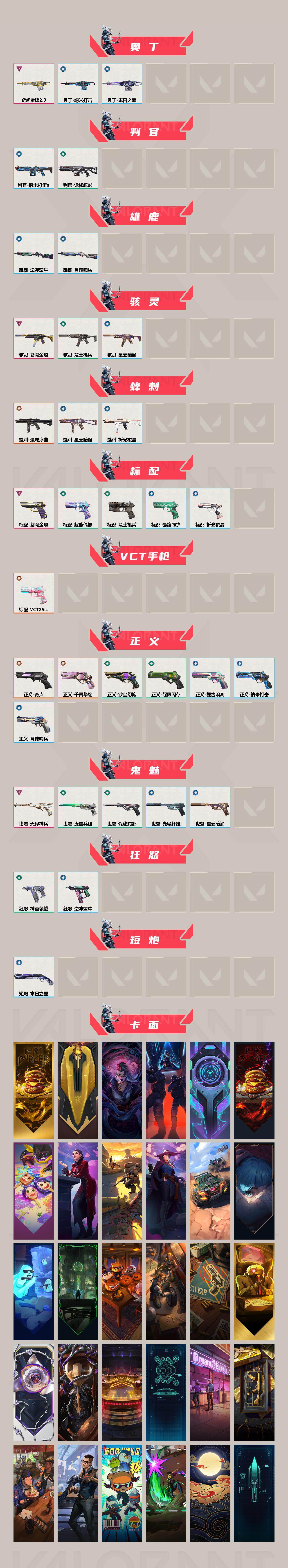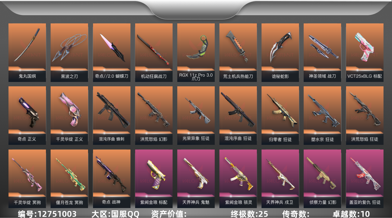 [12751003]【套装】:2025全球冠军赛套装 【英雄】:幻棱,炼狱,维斯,暮蝶,钛狐,壹决,铁臂,捷风,雷兹,幽影,不死鸟,贤者,猎枭,蝰蛇,零,芮娜,奇乐,尚勃勒,霓虹,斯凯,夜露,星礈,K/O,海神,盖可,黑梦,钢锁 【近战 武器】:近战武器-2025全球冠军赛 蝴蝶刀,近战武器-奇点//2.0 蝴蝶刀,近战武器-RGX 11z Pro//3.0 爪刀,近战武器-黑波之刃,近战武器-鬼丸国纲,近战武器-荒土机兵 热能刀,近战武器-机动狂飙 战刀,近战武器-诡秘蛇影 军刀,近战武器-神圣领域 战刀 【狂徒】:狂徒-2025全球冠军赛,狂徒-归零者,狂徒-洪荒怒焰,狂徒-混沌序曲,狂徒-塑水宗,狂徒-光荣异象,狂徒-堕天遗武,狂徒-掠影,狂徒-盖亚的复仇,狂徒-紫阙金琅,狂徒-荒土机兵,狂徒-诡秘蛇影 【幻影】:幻影-洪荒怒焰,幻影-侦察力量,幻影-神圣领域,幻影-纳米打击,幻影-末日之翼 【戍卫】:戍卫-天界神兵,戍卫-逆冲蛮牛,戍卫-月球哨兵,戍卫-折光棱晶 【獠犬】:獠犬-神圣领域,獠犬-逆冲蛮牛 【冥驹】:冥驹-千灵华绽,冥驹-偃月苍龙,冥驹-荒土机兵,冥驹-星云暗涌 【飞将】:飞将-末日之翼 【莽侠】:莽侠-诡秘蛇影,莽侠-月球哨兵 【战神】:战神-奇点,战神-神圣领域 【奥丁】:奥丁-紫阙金琅//2.0,奥丁-纳米打击,奥丁-末日之翼 【判官】:判官-诡秘蛇影,判官-纳米打击x 【雄鹿】:雄鹿-逆冲蛮牛,雄鹿-月球哨兵 【骇灵】:骇灵-紫阙金琅,骇灵-荒土机兵,骇灵-星云暗涌 【蜂刺】:蜂刺-混沌序曲,蜂刺-星云暗涌,蜂刺-折光棱晶 【标配】:标配-紫阙金琅,标配-超能偶像,标配-荒土机兵,标配-最终庇护,标配-折光棱晶 【VCT手枪】:标配-VCT25 x BLG 【正义】:正义-奇点,正义-千灵华绽,正义-超限闪存,正义-沙尘幻旅,正义-复古浪潮,正义-纳米打击,正义-月球哨兵 【鬼魅】:鬼魅-天界神兵,鬼魅-流星兵团,鬼魅-诡秘蛇影,鬼魅-光导纤维,鬼魅-星云暗涌 【狂怒】:狂怒-神圣领域,狂怒-逆冲蛮牛 【短炮】:短炮-末日之翼 【卡面】:终章:激斗汉堡 卡面,进入射程 卡面,分崩离析 卡面,纳米打击 卡面,抑制技术 卡面,激斗汉堡 卡面,瓦娃脸雪糕 P2 卡面,从黄昏到黎明 卡面,荒土机兵 卡面,银弹猎手 卡面,逆冲蛮牛 卡面,《双城之战》拥抱 卡面,精