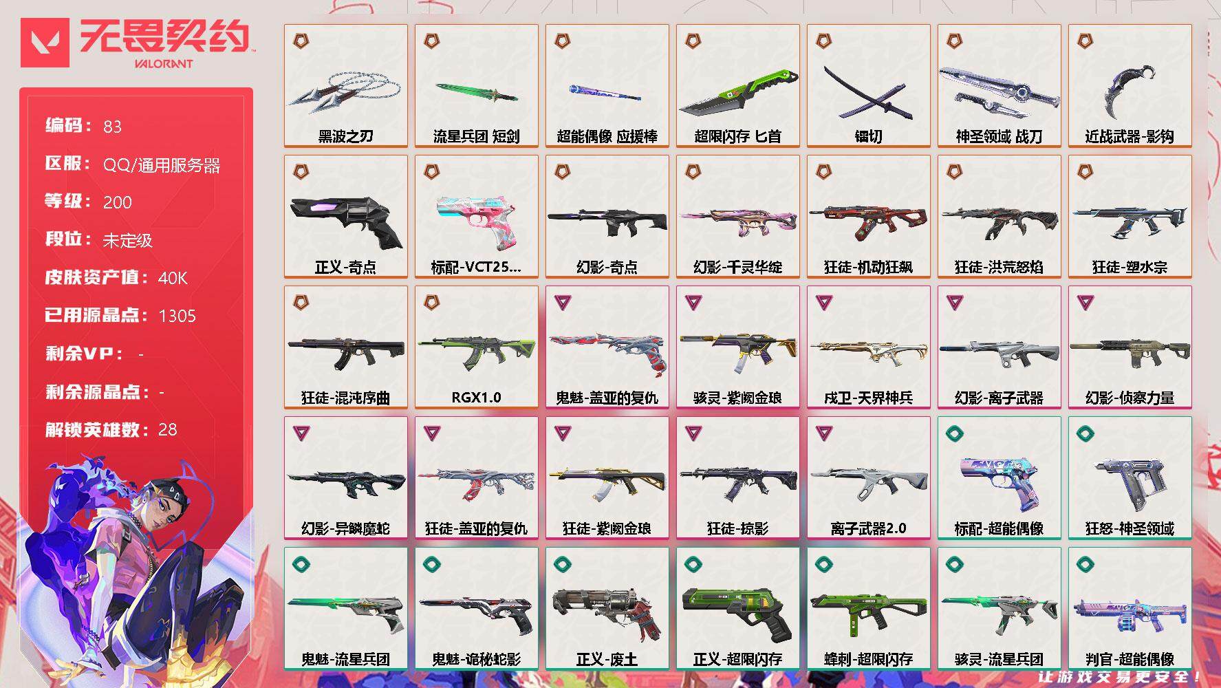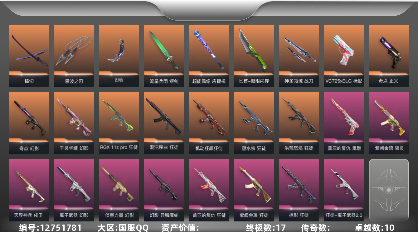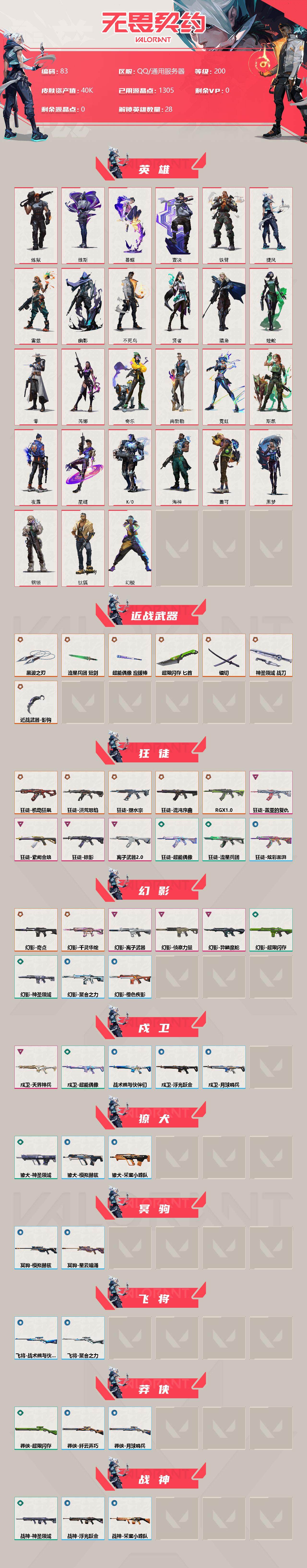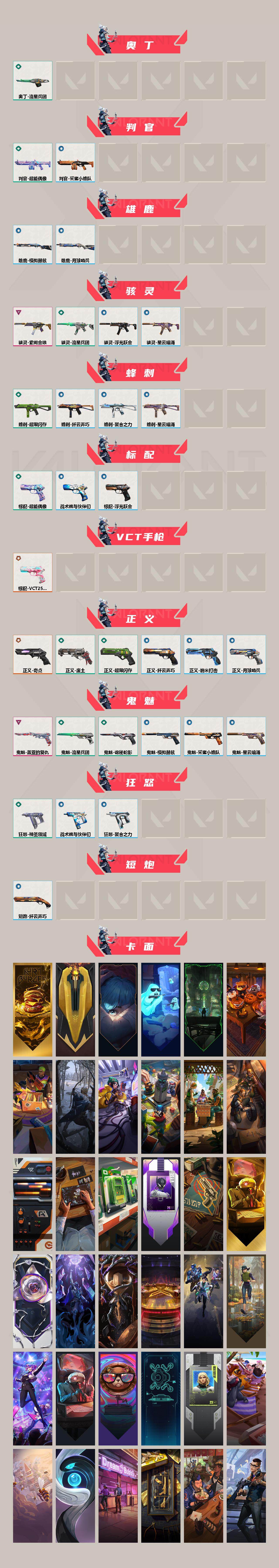 [12751781]【英雄】:幻棱,炼狱,维斯,暮蝶,钛狐,壹决,铁臂,捷风,雷兹,幽影,不死鸟,贤者,猎枭,蝰蛇,零,芮娜,奇乐,尚勃勒,霓虹,斯凯,夜露,星礈,K/O,海神,盖可,黑梦,钢锁 【近战 武器】:近战武器-影钩,近战武器-黑波之刃,近战武器-镭切,近战武器-流星兵团 短剑,近战武器-超能偶像 应援棒,近战武器-超限闪存 匕首,近战武器-神圣领域 战刀 【狂徒】:狂徒-洪荒怒焰,狂徒-混沌序曲,狂徒-机动狂飙,狂徒-塑水宗,狂徒-RGX 11z Pro,狂徒-掠影,狂徒-盖亚的复仇,狂徒-紫阙金琅,狂徒-离子武器//2.0,狂徒-超能偶像,狂徒-流星兵团,狂徒-炫彩澎湃 【幻影】:幻影-奇点,幻影-千灵华绽,幻影-离子武器,幻影-侦察力量,幻影-异鳞魔蛇,幻影-超限闪存,幻影-神圣领域,幻影-橙色疾影,幻影-聚合之力 【戍卫】:戍卫-天界神兵,戍卫-超能偶像,戍卫-浮光跃金,戍卫-战术熊与伙伴们,戍卫-月球哨兵 【獠犬】:獠犬-神圣领域,獠犬-采蜜小蜂队,獠犬-模拟赫兹 【冥驹】:冥驹-模拟赫兹,冥驹-星云暗涌 【飞将】:飞将-聚合之力,飞将-战术熊与伙伴们 【莽侠】:莽侠-超限闪存,莽侠-纤云弄巧,莽侠-月球哨兵 【战神】:战神-神圣领域,战神-采蜜小蜂队,战神-浮光跃金 【奥丁】:奥丁-流星兵团 【判官】:判官-超能偶像,判官-采蜜小蜂队 【雄鹿】:雄鹿-模拟赫兹,雄鹿-月球哨兵 【骇灵】:骇灵-紫阙金琅,骇灵-流星兵团,骇灵-浮光跃金,骇灵-星云暗涌 【蜂刺】:蜂刺-超限闪存,蜂刺-聚合之力,蜂刺-纤云弄巧,蜂刺-星云暗涌 【标配】:标配-超能偶像,标配-浮光跃金,标配-战术熊与伙伴们 【VCT手枪】:标配-VCT25 x BLG 【正义】:正义-奇点,正义-超限闪存,正义-废土,正义-纳米打击,正义-纤云弄巧,正义-月球哨兵 【鬼魅】:鬼魅-盖亚的复仇,鬼魅-流星兵团,鬼魅-诡秘蛇影,鬼魅-采蜜小蜂队,鬼魅-模拟赫兹,鬼魅-星云暗涌 【狂怒】:狂怒-神圣领域,狂怒-聚合之力,狂怒-战术熊与伙伴们 【短炮】:短炮-纤云弄巧 【卡面】:终章:激斗汉堡 卡面,进入射程 卡面,《双城之战》拥抱 卡面,精灵大战 卡面,欢迎来到底城 卡面,南瓜盛典 卡面,唱片的故事 卡面,钢弓与箭弦 卡面,排除故障 卡面,战术桌游 卡面,悠享食光 卡面,修车达人 卡面,模拟赫兹 卡面,浮光