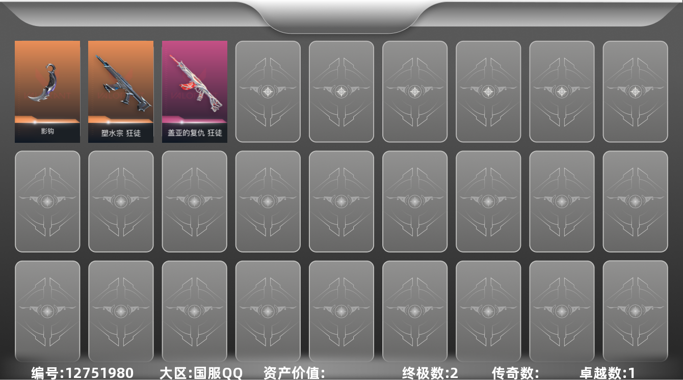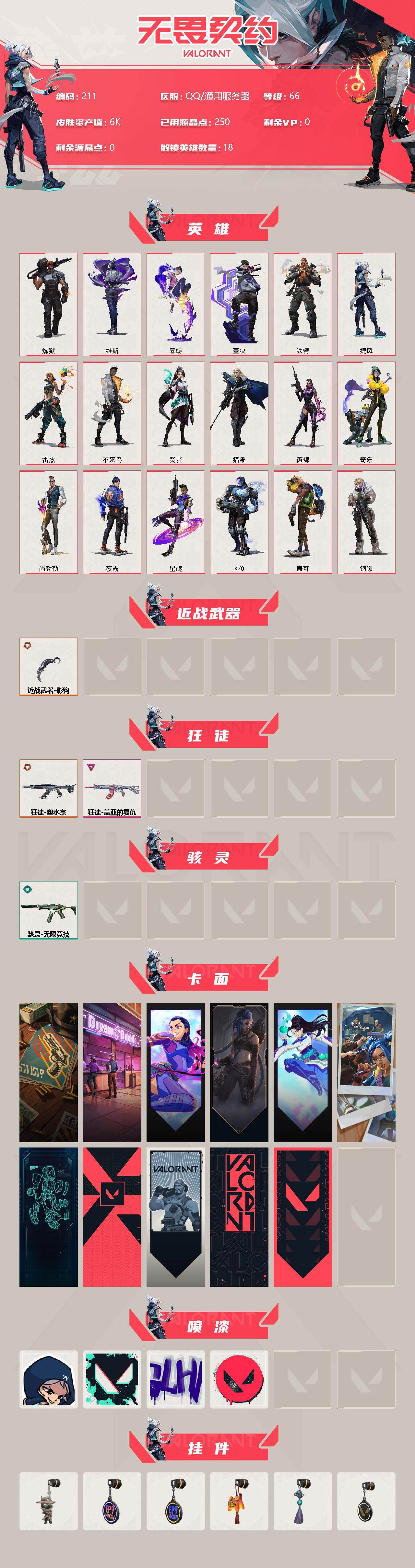 [12751980]【英雄】:炼狱,维斯,暮蝶,壹决,铁臂,捷风,雷兹,不死鸟,贤者,猎枭,芮娜,奇乐,尚勃勒,夜露,星礈,K/O,盖可,钢锁 【近战 武器】:近战武器-影钩 【狂徒】:狂徒-塑水宗,狂徒-盖亚的复仇 【骇灵】:骇灵-无限竞技 【卡面】:正义的化身 卡面,梦幻奶茶 卡面,无畏契约GO!第一卷:芮娜 卡面,《双城之战》金克丝 卡面,无畏契约GO!第一卷:贤者 卡面,纪念照 P2 卡面,铁臂设计图 卡面,代号红色 卡面,新兵报到 卡面,V契约 卡面,无畏契约 卡面 【喷漆】:捷风差距 喷漆,胜利属于无畏契约 喷漆,GLHF 喷漆,无畏契约 喷漆 【挂饰】:无畏契约GO!第一卷 零 挂饰,第九季//第二幕 纪念币 挂饰,第九季//第一幕 纪念币 挂饰,好运福爪 挂饰,幸运中国结 挂饰,无畏契约 纪念币 挂饰
