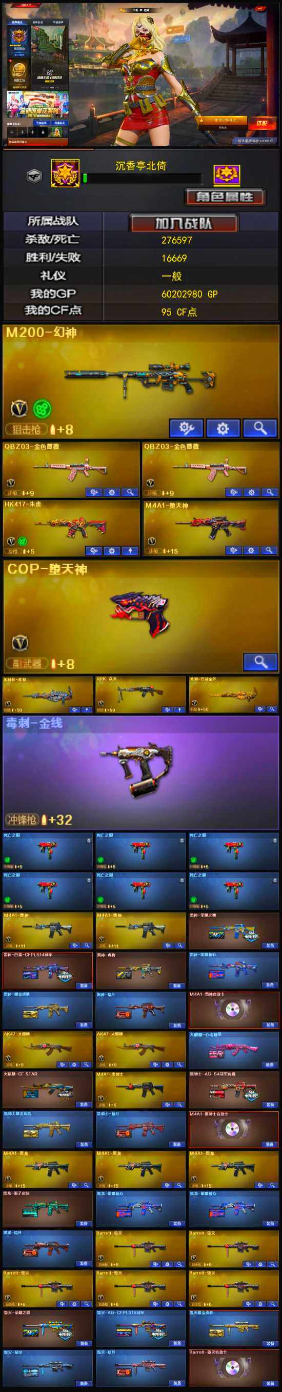 【热门武器】:QBZ03-金色蔷薇*2,HK417-朱雀,M200-幻神,死亡之眼*6,荣耀世冠-火麒麟,C.A.T,M4A1-黑骑士,RPK-盘龙,加特林-炼狱,降世魔童,COP-堕天神,沙鹰-修罗*6