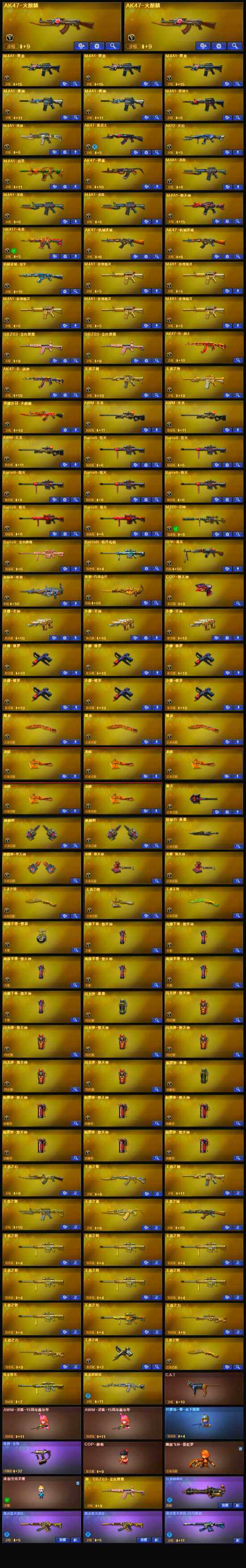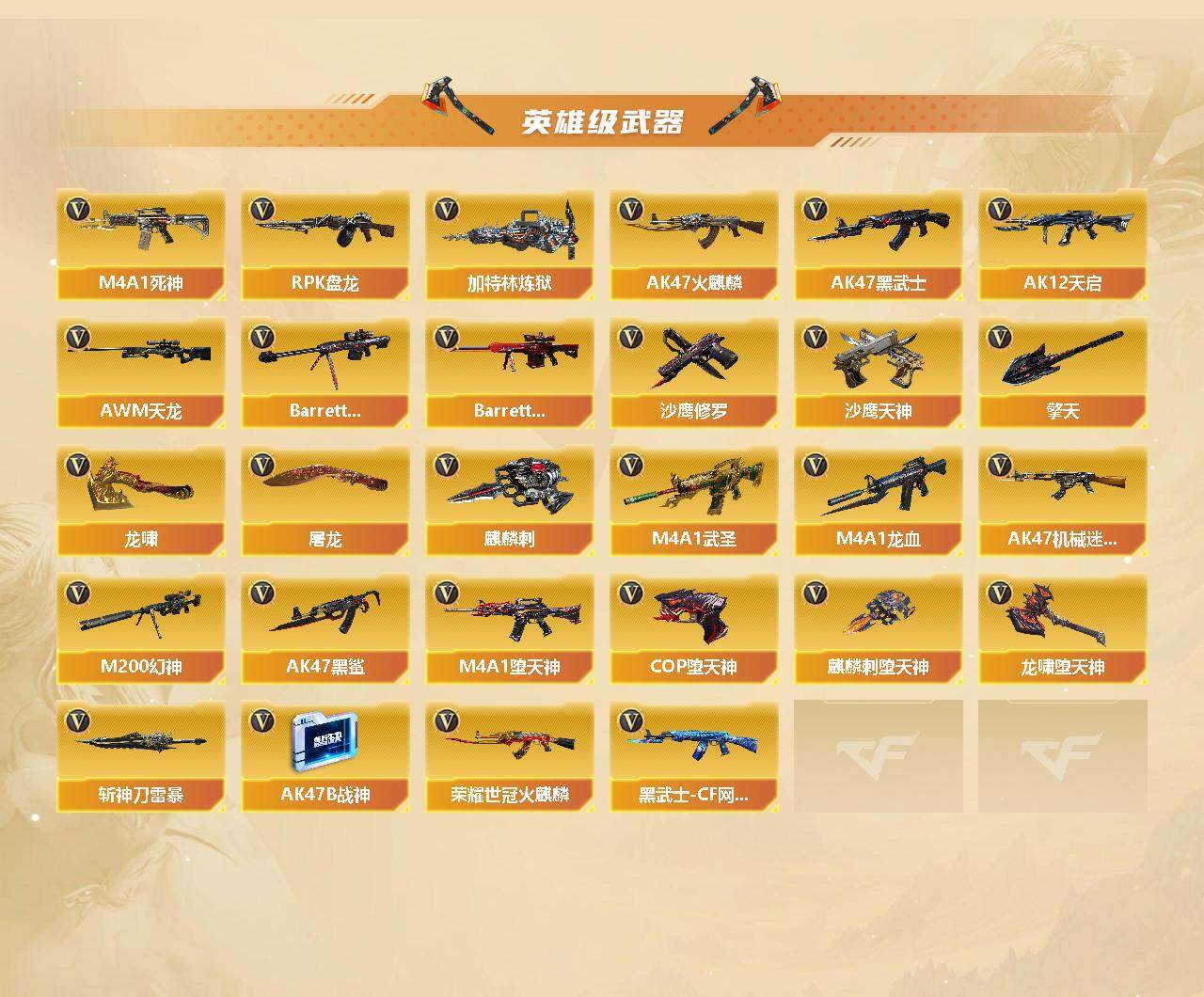 【英雄级武器】:M4A1-堕天神,COP-堕天神,麒麟刺-堕天神,龙啸-堕天神*2,斩神刀-雷暴,M4A1-武圣,荣耀世冠-火麒麟,黑武士-CF网剧冠军,QBZ03-金色蔷薇*2,HK417-朱雀,M4A1-雷神*2,M4A1-黑龙*3,M4A1-玫瑰精灵*5,M4A1-黑骑士,M4A1-死神,RPK-盘龙,加特林-炼狱,AK47-火麒麟*2,AK47-黑武士,AK12-天启,AWM-天龙*3,Barrett-毁灭*5,Barrett-极光*2,M4A1-龙血*3,AK47-机械迷城*2,M200-幻神,AK47-黑鲨,AK47-B-战神,沙鹰-天神*3,沙鹰-修罗*6,麒麟刺*2,擎天,龙啸*5,屠龙*3