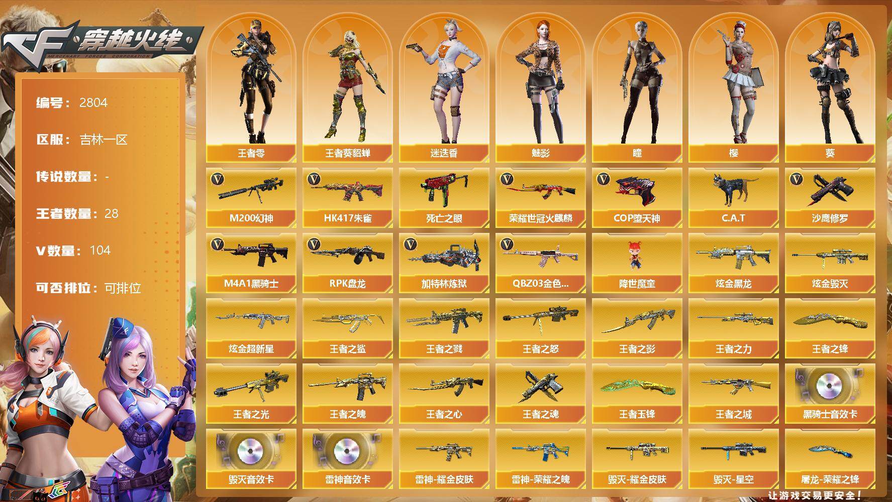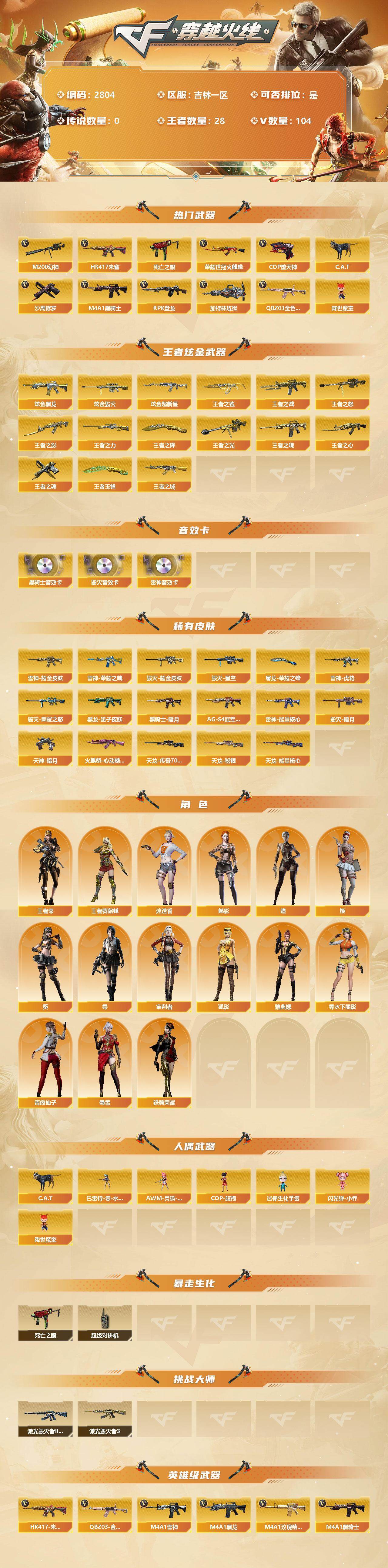 [12753577]吉林一区-104V-28王者-3炫金 【热门武器】:QBZ03-金色蔷薇*2,HK417-朱雀,M200-幻神,死亡之眼*6,荣耀世冠-火麒麟,C.A.T,M4A1-黑骑士,RPK-盘龙,加特林-炼狱,降世魔童,COP-堕天神,沙鹰-修罗*6 【王者炫金武器】:炫金黑龙,炫金毁灭,炫金超新星,王者之城,王者之鲨,王者之戮,王者之光,王者之影,王者之怒*7,王者之力*2,王者之魄,王者之心,王者之魂,王者之锋,王者玉锋 【音效卡】:M4A1-雷神音效卡,M4A1-黑骑士音效卡,Barrett-毁灭音效卡 【稀有皮肤】:雷神-能量核心,雷神-荣耀之魄,雷神-虎将,雷神-耀金皮肤,火麒麟-心动糖果,黑骑士-暗月,黑骑士-AG-S4冠军典藏,黑龙-墨子皮肤,毁灭-暗月,毁灭-荣耀之怒,毁灭耀金皮肤,毁灭-星空,天龙-秘银,天龙-能量核心,AWM-天龙-传奇70KG,天神-暗月,屠龙-荣耀之锋*2 【角色】:王者-葵-貂蝉,王者-零,雅典娜,狐影,零-水下丽影,审判者,零,葵,樱,瞳,魅影,迷迭香,蜀雪,铁骑荣耀,青霞仙子 【人偶武器】:降世魔童,巴雷特-零-水下丽影,AWM-灵狐-15周年嘉年华*2,COP-旗袍,C.A.T,迷你生化手雷,闪光弹-小乔 【暴走生化】:死亡之眼*6,超级对讲机 【挑战大师】:激光毁灭者III*2,激光毁灭者III-白马银枪 【英雄级武器】:M4A1-堕天神,COP-堕天神,麒麟刺-堕天神,龙啸-堕天神*2,斩神刀-雷暴,M4A1-武圣,荣耀世冠-火麒麟,黑武士-CF网剧冠军,QBZ03-金色蔷薇*2,HK417-朱雀,M4A1-雷神*2,M4A1-黑龙*3,M4A1-玫瑰精灵*5,M4A1-黑骑士,M4A1-死神,RPK-盘龙,加特林-炼狱,AK47-火麒麟*2,AK47-黑武士,AK12-天启,AWM-天龙*3,Barrett-毁灭*5,Barrett-极光*2,M4A1-龙血*3,AK47-机械迷城*2,M200-幻神,AK47-黑鲨,AK47-B-战神,沙鹰-天神*3,沙鹰-修罗*6,麒麟刺*2,擎天,龙啸*5,屠龙*3 【特殊枪械】:1黑骑士,1盘龙,1炼狱