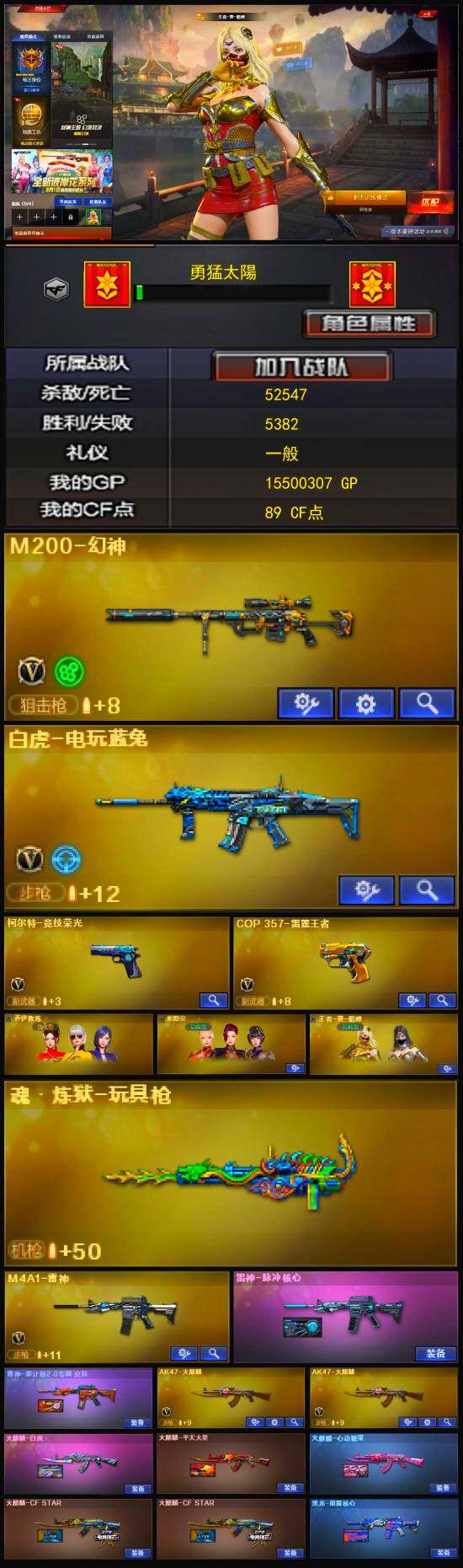- [13688985]山东一区-23V-3王者-0炫金 【传说武器】:传说圣灵 【热门武器】:传说圣灵,QBZ03-金色蔷薇,M200-幻神,M4A1-黑骑士,沙鹰-修罗 【王者炫金武器】:王者之圣 【音效卡】:M4A1-黑骑士音效卡,炼狱-百战金芒-庆典舞曲音效卡 【皮肤】:幻神-动感闪耀 皮肤,雷神-诺拉 皮肤,M4A1-再燃火线,火麒麟-轻羽皮肤,毁灭-秦师 皮肤,M4A1-千变-孔明皮肤,AK47-B-常胜将军-曹操*2,AK47-B-常胜将军-刘备,AK47-B-常胜将军-孙权,轻型军用手斧-再燃火线,擎天-秘银 【角色】:雪域霜狐,乔伊教练,云海玲珑,暗夜-X,疾风,兰-海滩派对,麻雀,娜塔莉娅,潘多拉-X,青霞仙子,斯沃特-X,蜀雪,雪莉杨,影武者-X,职业选手 【人偶武器】:迷你裂空之翼,闪光弹-貂蝉,高爆手雷-大乔,灵狐娃娃手雷 【暴走生化】:超级对讲机 【挑战大师】:神圣爆裂者III,激光毁灭者III 【英雄级武器】:AK47-火麒麟,M4A1-雷神,M4A1-黑骑士,AK47-无影,AK47-黑鲨,无影-神兵利器,QBZ03-金色蔷薇,M4A1-猎神,AK47-B-常胜将军,Barrett-毁灭,Barrett-极光,M200-幻神,炼狱-百战金芒,沙鹰-修罗,擎天,麒麟刺-百战金芒,王者之击-觉醒版,高爆手雷-幻灵,M4A1-赤狱骑士 【道具】:BS战队炫彩背包,XROCK炫彩背包,战舰背包,百战金芒炫彩背包,超级背包,雪域霜狐炫彩背包,女皇终结者-魔龙之吻,救世主-黑桃战神,绿色巨人,灵魂忍者,迷雾幽灵,夺命之镰,防化服*3,金色流光-枪王排位*2,星辰流光-枪王排位,枪王排位28赛季金色流光,枪王排位29赛季金色流光,语音特效-盛典烟火,语音特效-怀旧,雪域霜狐表情,萌萌小葵表情,CFPL选手表情-第2套,防弹头盔*4,防弹衣*4,C4工具钳*3,手雷包*3 【特殊枪械】:1黑骑士