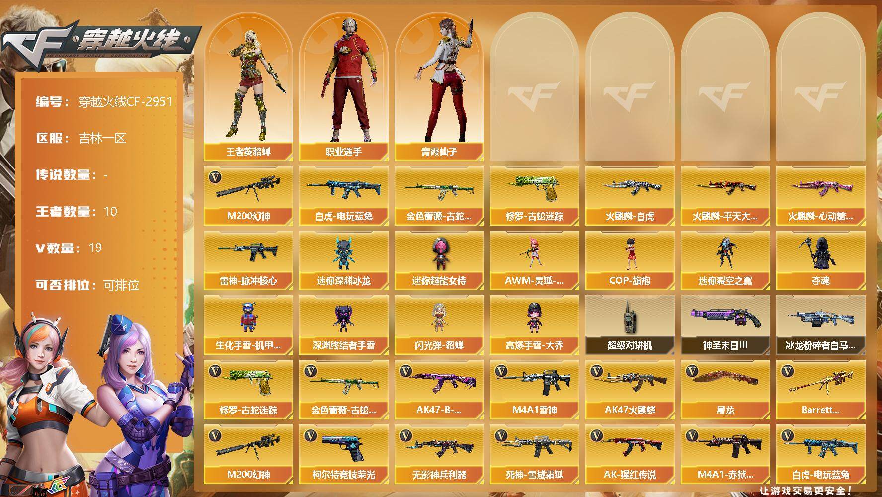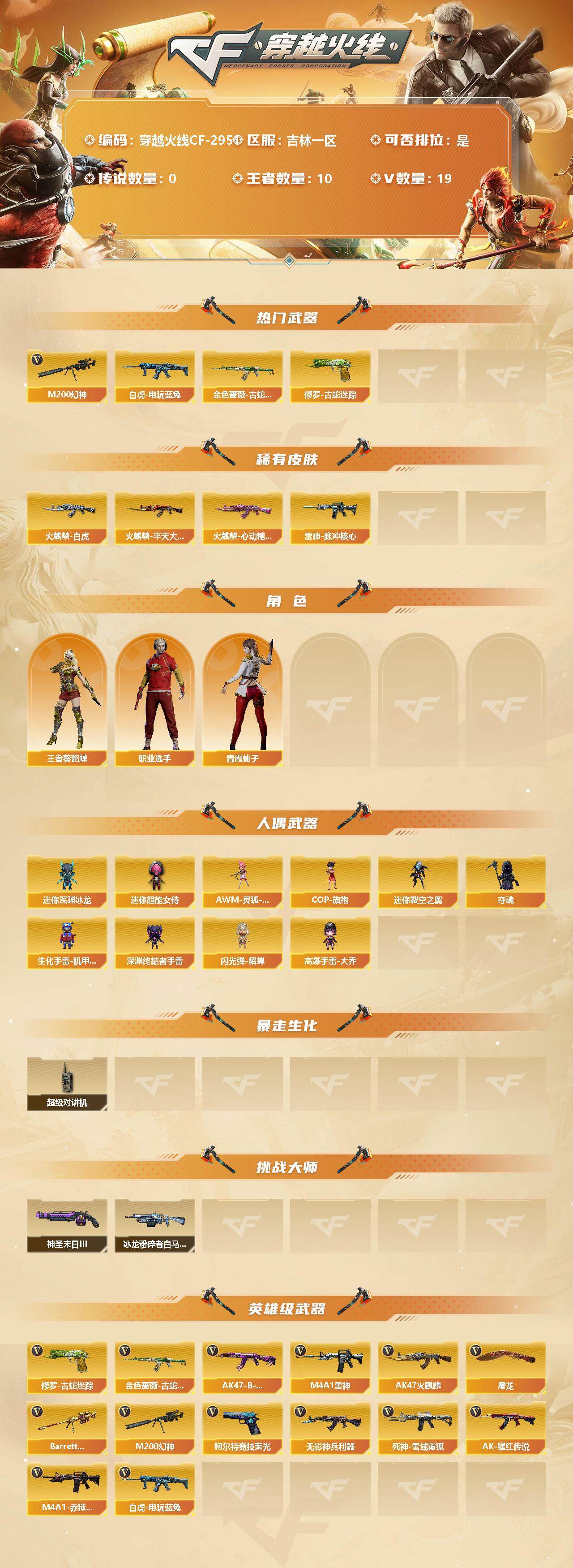 [12754037]吉林一区-19V-10王者-0炫金 【热门武器】:M200-幻神,金色蔷薇-古蛇迷踪,修罗-古蛇迷踪,白虎-电玩蓝兔 【稀有皮肤】:雷神-脉冲核心,火麒麟-平天大圣,火麒麟-白虎,火麒麟-心动糖果 【角色】:王者-葵-貂蝉,职业选手,青霞仙子 【人偶武器】:AWM-灵狐-15周年嘉年华*2,COP-旗袍,迷你深渊冰龙,迷你超能女侍,迷你裂空之翼,夺魂,生化手雷-机甲核心,深渊终结者手雷,闪光弹-貂蝉,高爆手雷-大乔 【暴走生化】:超级对讲机 【挑战大师】:神圣爆裂者-末日III,冰龙粉碎者-白马银枪 【英雄级武器】:柯尔特-竞技荣光,金色蔷薇-古蛇迷踪,白虎-电玩蓝兔,无影-神兵利器,M4A1-雷神,AK47-火麒麟*2,Barrett-朱雀,M200-幻神,死神-雪域霜狐,AK-47-猩红传说,AK47-B-常胜将军,M4A1-赤狱骑士,修罗-古蛇迷踪,屠龙 【特殊枪械】:
