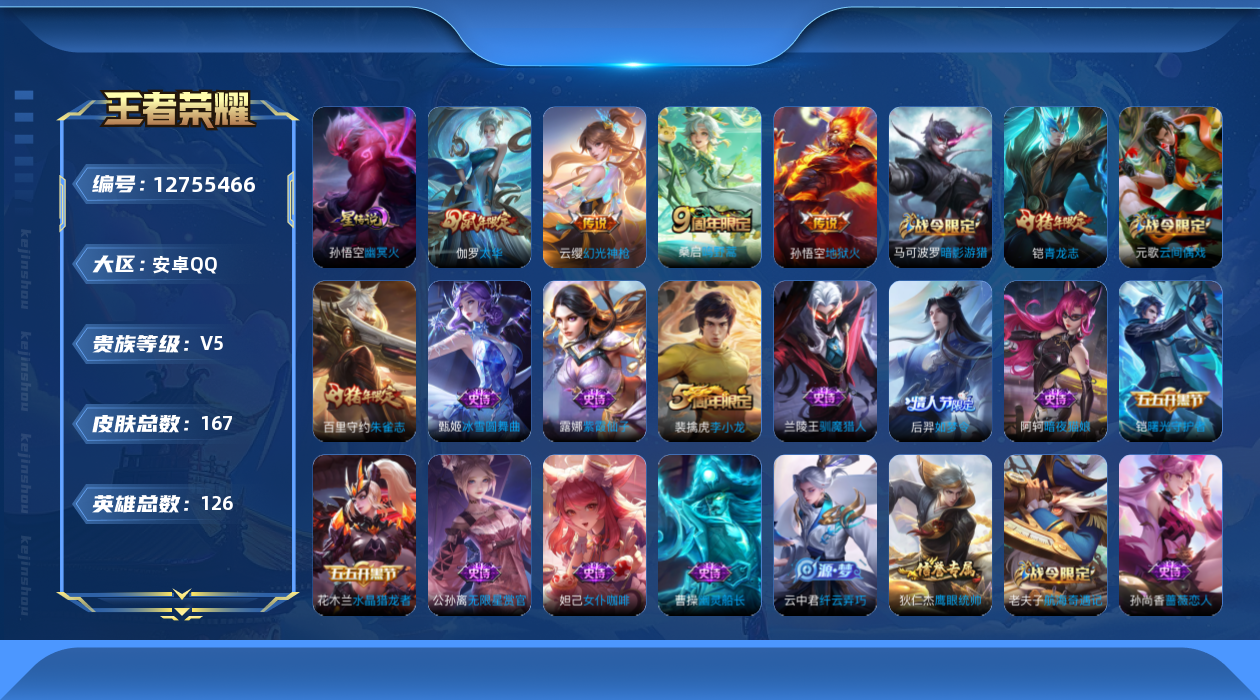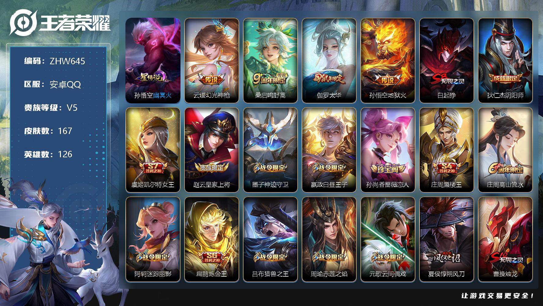 [12755466]【特价急出/详情看图】:安卓Q-V5-永恒钻石I段位-126英雄-167皮肤-4传说-1星元-41史诗