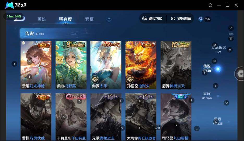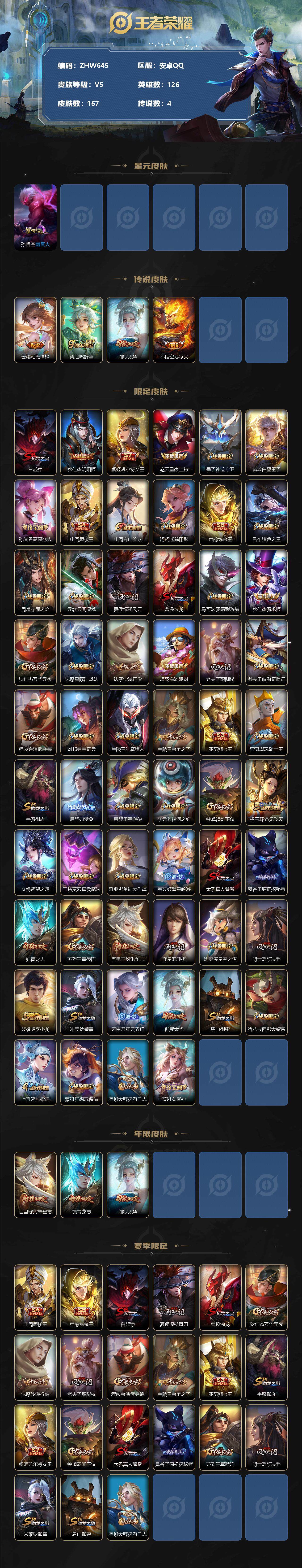 - [11530389]V10 4典藏 4珍品传说 58传说 125英雄 517皮肤 可修改实名 优质装备:鸣剑·曳影,赤影疾锋,弑枪猎影(韩信典藏),拾光映像(瑶典藏),江户川柯南,怪盗基德,朽木白哉,黑崎一护,黄金狮子座,黄金射手座,云鹰飞将(小将军),绛天战甲(鸡嘴战神),黄金白羊座,久胜战神,炽阳神光,一念神魔,末日机甲-孙尚香(绿蚂蚱),仲夏夜之梦(大飞蛾),零号·赤焰,地狱之眼,飞鸢探春,胖达荣荣,李逍遥,乞巧织情,时之恋人-刘备(电焊工),游龙清影(小青龙),超时空战士-狄仁杰,遇见胡旋,末日机甲-孙策,花朝如约(花篮子),无双飞将,山海·炽霜斩(李信年限),山海·苍雷引(电光曜子),浮生妄,百相守梦(张飞),妄想实况,遇见神鼓,澜逐花归海,艾琳觅芳踪 传说皮:乘龙·问璇玑(孙尚香年限),乘龙·淬吴钩(孙策年限),续相思,幻光神枪 珍宝阁皮:妄想食味,优雅恋人,蔷薇恋人,女武神 限定皮:愿照·九州拓(澜年限),愿照·福禄聚(蔡文姬年限),愿照·岁时盈(虞姬年限),愿照·山河定(司空震年限),愿照·众生和(妲己年限),愿照·千秋盛(女娲年限),逐霄战戟,鸣野蒿,至尊宝,白虎志(电光耗子),太华(伽罗年限),梅西,异界灵契(白毛香),傲雪梅枪,补天,寅虎·展翼(孙膑年限),绯月行,白鹤梁神女,时雨天司(水龙头),神威(电光马子),飞衡(韩信年限),无限倾心-项羽,影龙天霄,遇见飞天,高山流水,诗剑行,齐天大圣,五谷丰年,青龙志(铠年限),冰锋战神,武圣,游园惊梦,梁祝,御风骁将(吕布年限),天狼狩猎者,龙胆,逐梦之星,天狼溯光者,逐梦之音,天狼征服者,祈雪灵祝(雪兔子),天狼绘梦者,李小龙,逐梦之影,朱雀志(守约年限),如梦令-嫦娥,如梦令-后羿,霸王别姬-虞姬,圣诞老人,默契交锋-花木兰,真爱至上,纯白花嫁,孙行者,猪悟能,一生所爱,大圣娶亲,引擎之心,青春决赛季,冰霜恋舞曲,乒乒小将,蜜橘之夏,匿光追影者,女儿国国王,寅虎·御盾(廉颇年限),寅虎·瑞焰(虎皮蛋子),寅虎·心曲(虎婆),寅虎·赤拳(老虎年限),时之祈愿-云中君,时之祈愿-瑶(瑶传限),百木心枪,玉兔公主,山海·玄木吟(马可年限),冰霜神祇 史诗皮:鸭鸭历险记-刘禅,苍鳞隐世,器灵·浮梦炉,糖绘人间,狼魂孤将,绮世丹青,瑰影绮梦,化蝶舞,星界特工,星界战将,灵蛊蚀心,龙之律动,雪豹·霜爪,石田雨龙,茶境仙,海