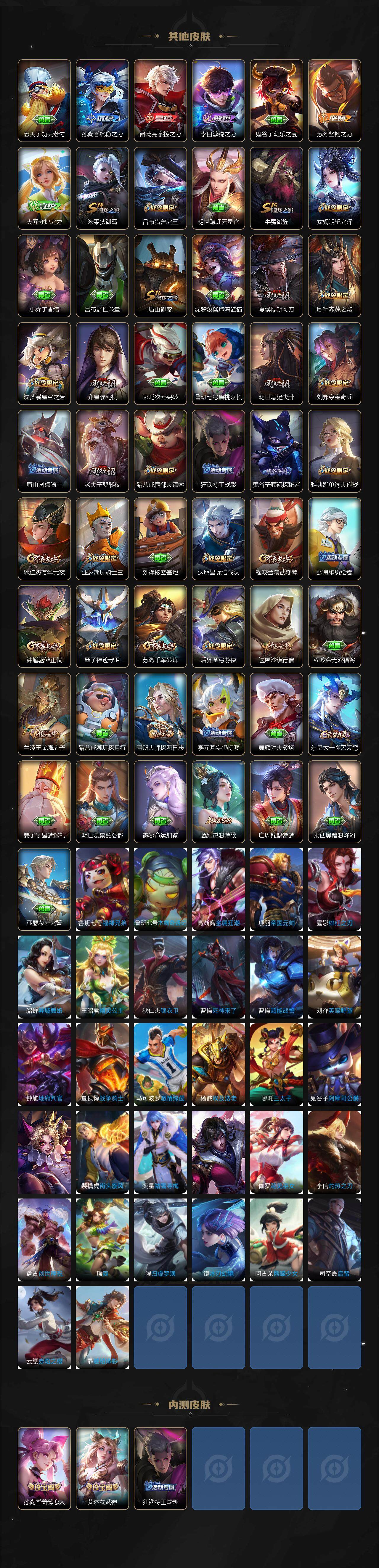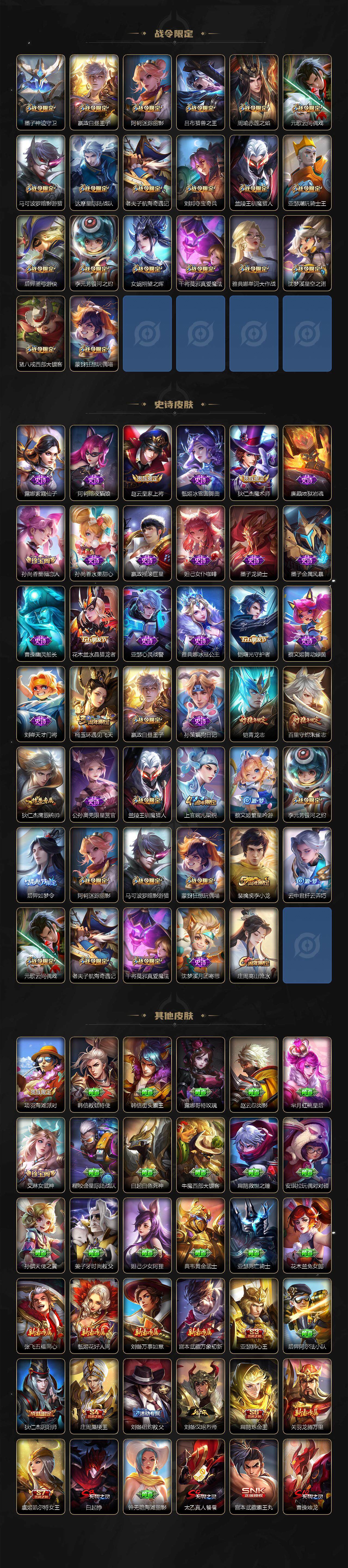 【限定皮肤】:白起狰,狄仁杰阴阳师,虞姬凯尔特女王,赵云皇家上将,墨子神迹守卫,嬴政白昼王子,孙尚香蔷薇恋人,庄周蜃楼王,庄周高山流水,阿轲迷踪丽影,扁鹊炼金王,吕布猎兽之王,周瑜赤莲之焰,元歌云间偶戏,夏侯惇朔风刀,曹操烛龙,马可波罗暗影游猎,狄仁杰魔术师,狄仁杰万华元夜,达摩星际陆战队,达摩沙漠行僧,项羽海滩派对,老夫子醍醐杖,老夫子航海奇遇记,程咬金演武夺筹,刘邦夺宝奇兵,兰陵王驯魔猎人,兰陵王金庭之子,亚瑟狮心王,亚瑟潮玩骑士王,牛魔御旌,后羿如梦令,后羿圣弓游侠,李元芳银河之约,钟馗驱傩正仪,杨玉环遇见飞天,女娲朔望之晖,干将莫邪真爱魔法,雅典娜单词大作战,蔡文姬繁星吟游,太乙真人饕餮,鬼谷子原初探秘者,铠青龙志,苏烈千军破阵,百里守约朱雀志,弈星混沌棋,沈梦溪星空之诺,明世隐疑决卦,裴擒虎李小龙,米莱狄御霄,云中君纤云弄巧,伽罗太华,盾山御銮,猪八戒西部大镖客,上官婉儿梁祝,蒙犽狂想玩偶喵,鲁班大师探海日志,艾琳女武神