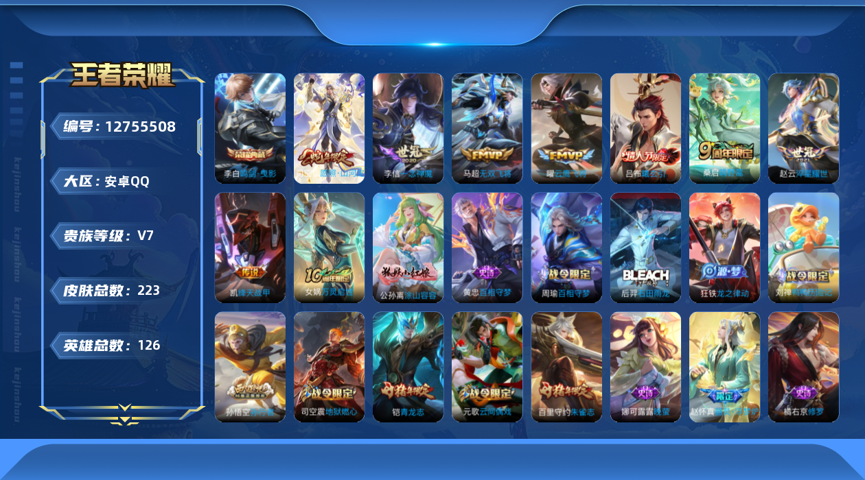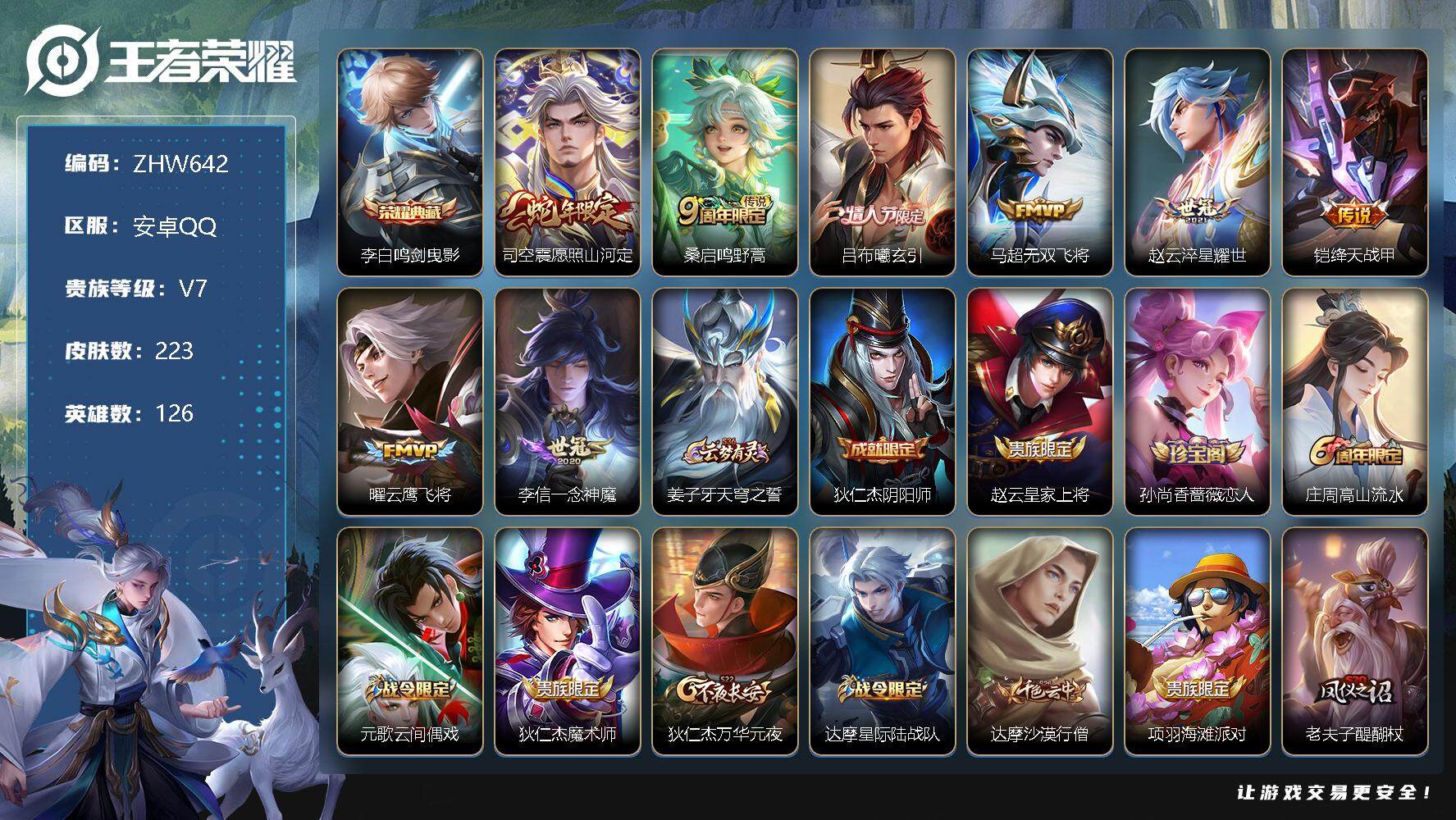 [12755508]安卓Q-V7-至尊星耀II段位-126英雄-223皮肤-1典藏-8传说-65史诗