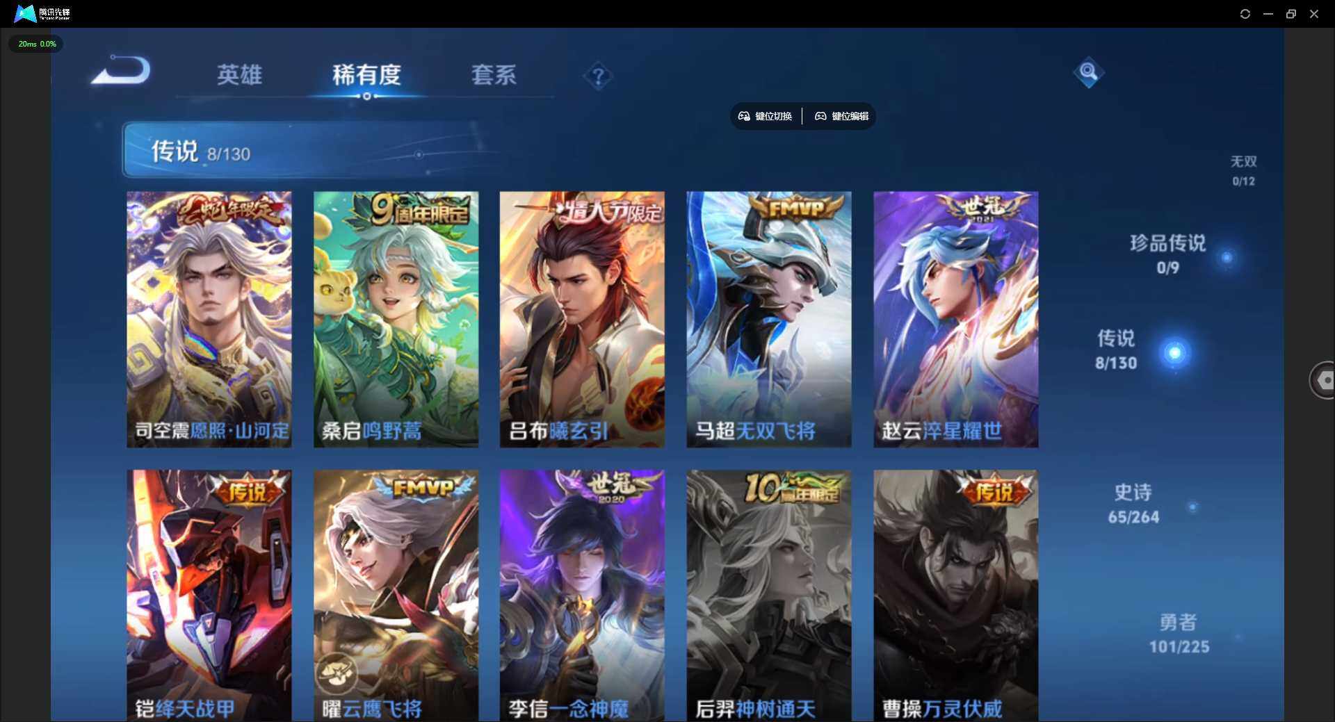 【传说皮肤】:司空震愿照山河定,桑启鸣野蒿,吕布曦玄引,马超无双飞将,赵云淬星耀世,铠绛天战甲,曜云鹰飞将,李信一念神魔