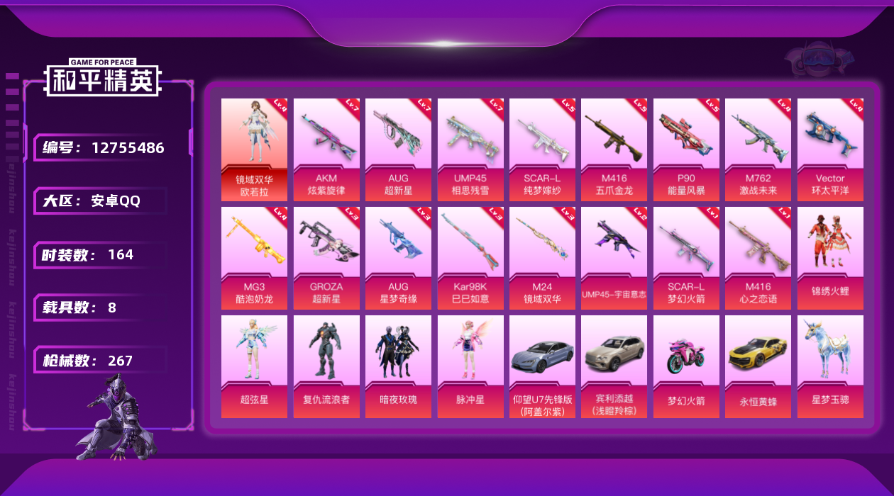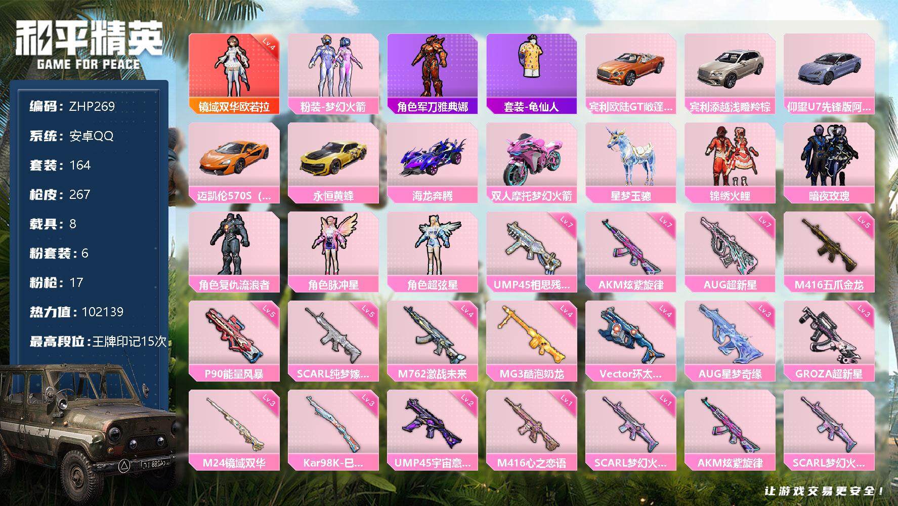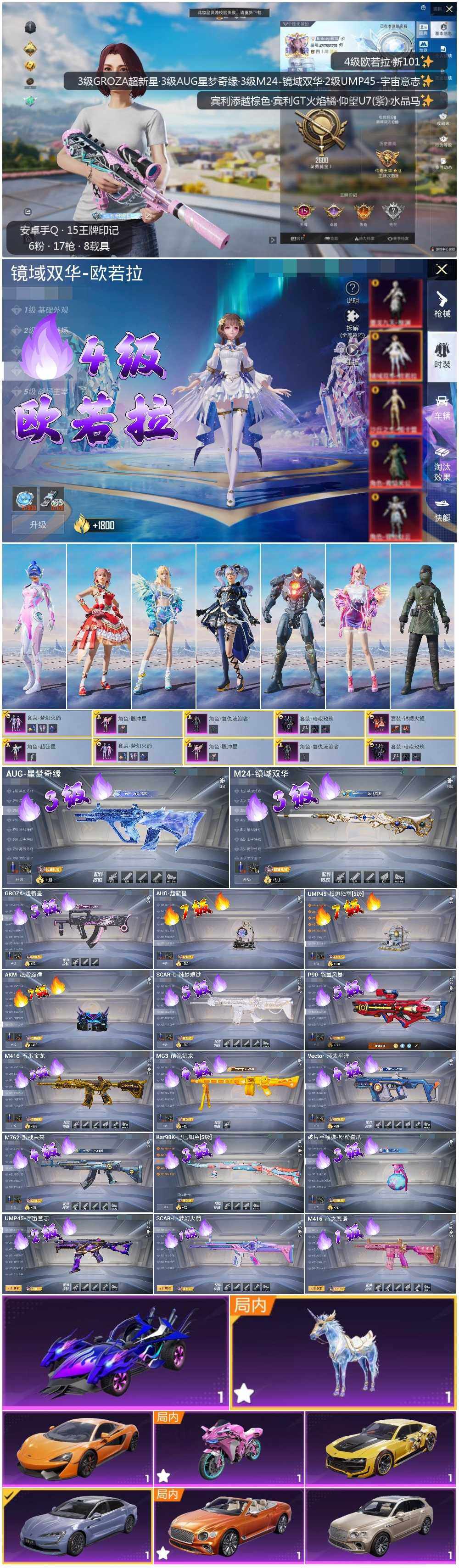[12755486]素材身法号/镜域双华-欧若拉(四级)/地铁满天赋 安卓 手Q-1神装-6粉装-17特效枪-8载具-6粉色飞行器-10.2w热力值-15王牌印记-164套装-267枪皮【红色神装等级】:镜域双华-欧若拉(四级)【热门品类】:粉装-梦幻火箭,角色-军刀雅典娜,套装-龟仙人【粉色载具】:宾利欧陆GT敞篷(火焰橘),宾利添越(浅瞪羚棕),仰望U7(阿盖尔紫),迈凯伦570S(旭日黄),永恒黄蜂,海龙奔腾,双人摩托-梦幻火箭,星梦玉骢【粉色套装】:粉装-梦幻火箭,粉装-锦绣火鲤,粉装-暗夜玫瑰,角色-复仇流浪者,角色-脉冲星,角色-超弦星【粉色枪皮等级】:AKM-炫紫旋律(七级),SCAR-L-梦幻火箭(一级),SCAR-L-纯梦嫁纱(五级),M416-五爪金龙(五级),M416-心之恋语(一级),GROZA-超新星(三级),AUG-超新星(七级),AUG-星梦奇缘(三级),M762-激战未来(四级),UMP45-相思残雪(七级),UMP45-宇宙意志(二级),Vector-环太平洋(四级),P90-能量风暴(五级),Kar98K-巳巳如意(三级),M24-镜域双华(三级),MG3-酷泡奶龙(四级)【粉色飞行器】:梦幻火箭飞行器,梦之光华飞行器,沙丘之主天马,镜域双华-灵镜之阶,星梦奇缘飞行器,深渊漩涡飞行器
